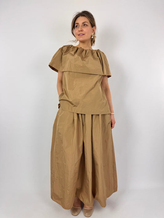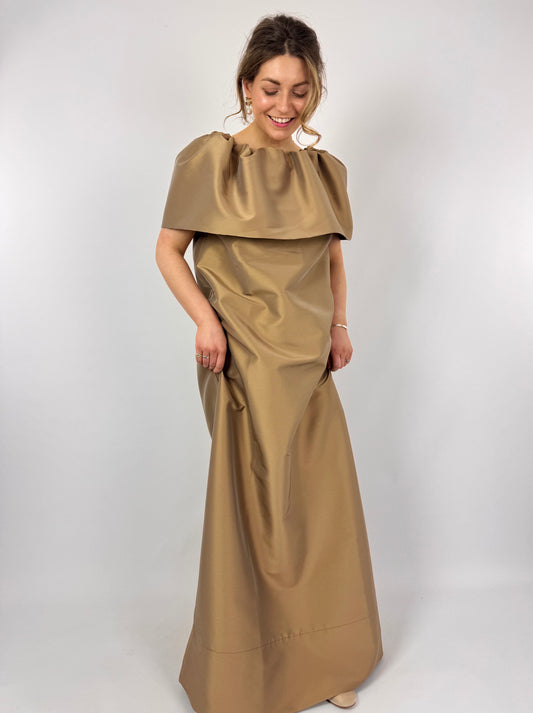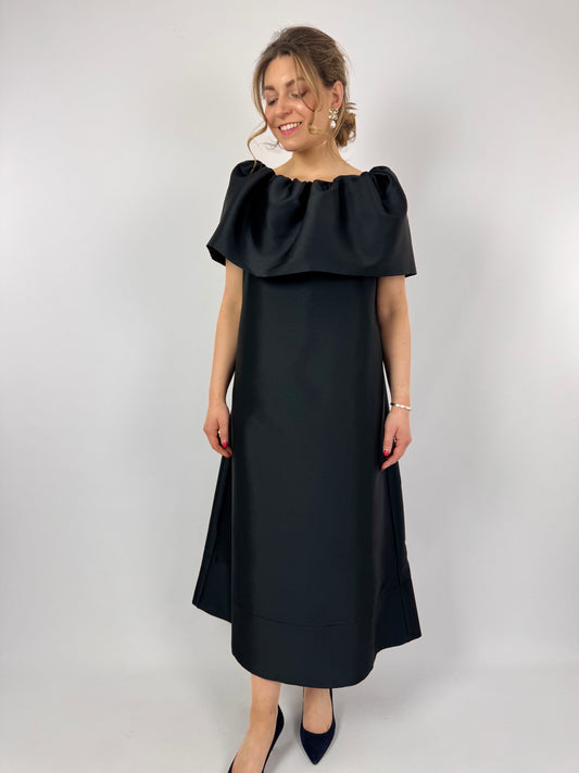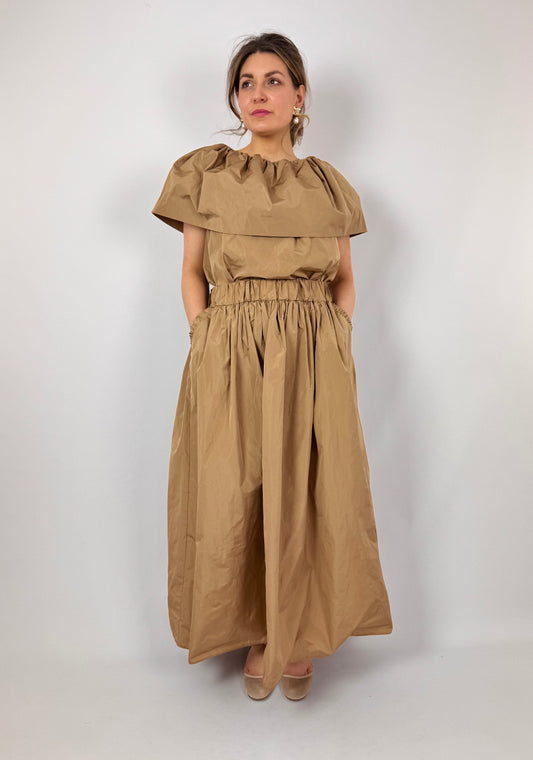 Both Roisin Linnane dresses make a statement, exuding refined grace with a touch of carefree summer spirit. The high ruffled neckline and delicate tie-back add a romantic flair, while the sleeveless design allows for freedom and ease.