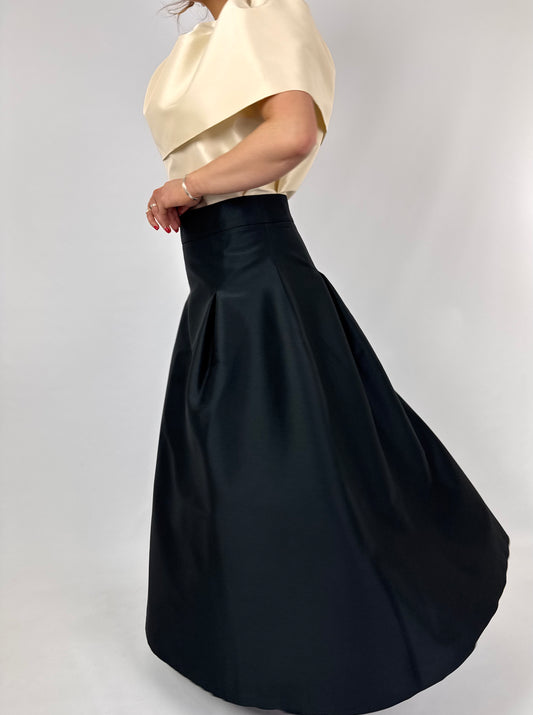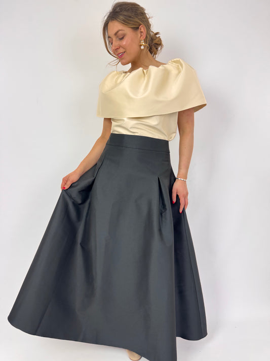 With one dress in subtle pink and the other in black, both Roisin Linnane dresses are made from a luxurious fabric with a sheen that catches the light, adding iridescence to these stunning pieces.