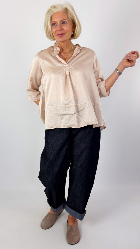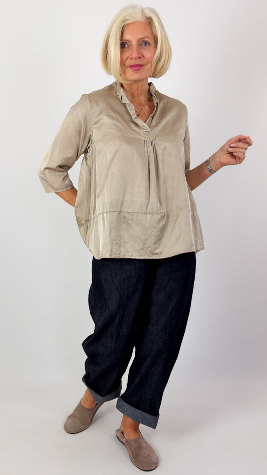 Sula Clothing garments are crafted from the finest fabrics, often hand-woven. Mainstays include peace silk, khadi cotton, and washed Irish linen. Hand-finished details such as quilting, embroidery, and tea dyeing are Sula's signature.