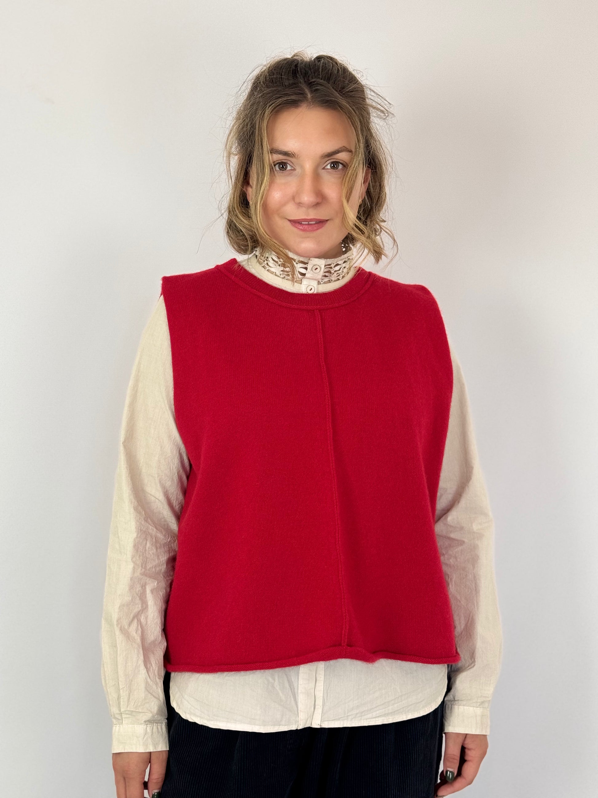 Crafted in a fine stitch with centre seam detailing and rolled edging, this relaxed boxy sleeveless jumper offers effortless layering with a lightweight, buttery-soft feel. Made using Re-Verso yarn, which repurposes post-consumer cashmere waste and is expertly blended and re-spun by Italian spinners, it embodies sustainable luxury. Hand-finished on a fine gauge machine in Sussex, the vest boasts a graceful drape and exceptional softness, making it a refined wardrobe essential for conscious, expert dressing.