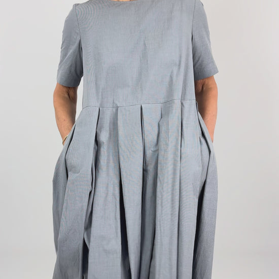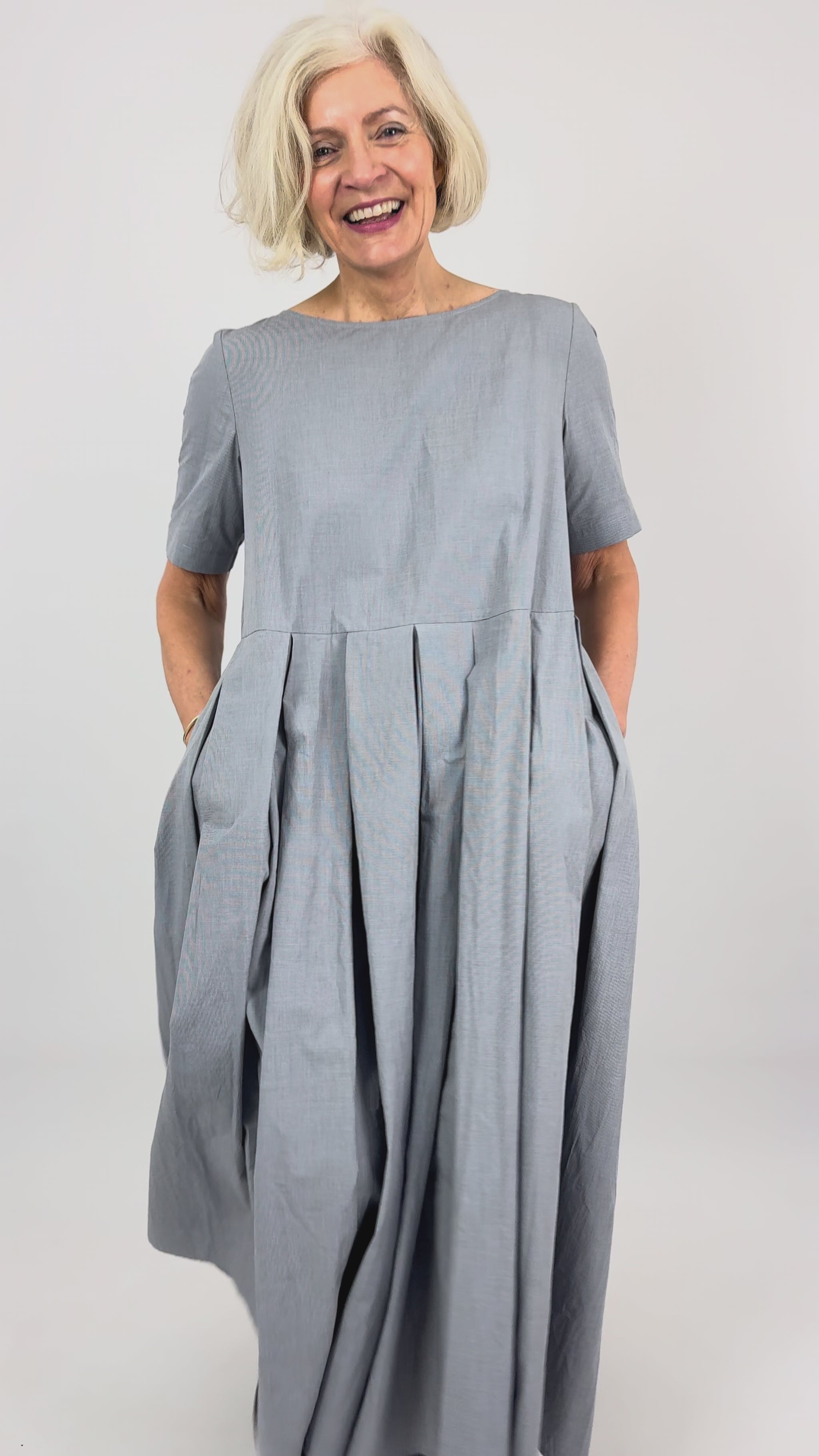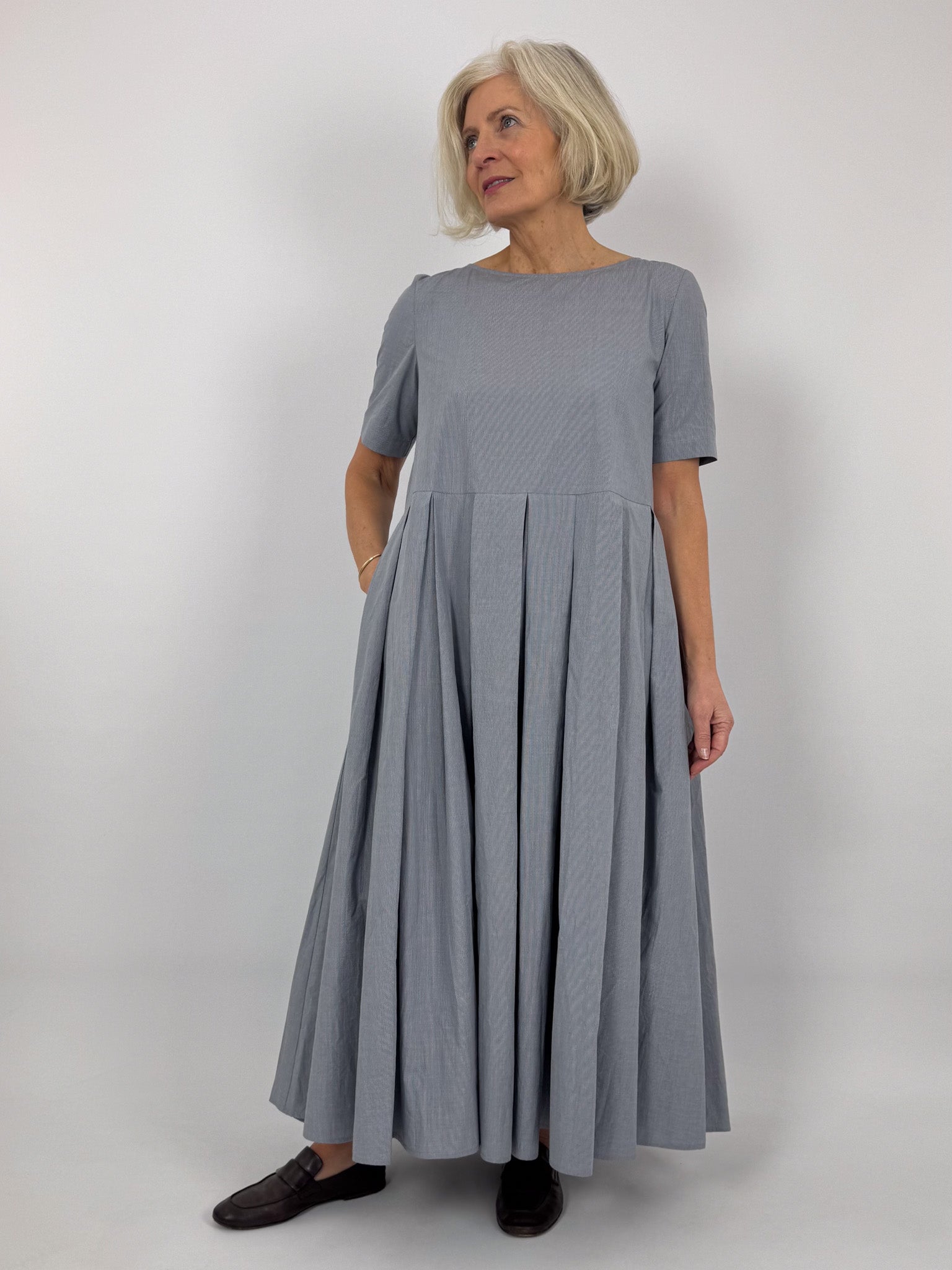 Effortlessly elegant, this oversized cotton dress combines timeless style with practical comfort. The crisp fabric drapes beautifully in an understated small check print, while the boat neckline offers a refined silhouette. A pleated waistline creates a graceful, full skirt that moves with ease, and side seam pockets provide everyday functionality. Perfect for transitional dressing, from casual outings to relaxed professional settings.