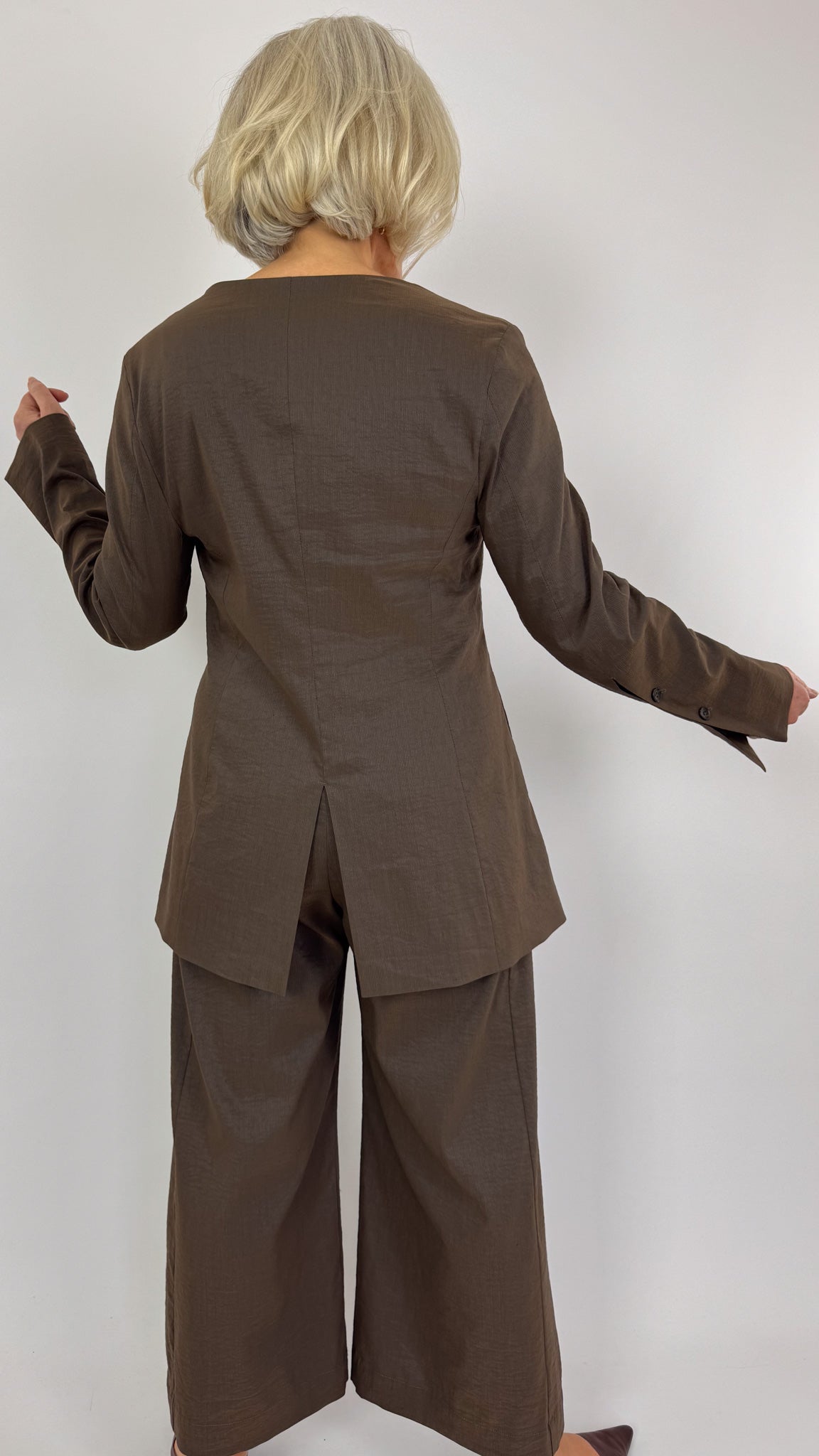 Crafted from a luxurious stretch linen and cotton blend, this expertly tailored jacket delivers refined elegance with its fitted silhouette and elongated length. The minimalist collarless neckline and single button fastening create a contemporary aesthetic, while the precision tailoring ensures a flattering fit. Pair with the matching trousers to complete a sophisticated, understated suit that exudes modern luxury and effortless style.