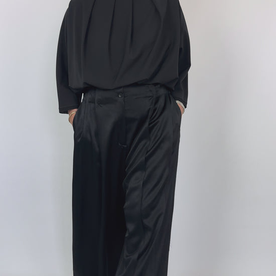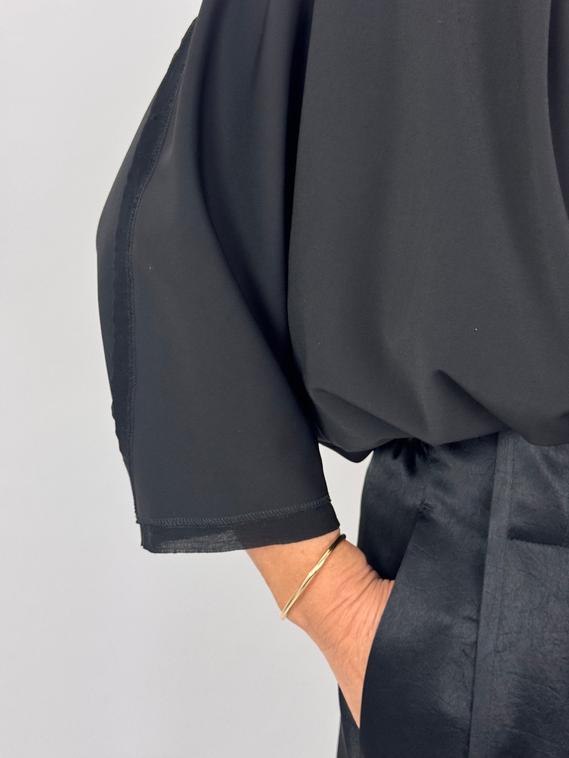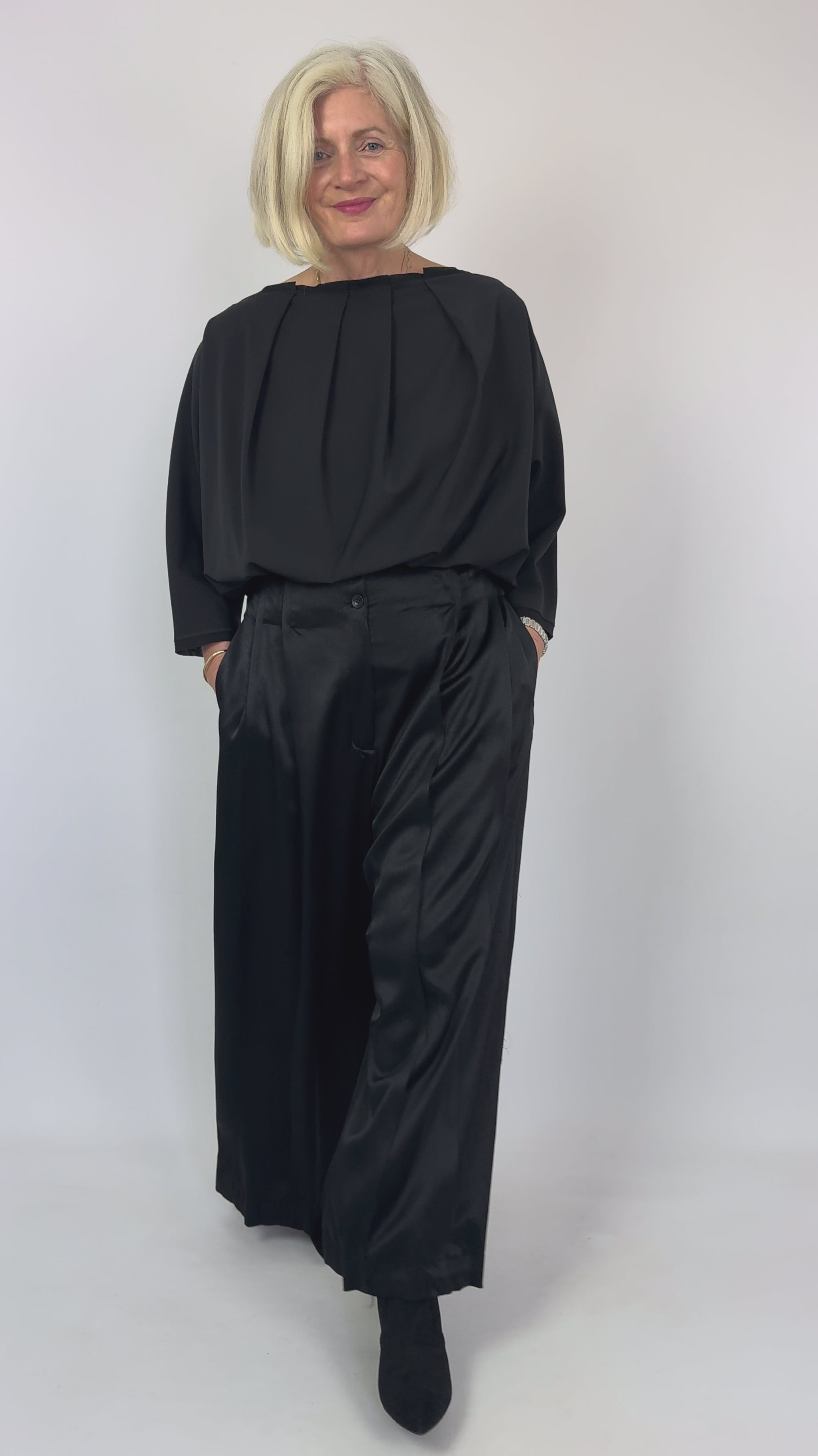 The Annette Görtz Freya Blouse in black exemplifies contemporary elegance with its cropped silhouette and refined boat neckline. Distinctive pleated detailing adds textural interest, whilst an elasticated drawstring at the hem allows you to adjust the fit and create a subtle bubble effect for a modern look. Finished with a delicate black fabric trim, this piece transitions effortlessly from day to evening wear, making it an essential addition to any sophisticated wardrobe.