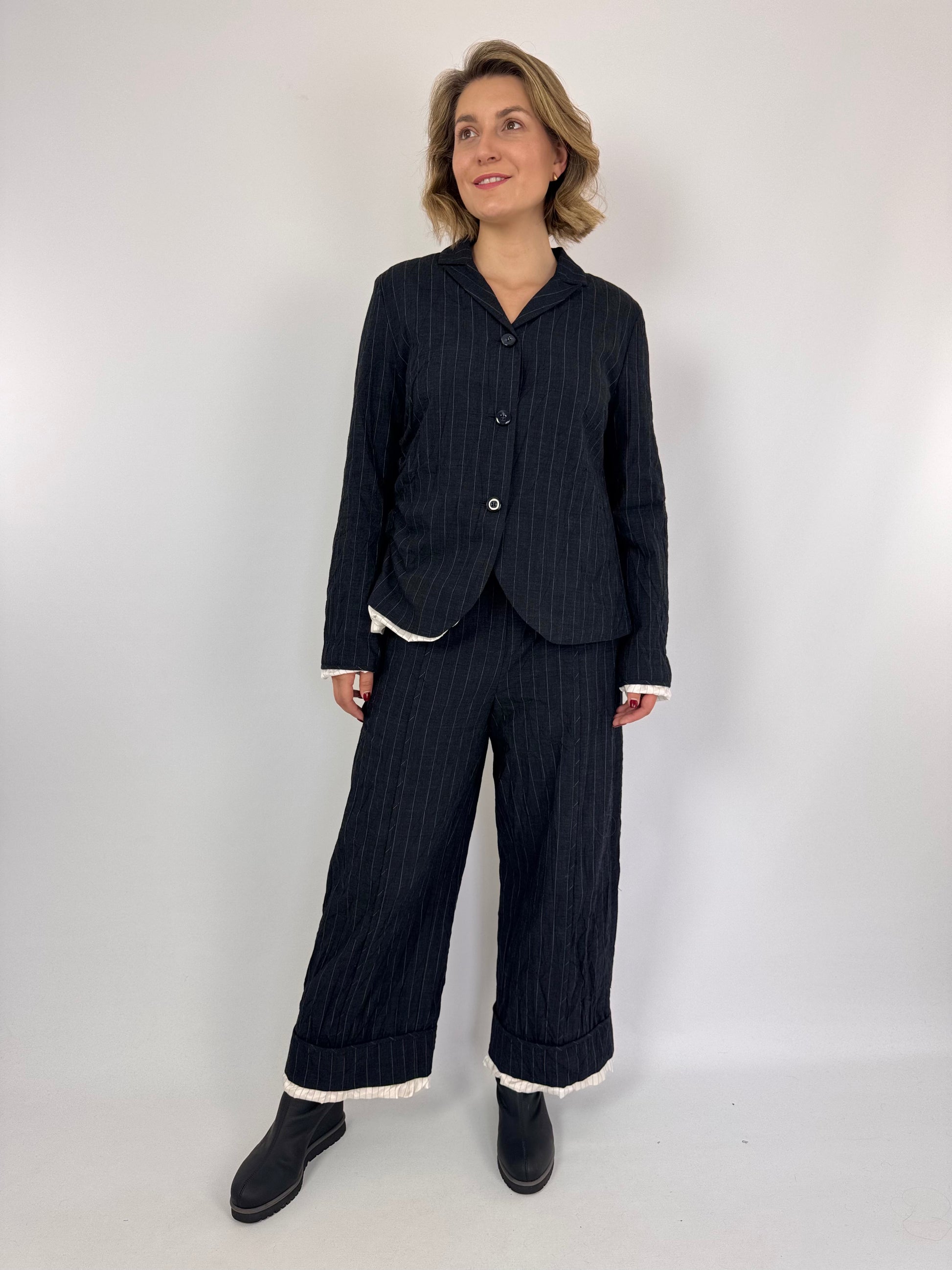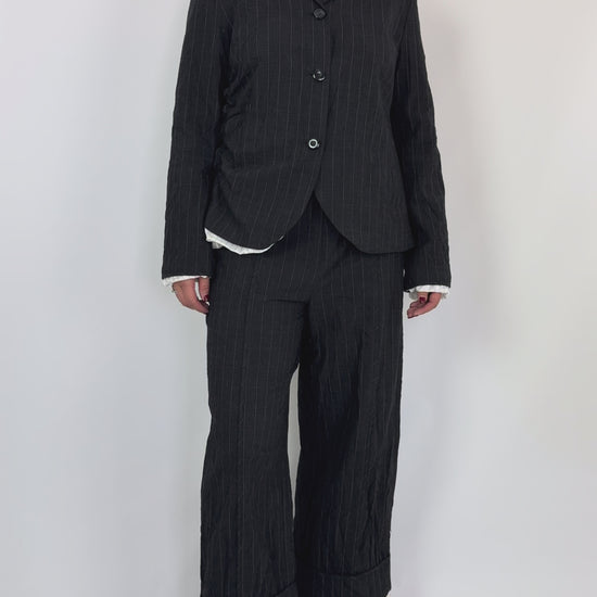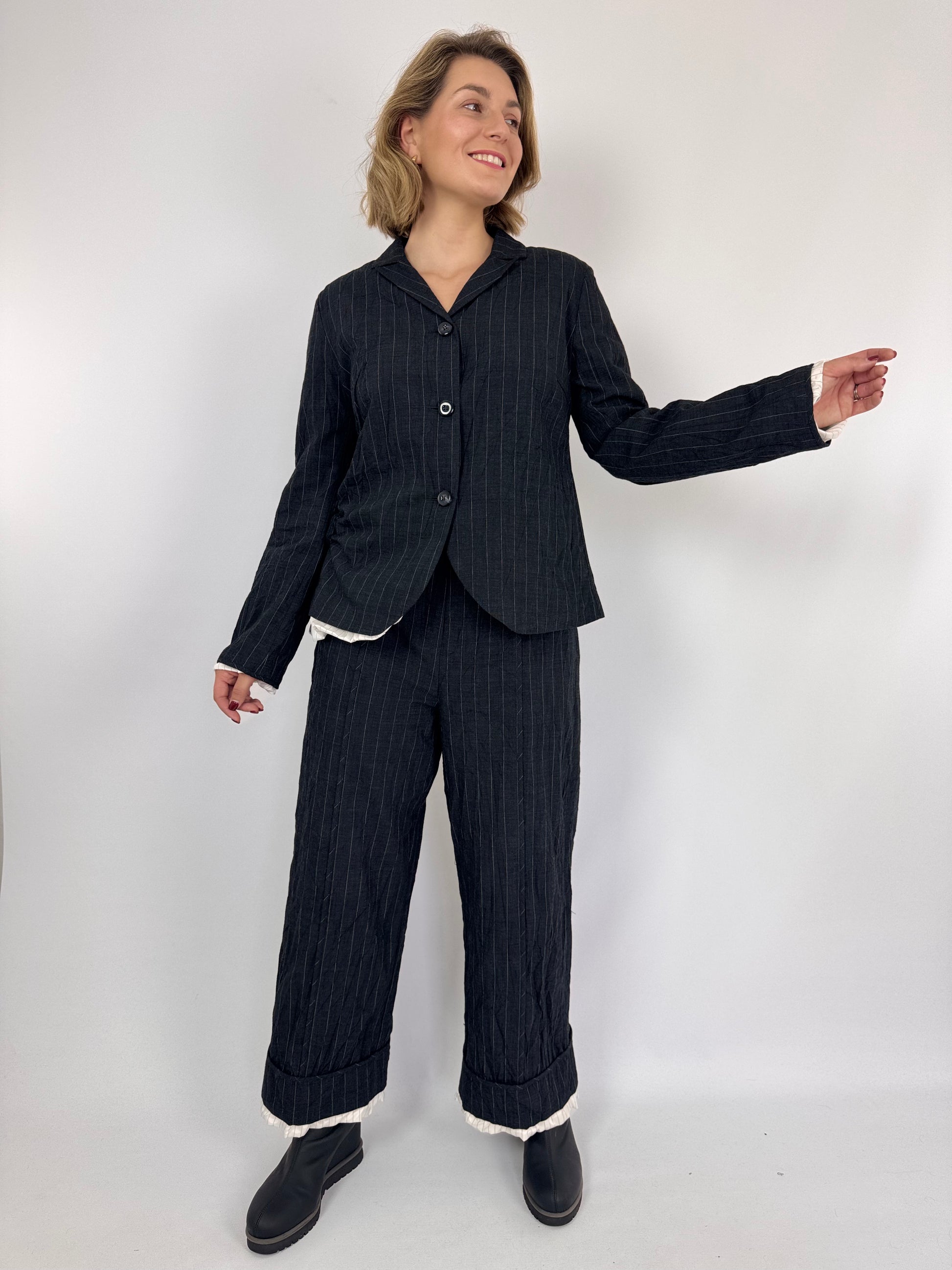 Designed with a sophisticated blend of cotton and wool, the Annette Gortz Spok Trousers in Anthrazite feature a wide straight leg silhouette that balances comfort with contemporary style. The black fabric is accented by subtle white pinstripes and a striped lining that peeks out delicately at the hem, adding refined detail. Equipped with wide pockets and a button fastening, these trousers offer both functionality and elegance. Elevate your autumn wardrobe by pairing them with the matching jacket for a polished, chic suit ensemble.
