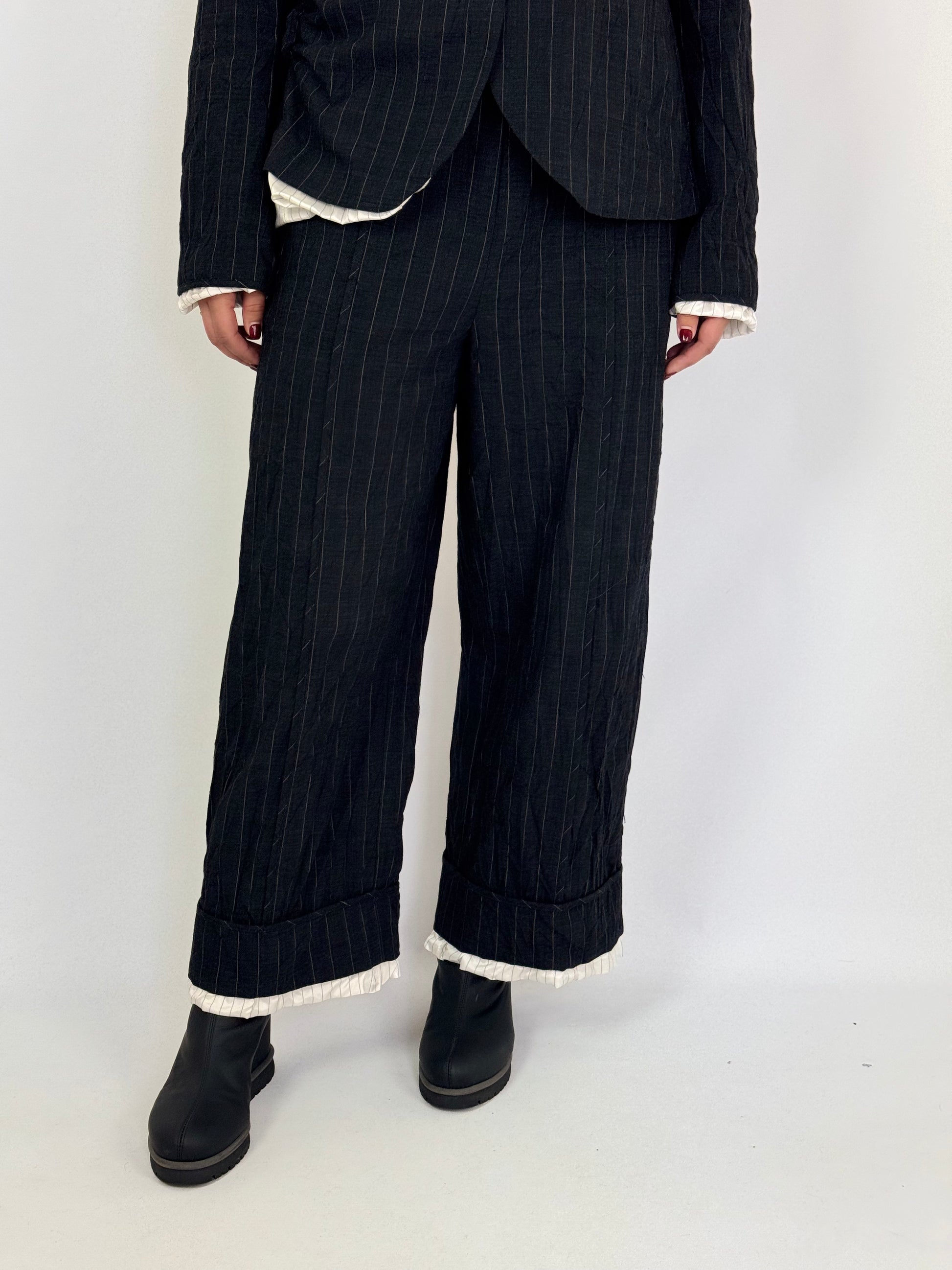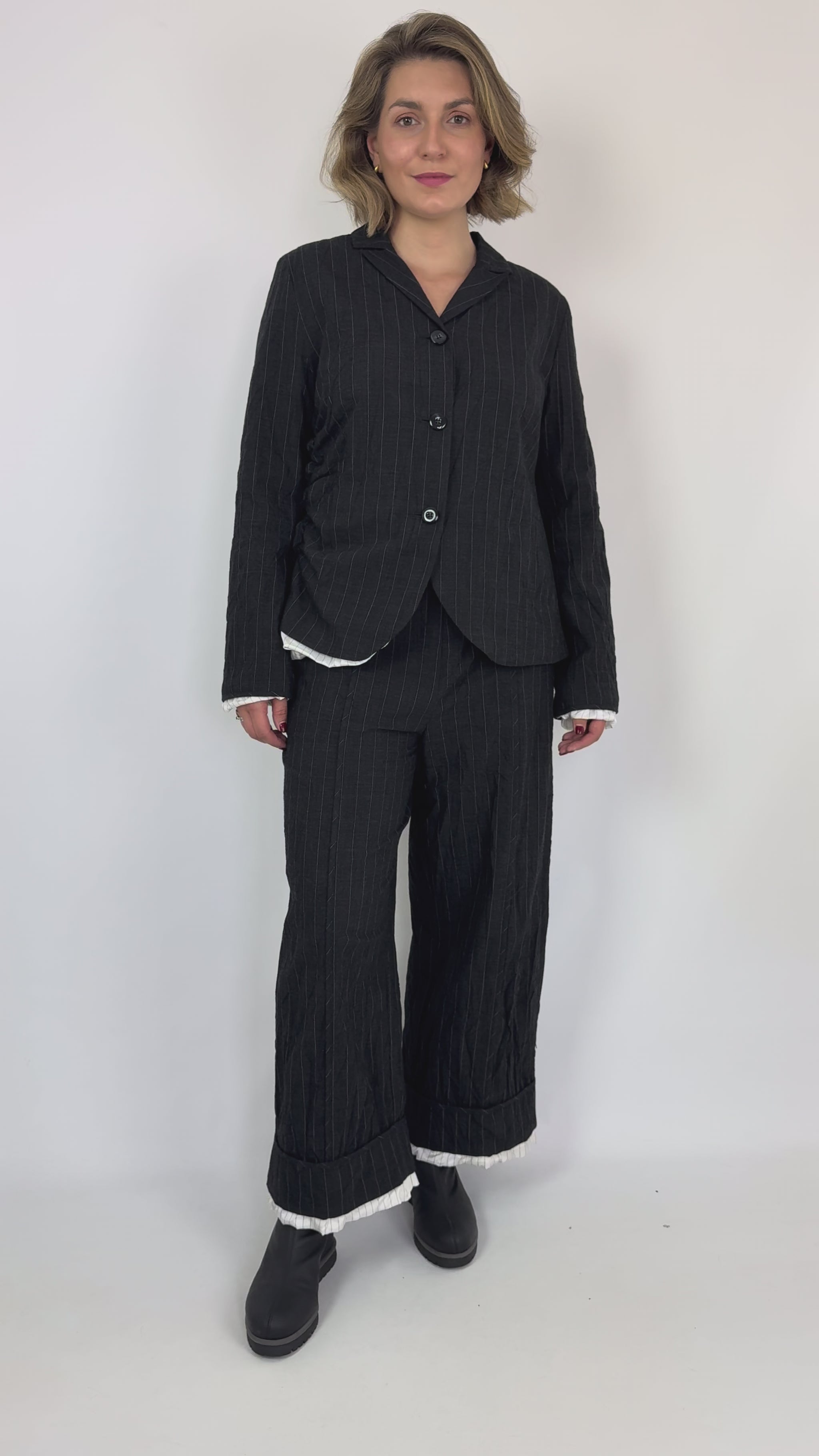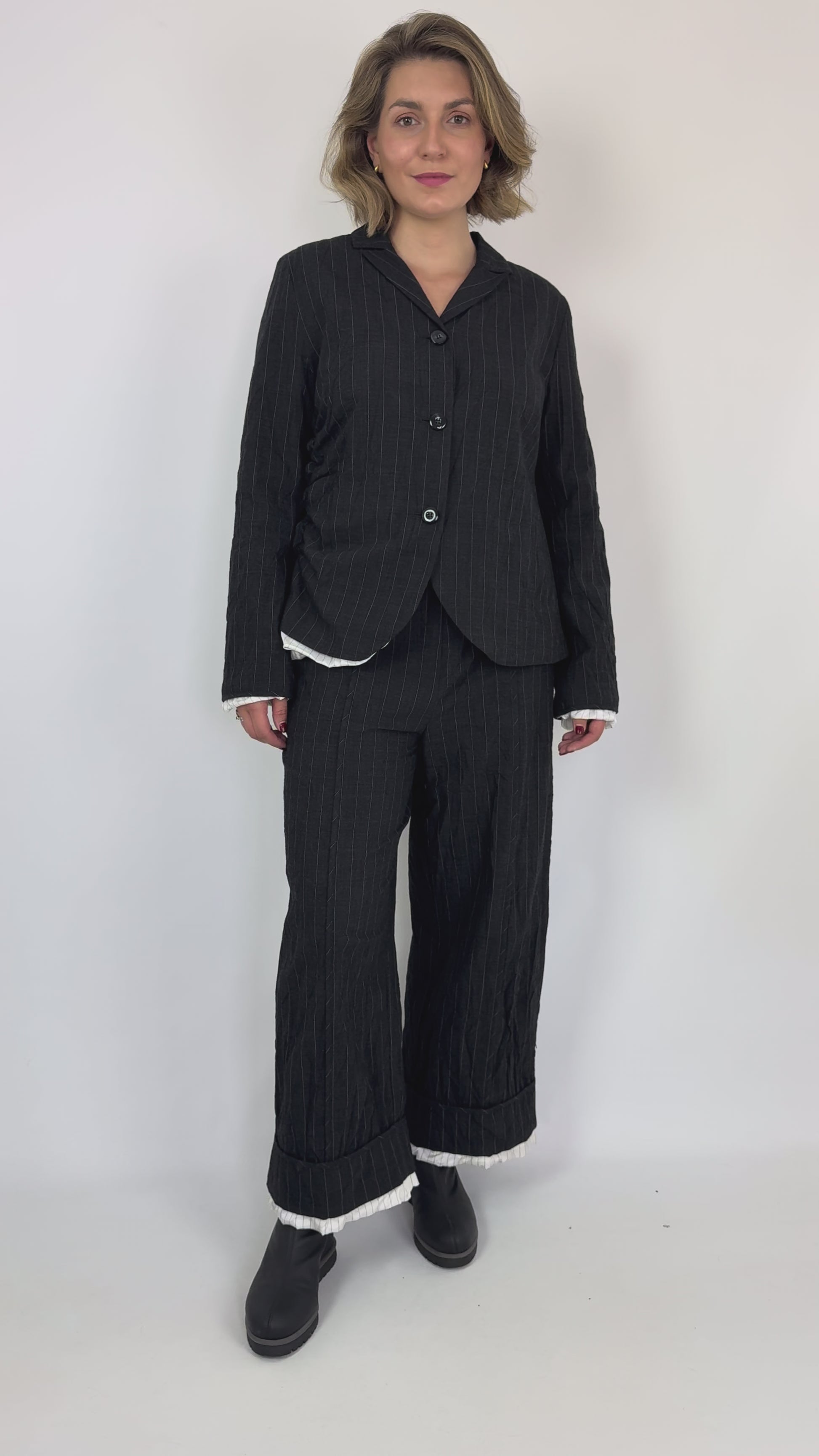 Designed with a sophisticated blend of cotton and wool, the Annette Gortz Spok Trousers in Anthrazite feature a wide straight leg silhouette that balances comfort with contemporary style. The black fabric is accented by subtle white pinstripes and a striped lining that peeks out delicately at the hem, adding refined detail. Equipped with wide pockets and a button fastening, these trousers offer both functionality and elegance. Elevate your autumn wardrobe by pairing them with the matching jacket for a polished, chic suit ensemble.