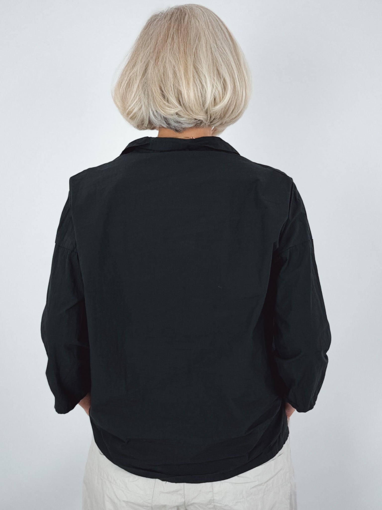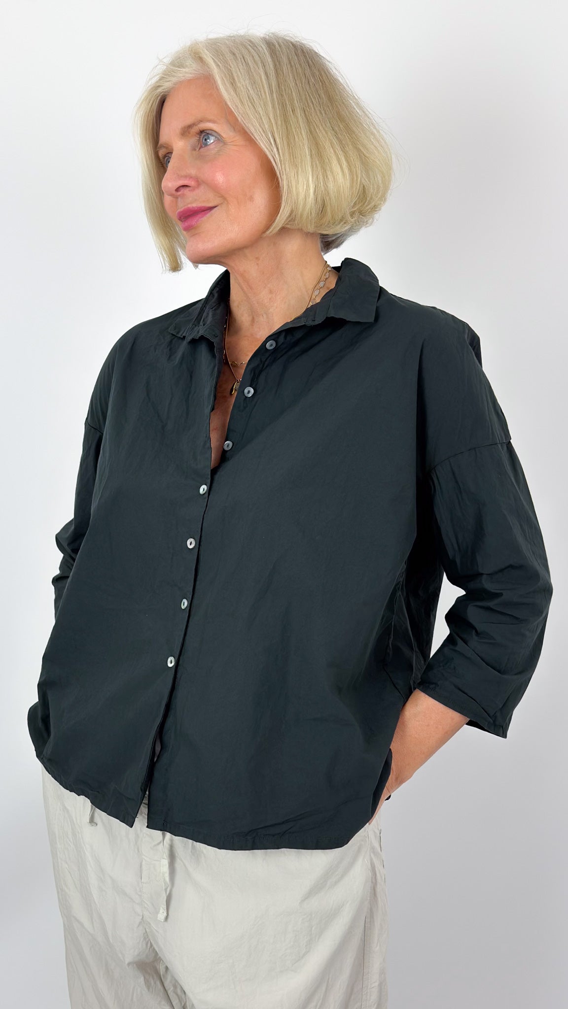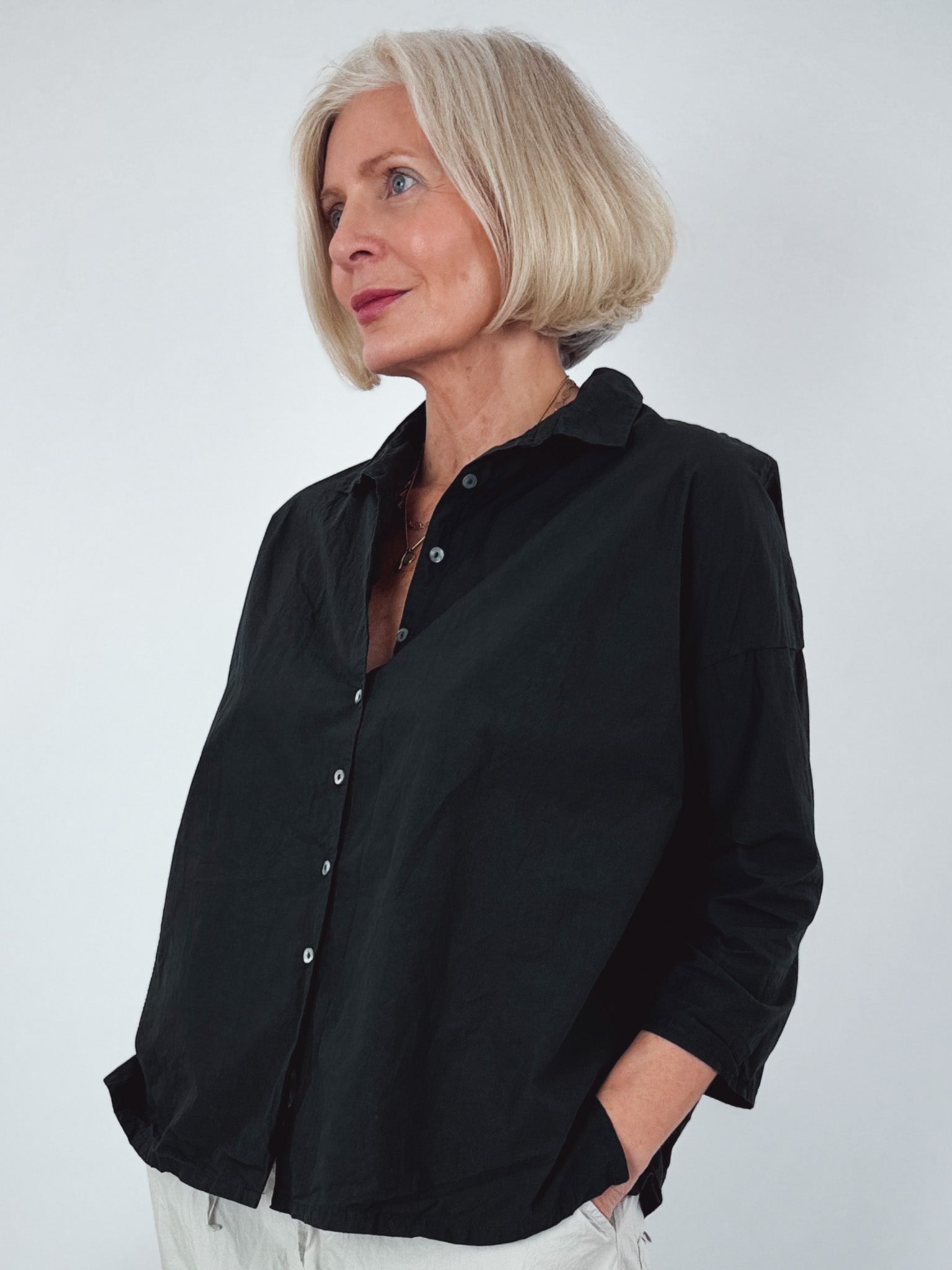 The Album 12_56 TC Shirt in Black showcases the brand's signature lightweight crinkle cotton construction, engineered for effortless comfort and movement. This bestselling style features a refined small collar, drop shoulder seams for a relaxed silhouette, and three-quarter length sleeves that offer versatile layering potential. The textured fabric develops character with wear while maintaining its breathable qualities, making it an essential piece for those who value both craftsmanship and understated elegance.