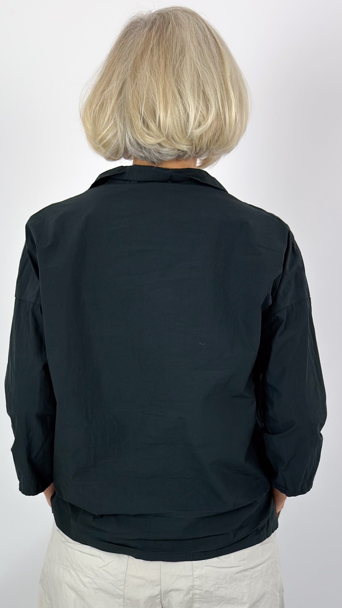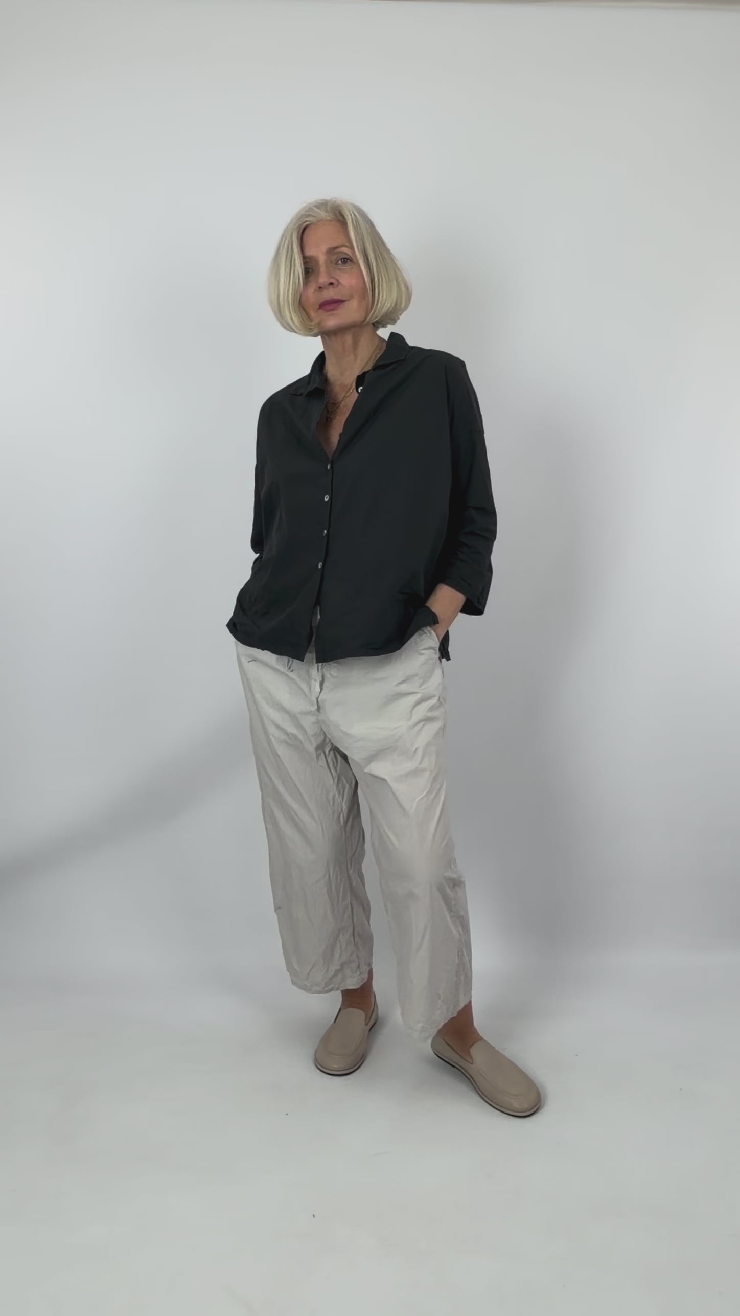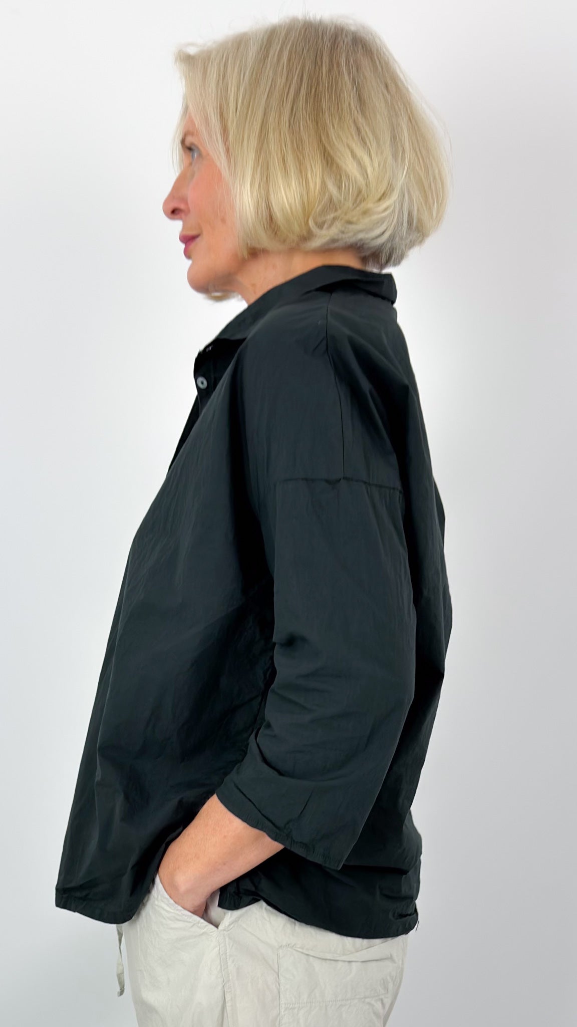 The Album 12_56 TC Shirt in Black showcases the brand's signature lightweight crinkle cotton construction, engineered for effortless comfort and movement. This bestselling style features a refined small collar, drop shoulder seams for a relaxed silhouette, and three-quarter length sleeves that offer versatile layering potential. The textured fabric develops character with wear while maintaining its breathable qualities, making it an essential piece for those who value both craftsmanship and understated elegance.