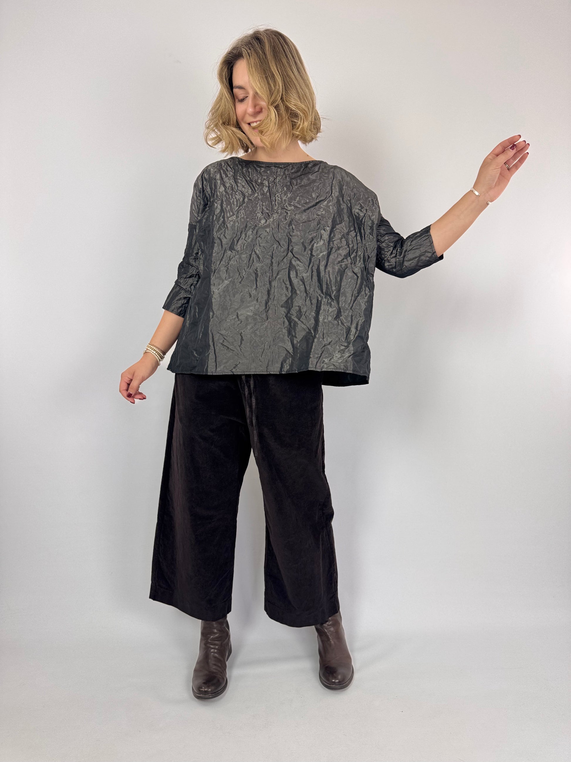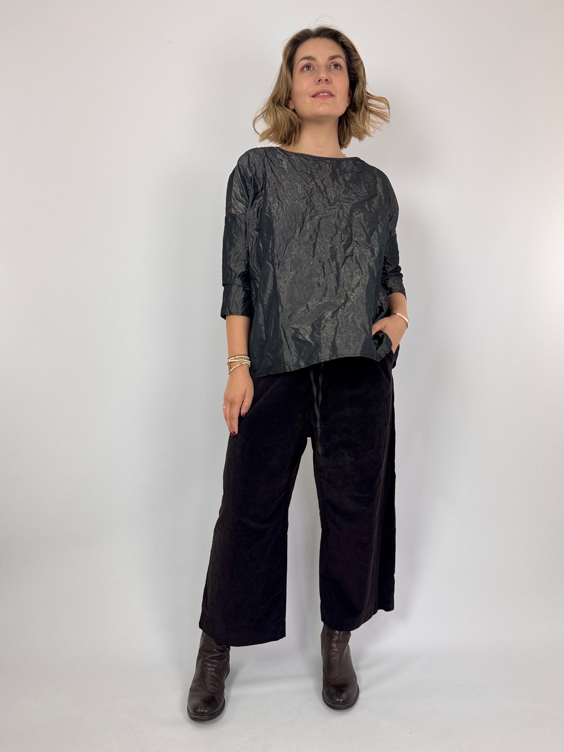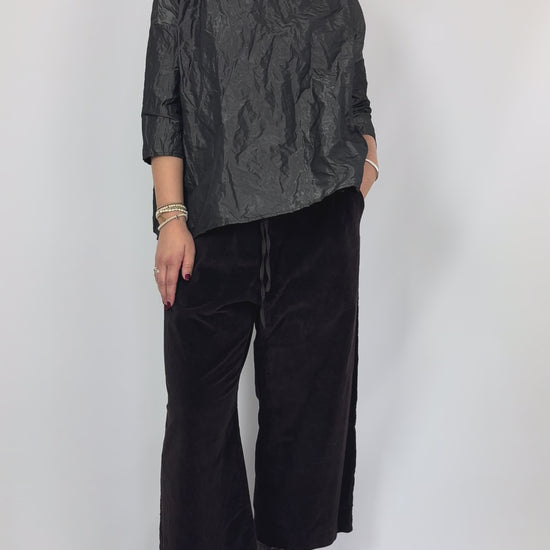 These Album di Famiglia 206 W&S V Trousers in Choco feature a wide, cropped silhouette crafted from stretch cotton velvet for comfort and luxury. Designed with a wide elasticated waistband and drawstring, they offer an adjustable fit. Practical pockets add functionality, making these trousers an elegant yet relaxed choice for sophisticated casual wear. These trousers are not as full as the Bragoni style.