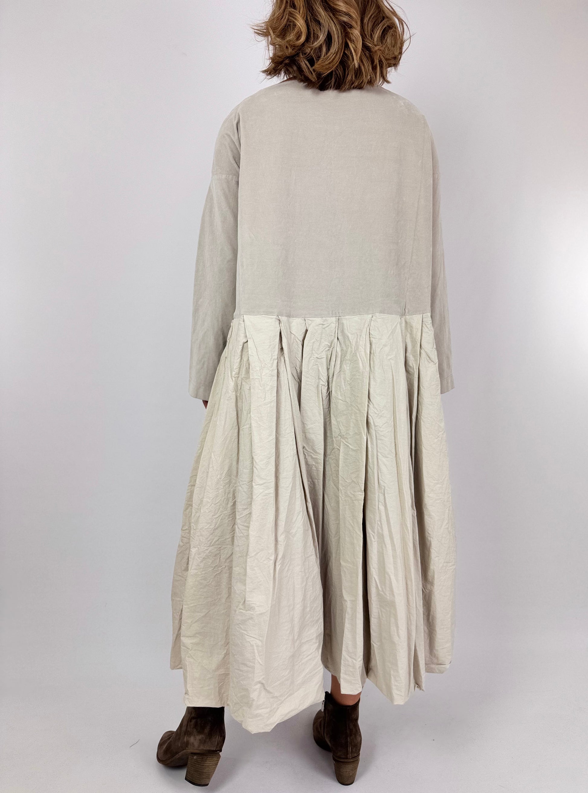 The Album di Famiglia 236 Dress Oatmeal combines plush velvet and crisp cotton for a sophisticated silhouette. Featuring an oversized, wide shape with a graceful wide round neckline, the top half’s velvet adds a rich texture, while the voluminous, pleated skirt crafted from cotton enhances movement and structure. Practical side seam pockets complete this elegant design, marrying refined style with everyday functionality.