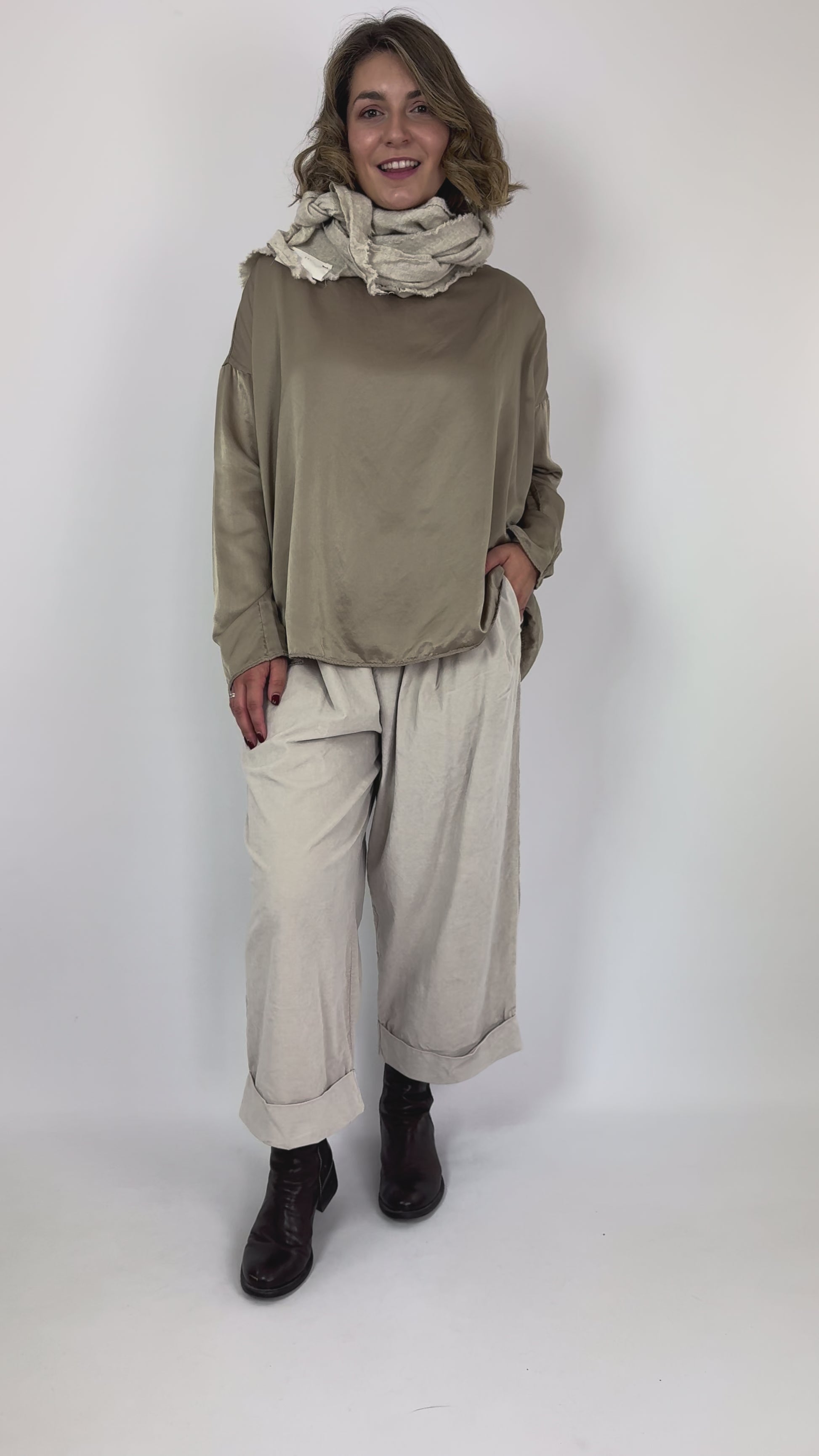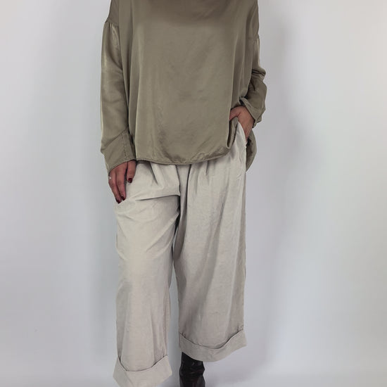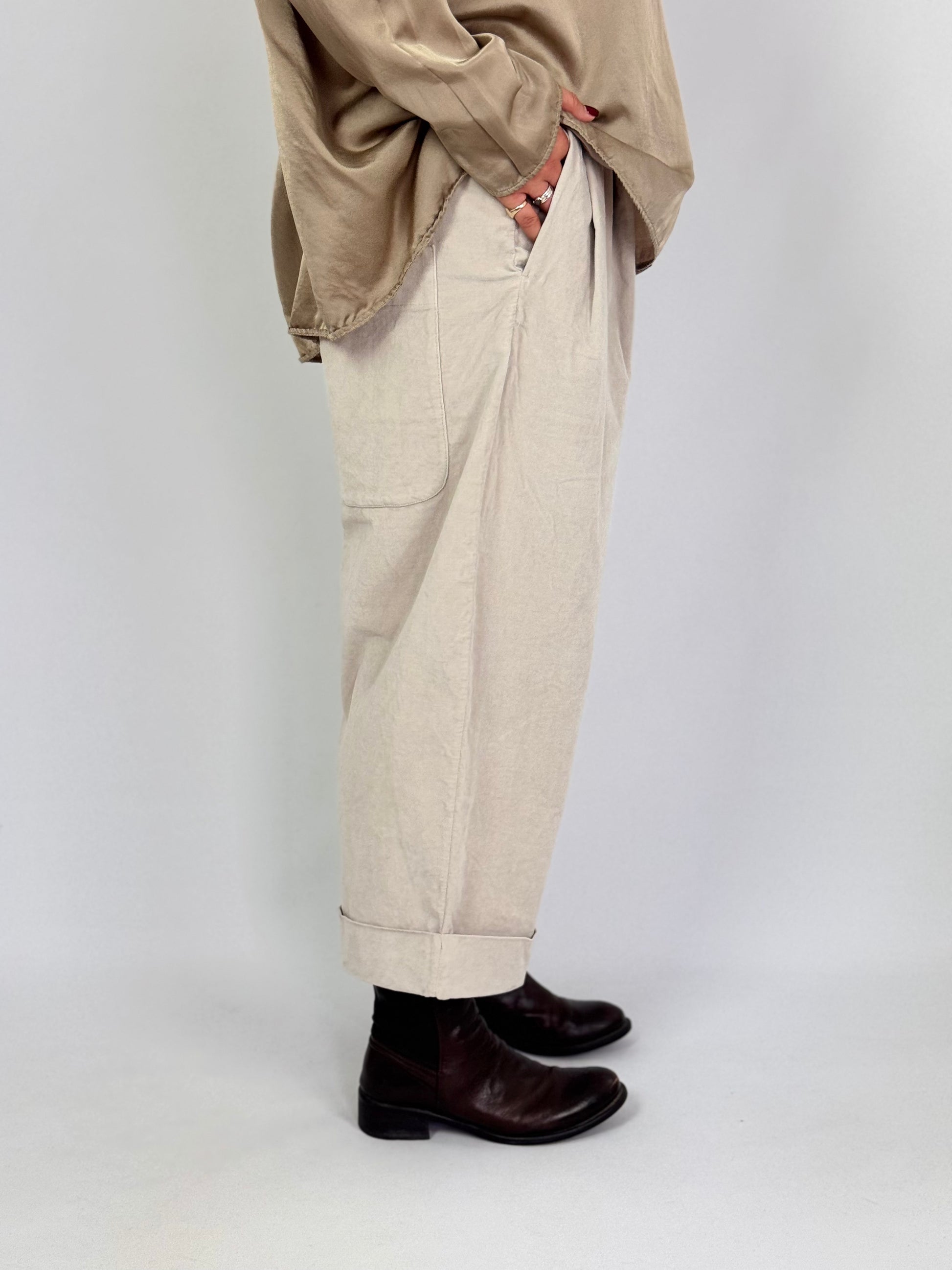 These Album di Famiglia 2391 Bragoni V Trousers in Oatmeal offer a refined take on casual elegance. Crafted from stretch cotton velvet, they provide comfort and a subtle sheen. The wide-leg design with a cropped length and turn-up hem creates a modern silhouette, while the wide elasticated waistband with drawstring ensures a tailored fit. Practical pockets add functionality without compromising style. Ideal for those seeking effortless sophistication with everyday ease.