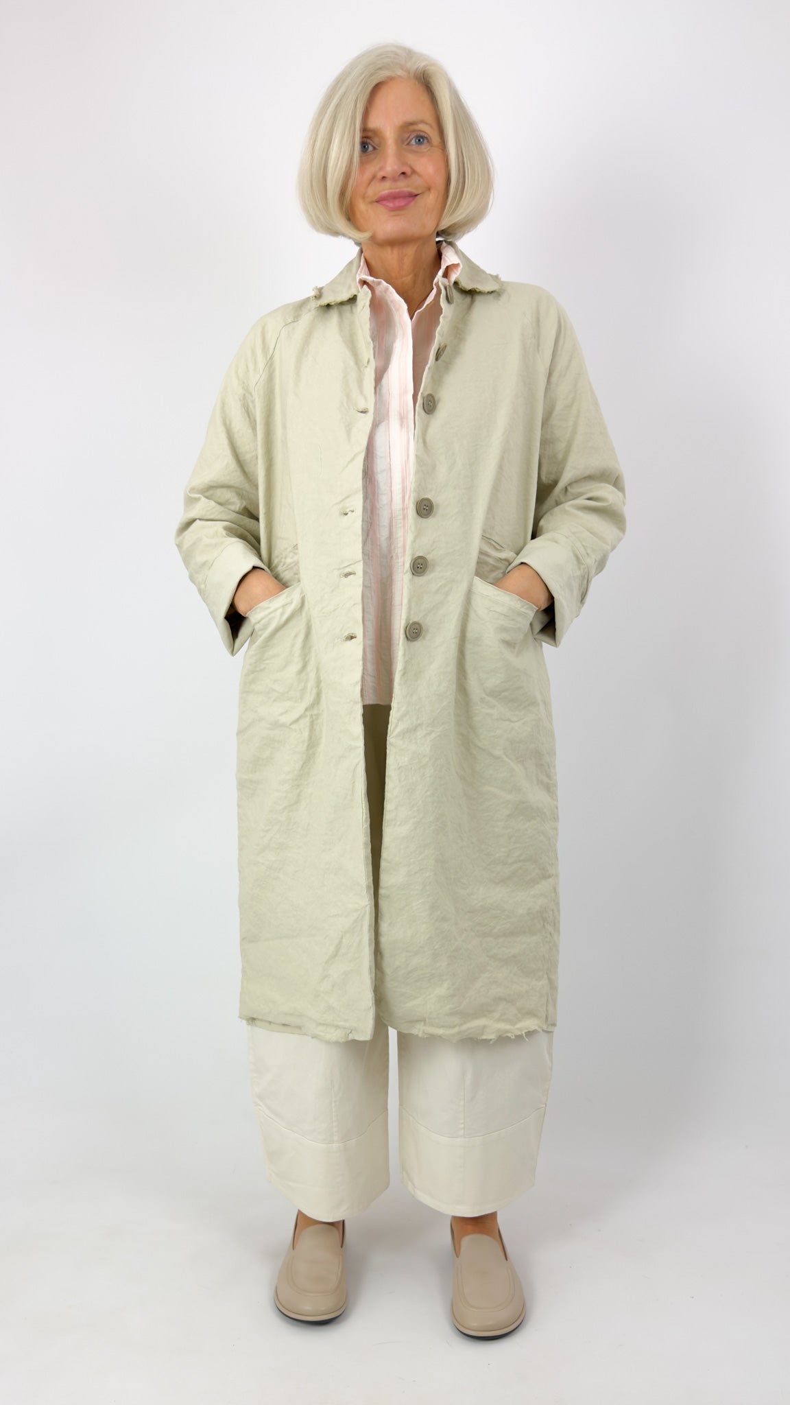 Discover the signature fabrication that's made this brand a bestseller. This long coat features a luxurious crinkled cotton and linen blend that drapes beautifully while maintaining its shape. The button front and rounded collar create a refined silhouette, while intentional frayed edges add contemporary character. Lined in pure cotton for comfort against the skin, this versatile piece transitions effortlessly from season to season. A timeless investment piece with modern edge.