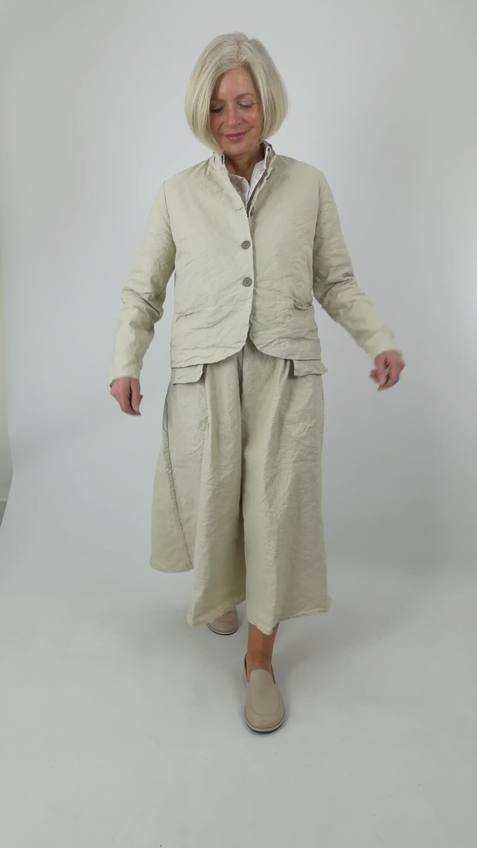 Structured for effortless layering, this boxy jacket combines crinkled cotton and linen for a relaxed, textured finish. A crinkled stand-up collar and button front create structure, while two front pockets with their lining peeping out at the hem add visual interest. Perfect for transitional dressing, this piece brings understated sophistication to any wardrobe.