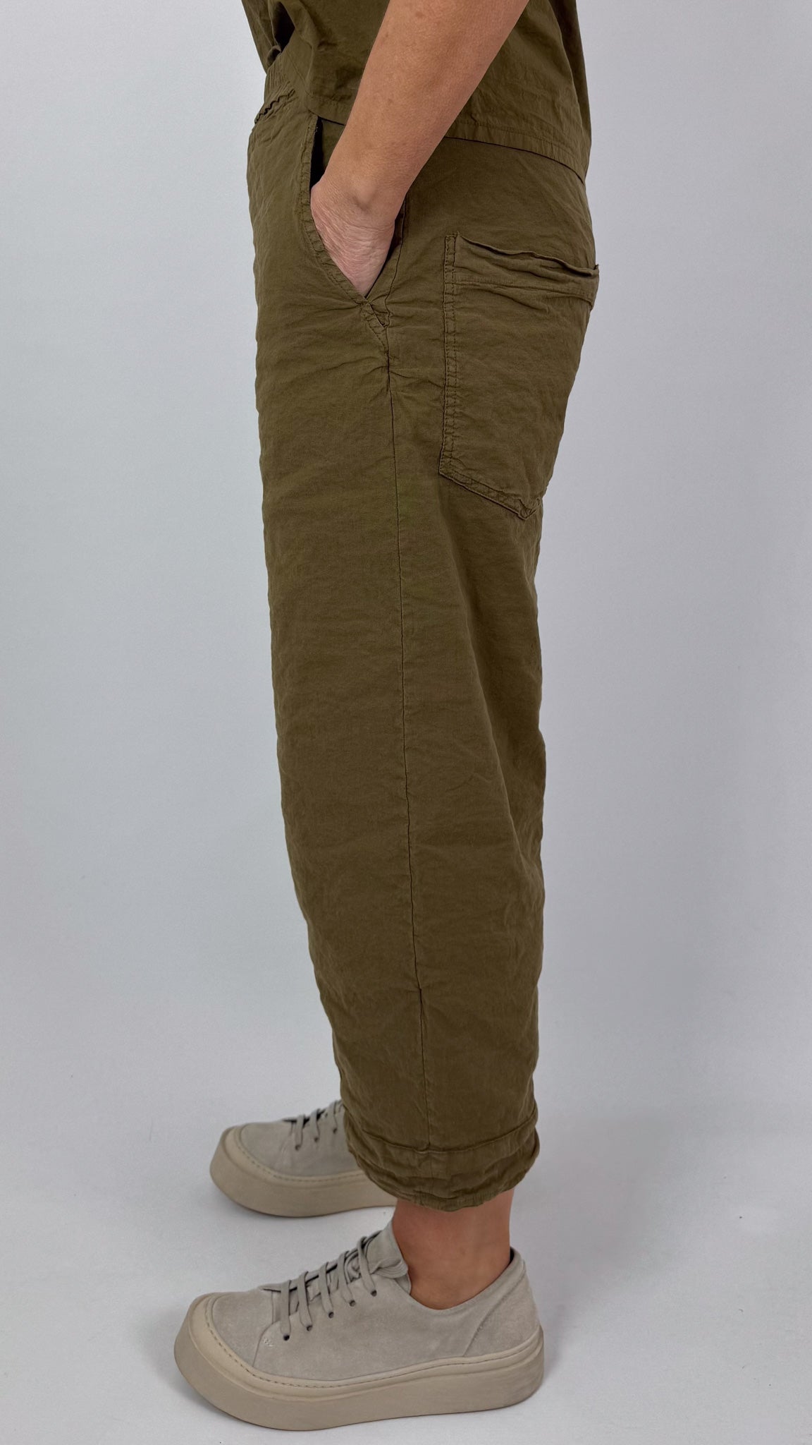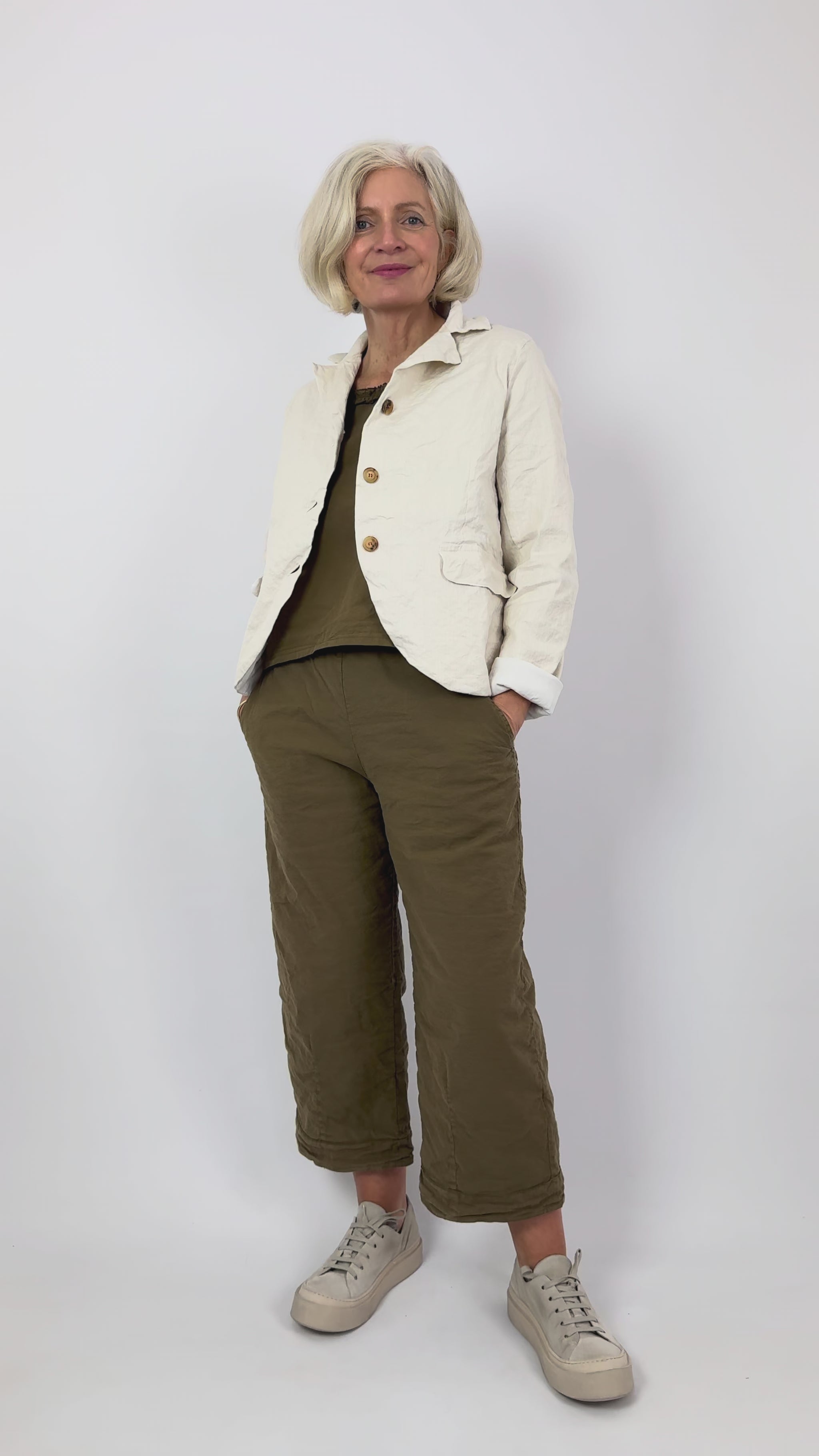 Crafted from the brand's acclaimed cotton and linen blend, these trousers feature a touch of stretch and metallic fibres woven throughout for textural depth and subtle movement. The straight leg cut is grounded by an elasticated waistline, whilst functional side pockets and subtle seam detailing provide both practicality and design sophistication. A distinctive doubled-over hemline adds contemporary edge. In versatile sand, these are an essential wardrobe investment.