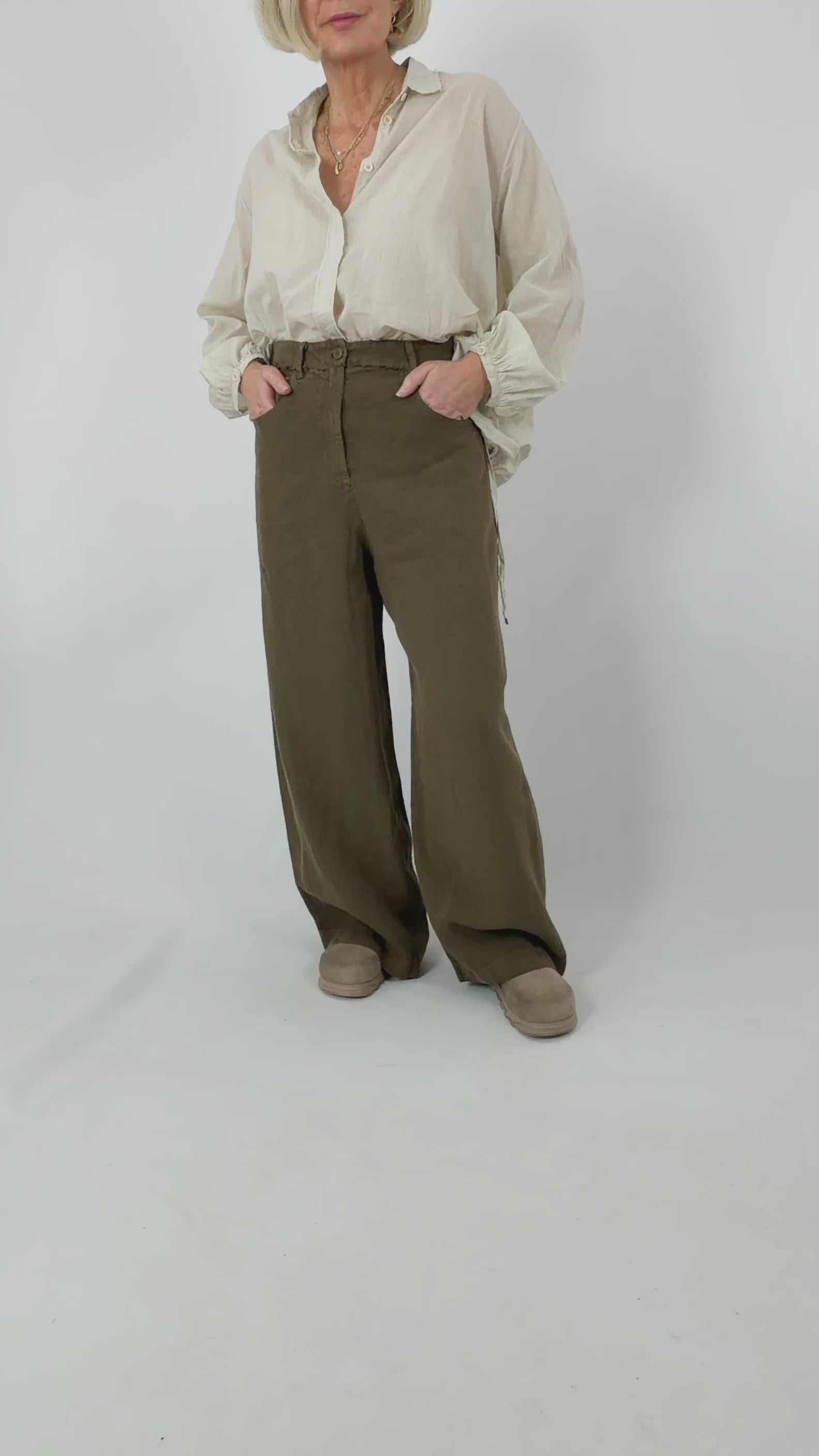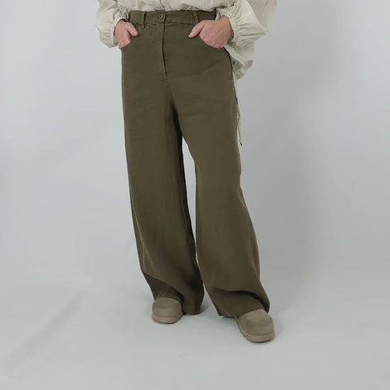 Elevate your wardrobe with these sophisticated linen trousers, crafted for effortless elegance. Featuring a graceful flared silhouette, they combine a dual button and zip fastening with practical belt loops for a polished look. The elasticated waist at the back ensures comfort throughout the day, while expertly placed seam detailing sculpts a flattering fit. Perfect for both refined occasions and relaxed styling, these versatile trousers deliver timeless appeal in a breathable linen fabric.