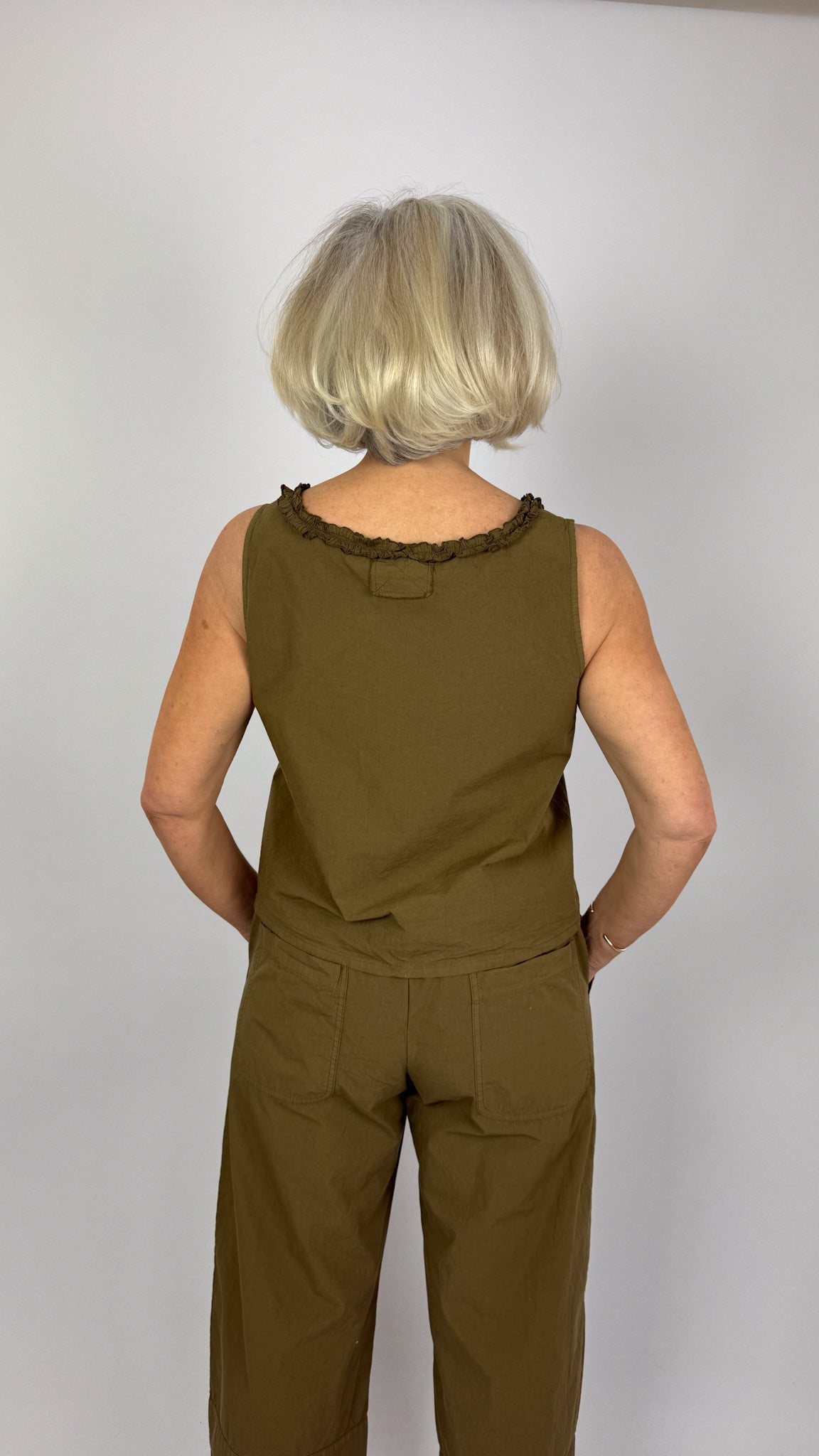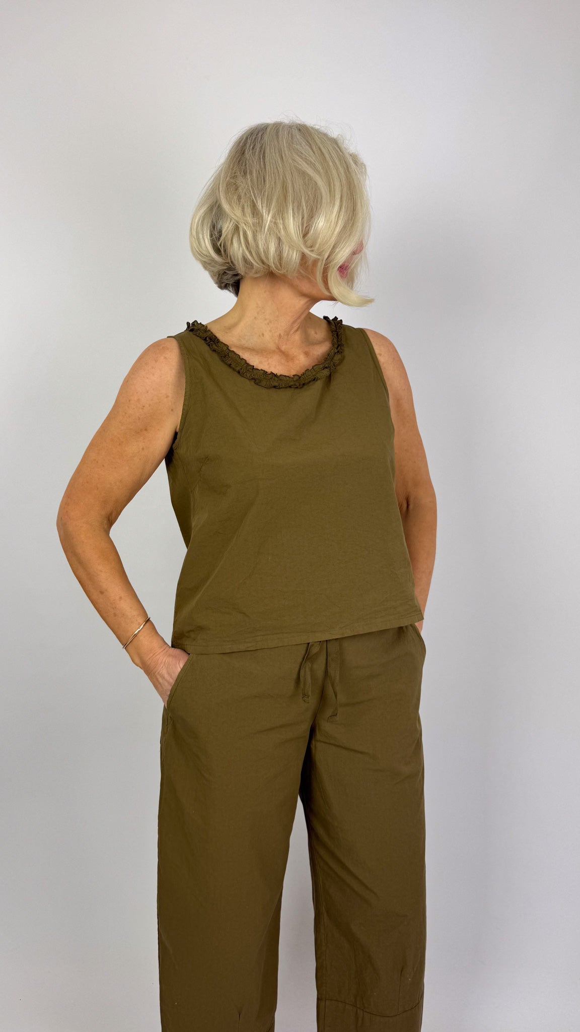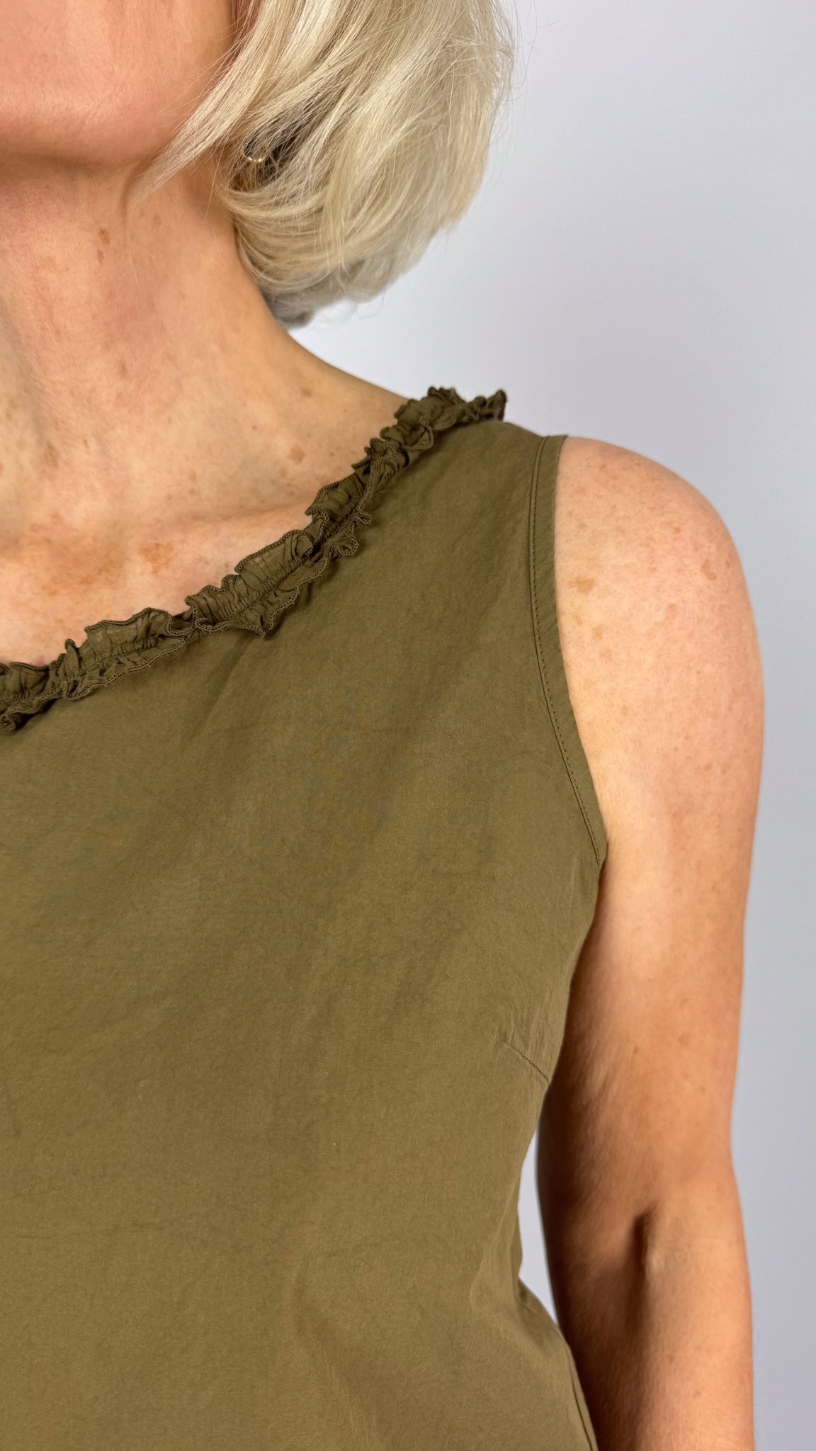 The Aequamente 145 Top Legno is a charming summer essential featuring a relaxed, boxy silhouette. Cut short for effortless layering, this sleeveless design showcases delicate straps and a rounded neckline adorned with coordinating floral detailing crafted from the same premium cotton fabric. The thoughtful design ensures the embellishment complements rather than overwhelms, creating a cohesive, refined aesthetic perfect for warm-weather dressing.