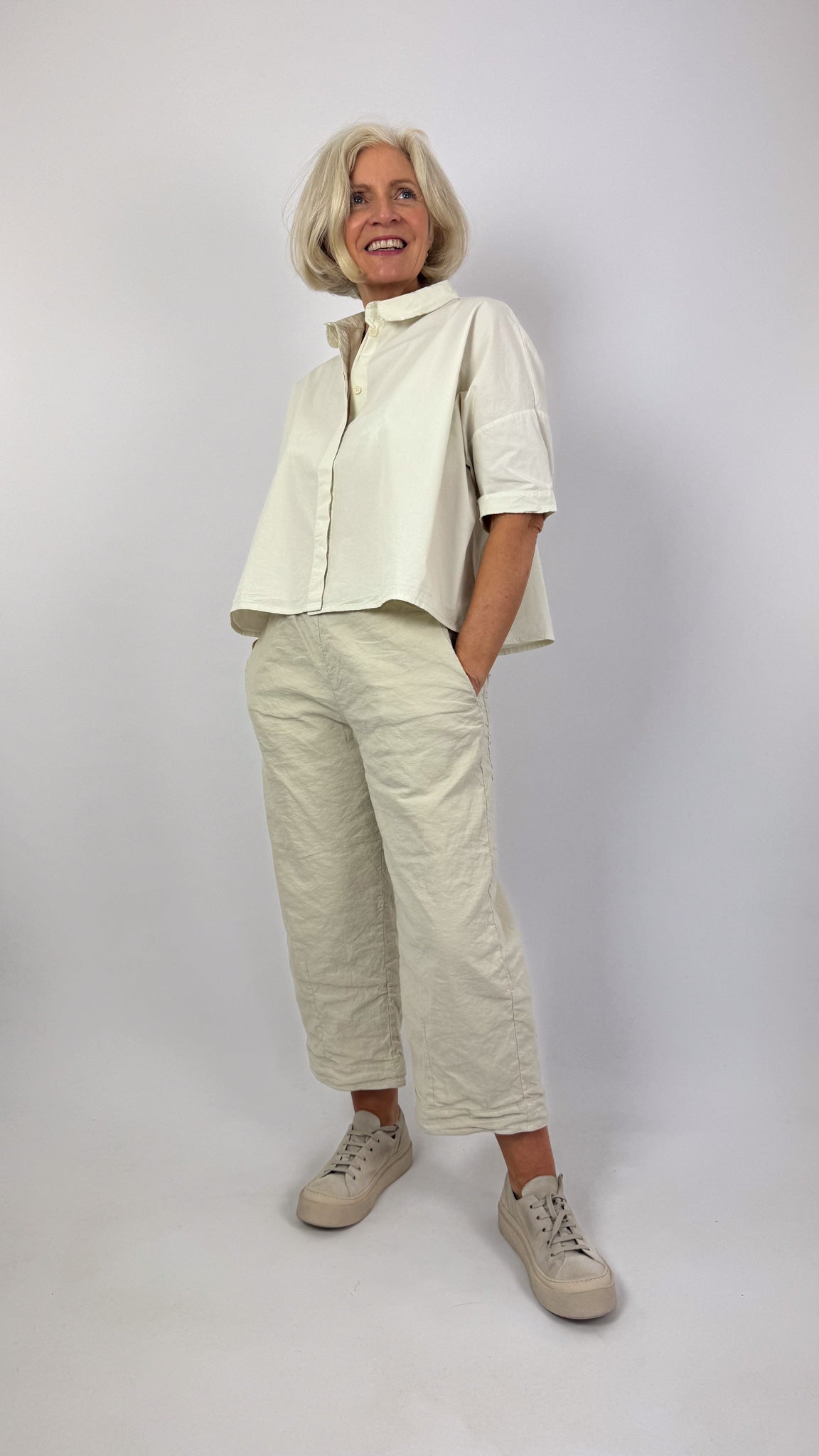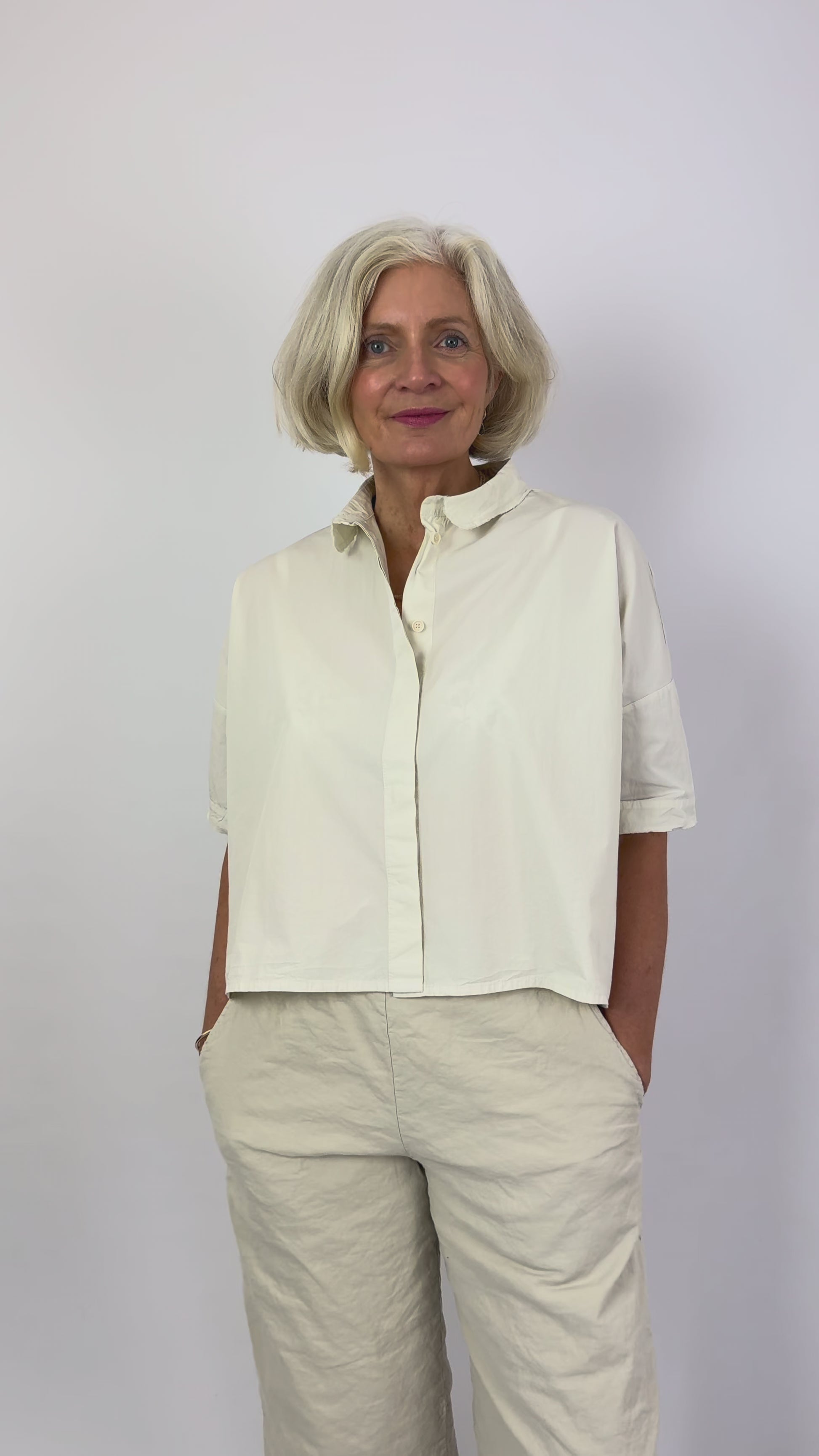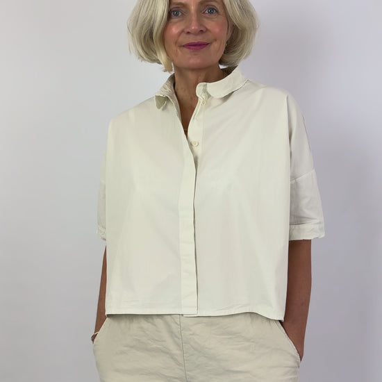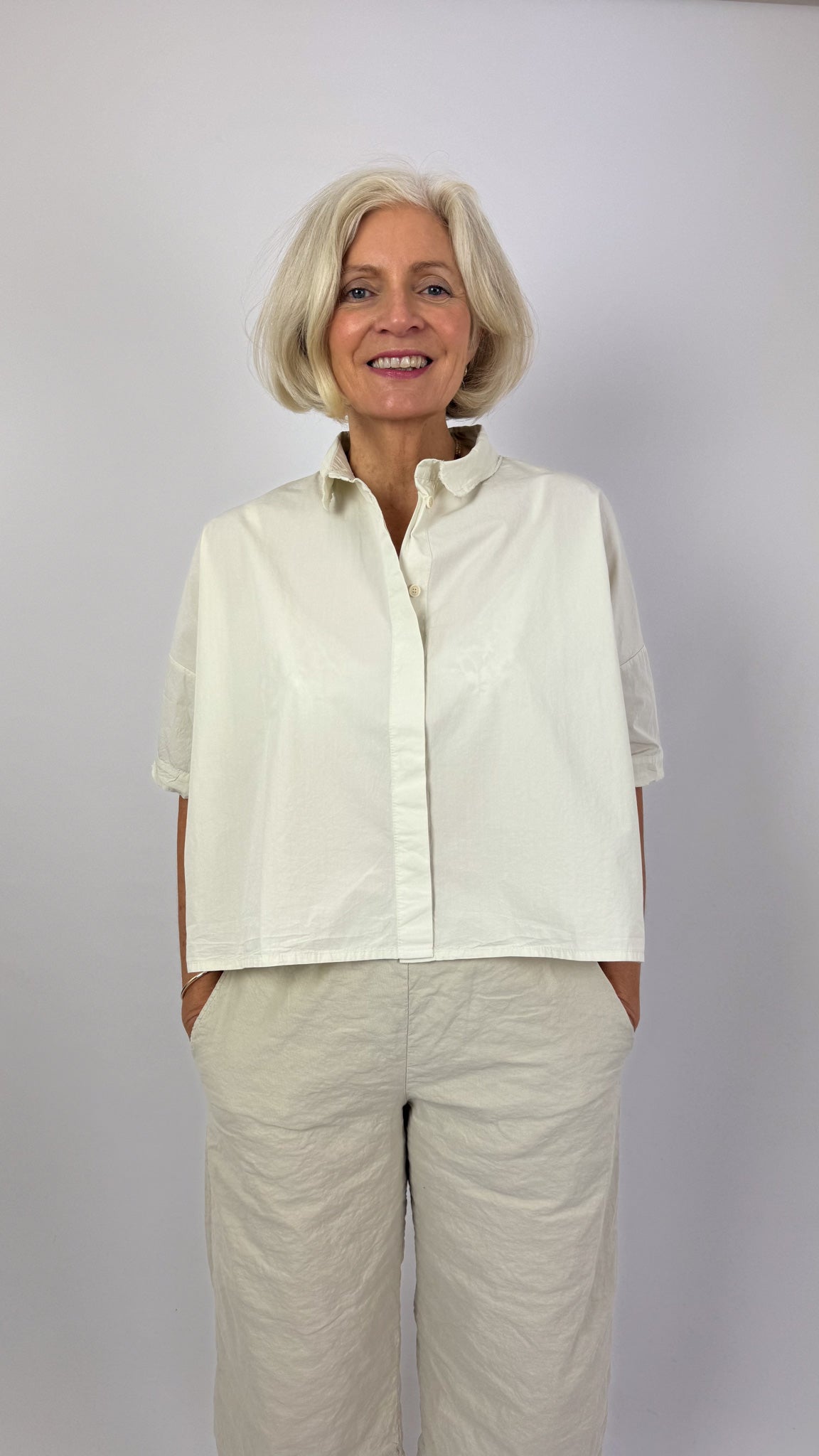 The Aequamente 147 Shirt in Chalk combines relaxed tailoring with contemporary design details. Crafted from crisp cotton, this boxy short-sleeved shirt features a classic collar and covered button front, finished with distinctive raw edge detailing that frames the neckline. The generous, wide silhouette offers effortless comfort and versatile styling for everyday wear.