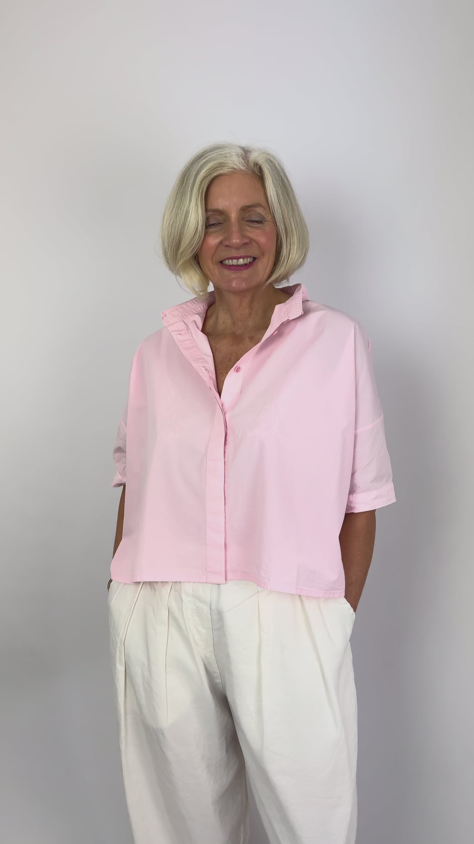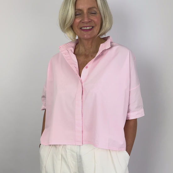 The Aequamente 147 Shirt Rosa combines relaxed tailoring with contemporary design details. Crafted from crisp cotton, this boxy short-sleeved shirt features a classic collar and covered button front, finished with distinctive raw edge detailing that frames the neckline. The generous, wide silhouette offers effortless comfort and versatile styling for everyday wear.