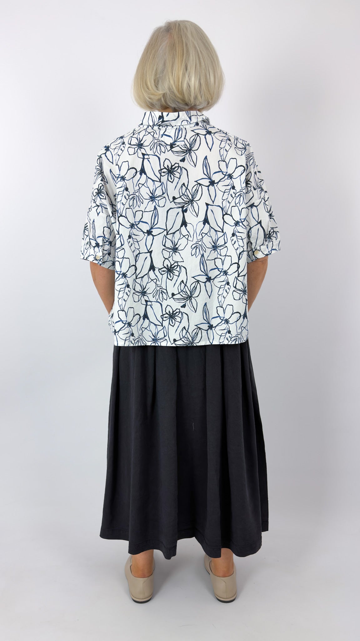 A crisp cotton shirt with a boxy, wide silhouette and elbow-length sleeves. Features a classic collar and button front, set against a white background with an elegant navy flower print. Crafted from 100% cotton for comfort and easy care. Perfect for casual layering or standalone wear.