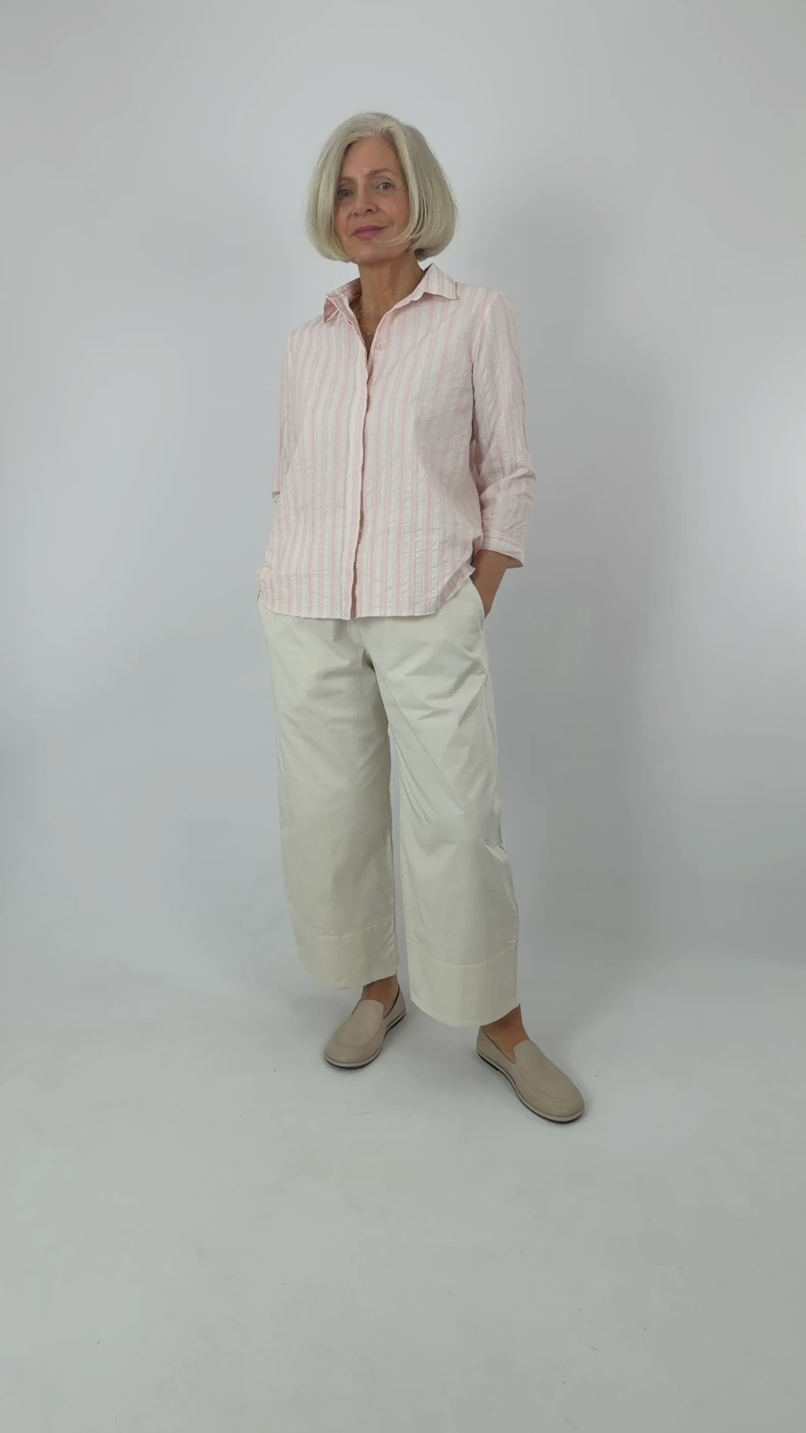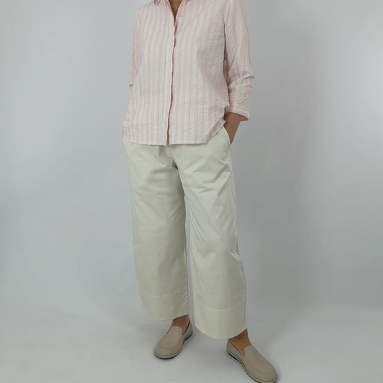 Effortless summer style in pure cotton. This relaxed shirt features delicate pale pink stripes on a soft chalk background, with a classic covered button front and pointed collar. The three-quarter length sleeveless cut offers breathable comfort for warm days, making it perfect for layering or wearing solo. A versatile wardrobe essential that transitions seamlessly from casual to smart-casual occasions.