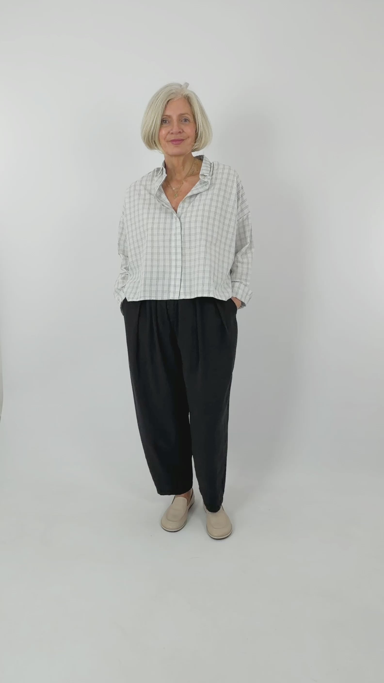 Relaxed and roomy, this boxy check shirt delivers effortless style. Crafted from 100% cotton, it features a crisp white base with dark check detailing, a classic button front, and a structured collar. The loose fit makes it perfect for layering or wearing solo—roll up the sleeves for a casual, lived-in look. A versatile wardrobe essential that works from weekend to work.
