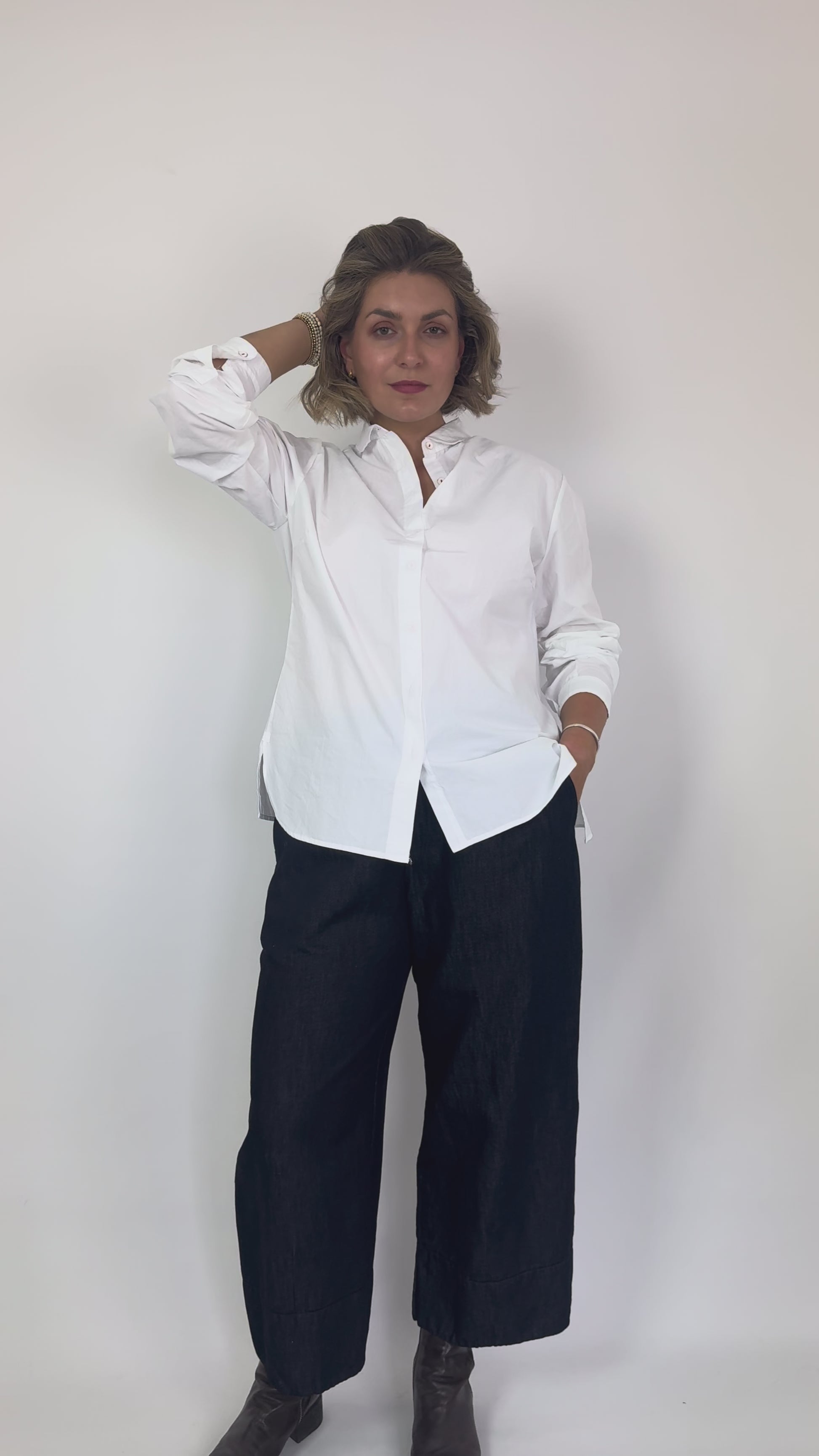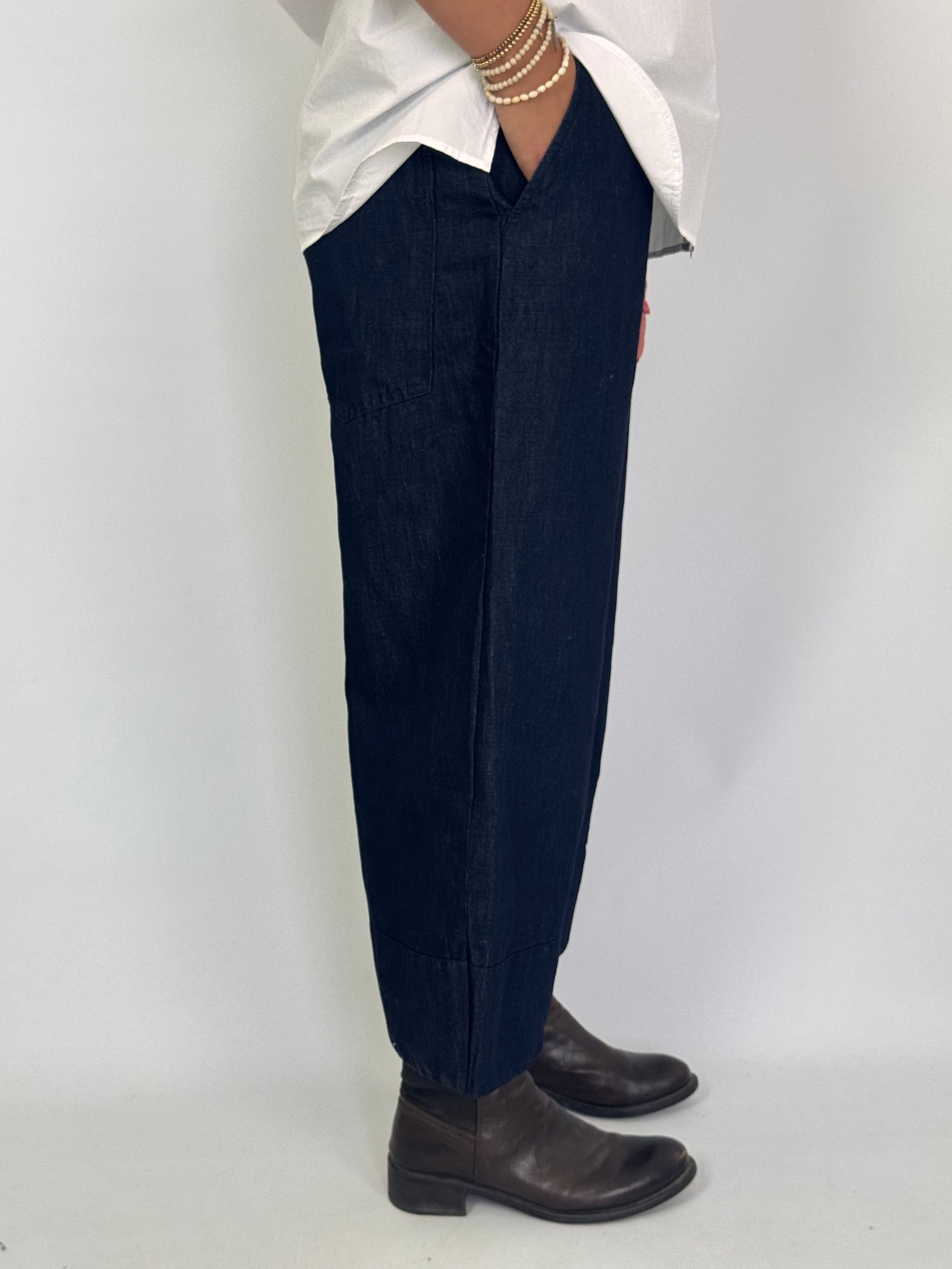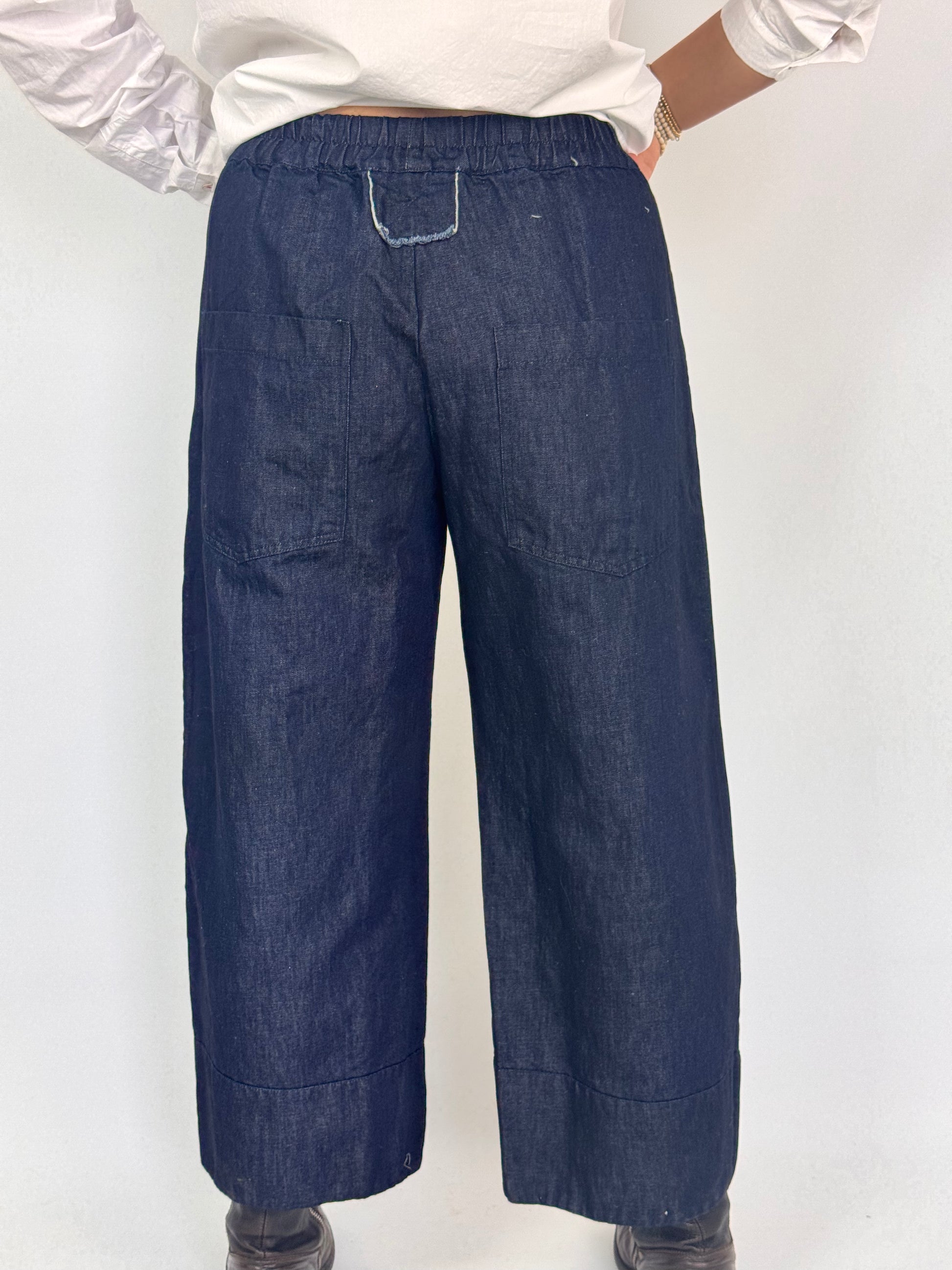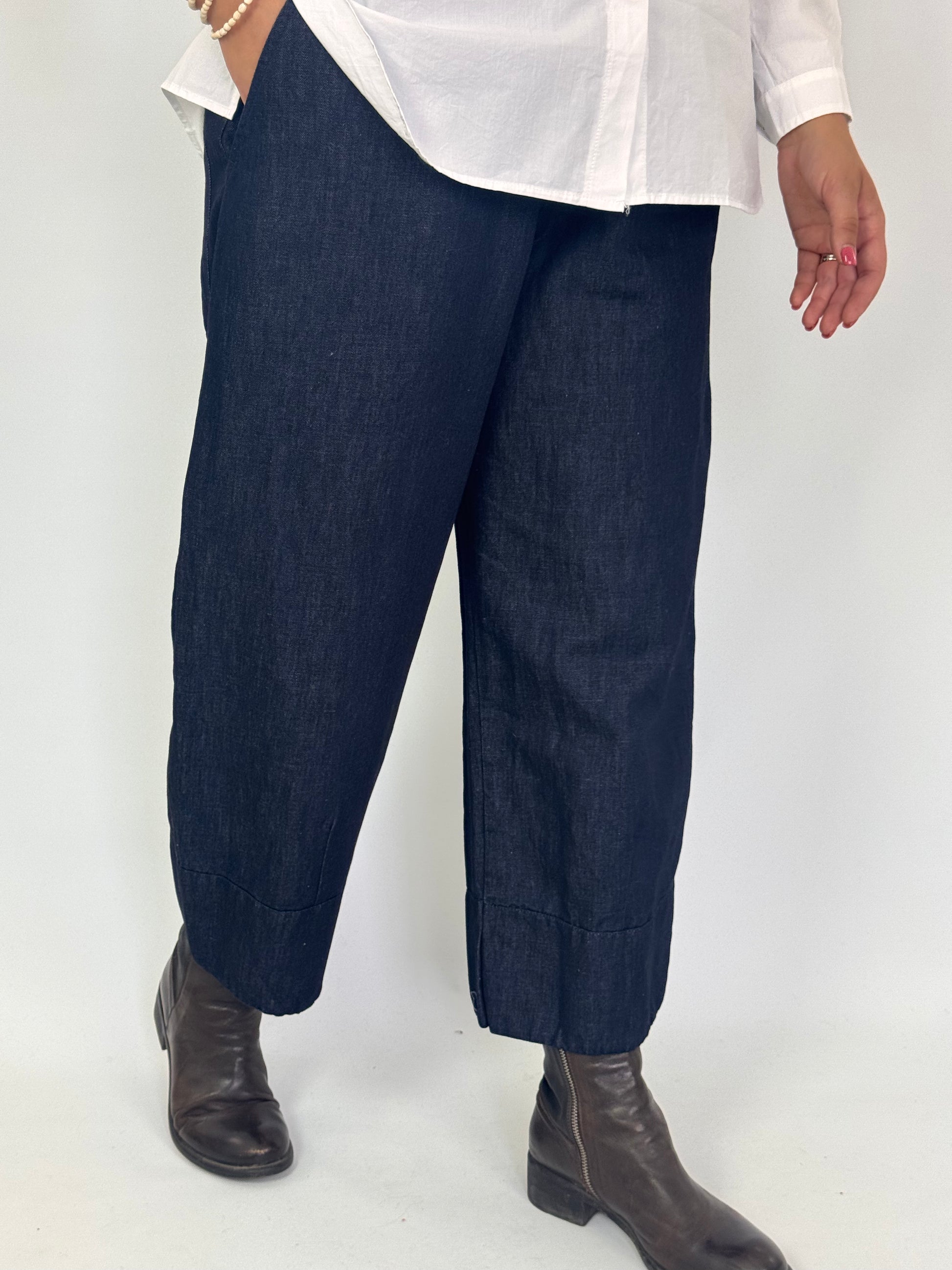 These Aequamente 252 Trousers in denim are crafted from soft thick cotton and linen mix, offering durability and comfort. Designed with a wide, full-length silhouette that subtly curves in at the hem, they provide a flattering fit. The elasticated waistline ensures ease of wear, while side seam pockets add practical functionality. Ideal for those seeking a stylish yet comfortable trouser with expert tailoring details.