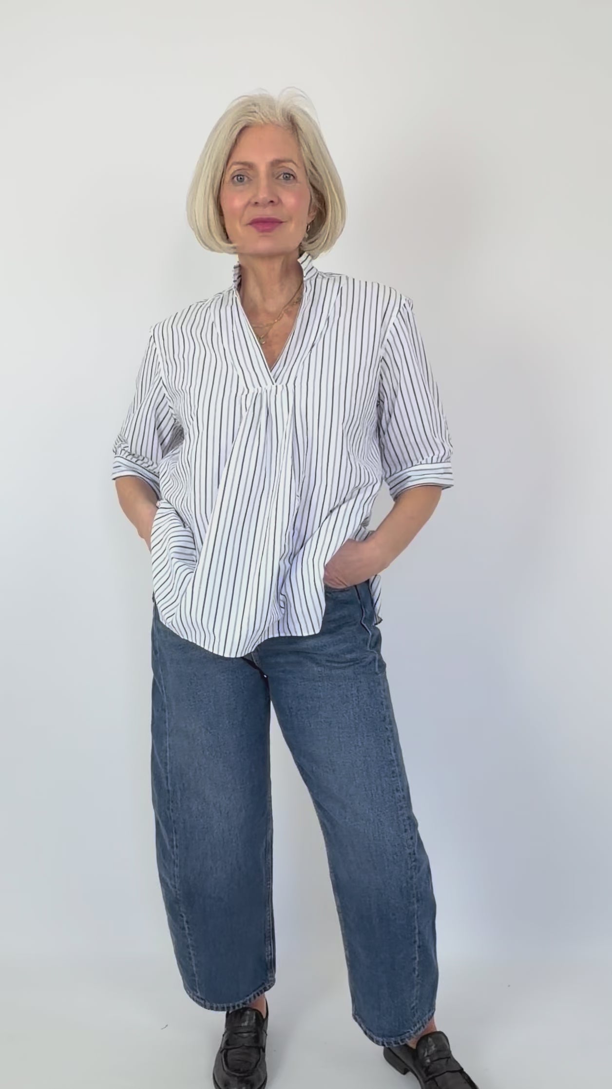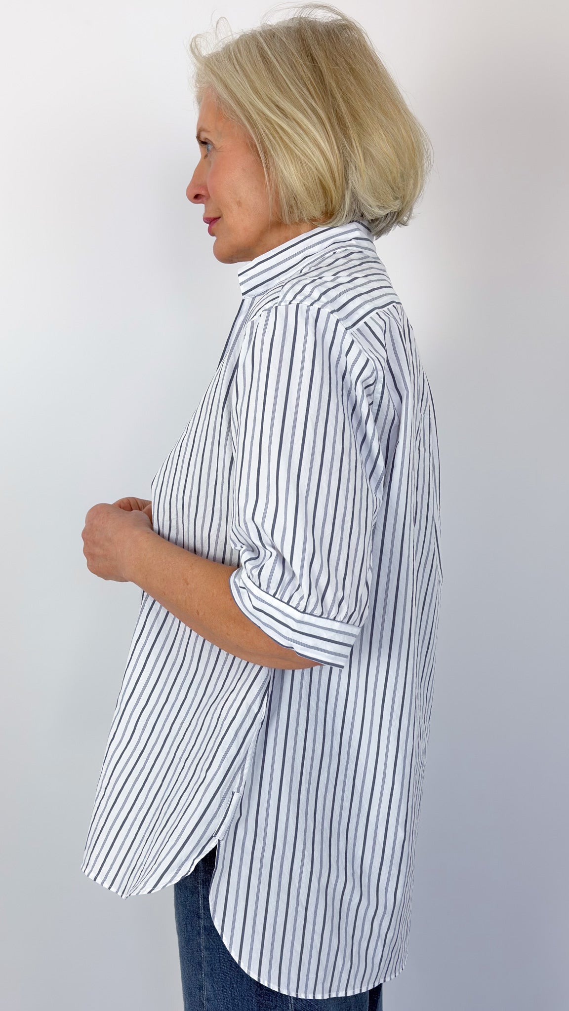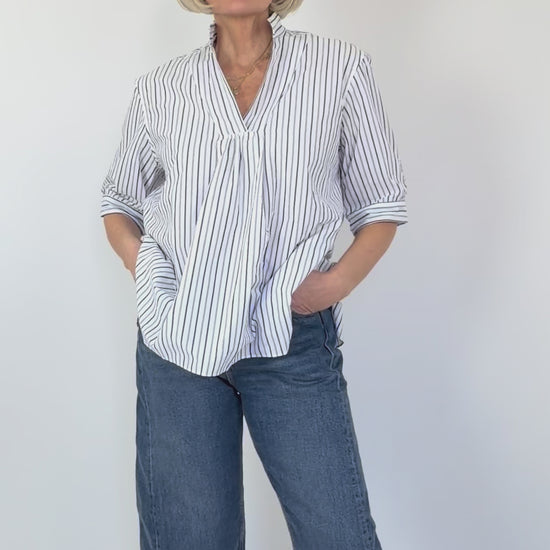 Effortlessly elegant, this Vera shirt combines crisp cotton with timeless style. The soft blue stripe pattern pairs beautifully with a flattering V-neckline gathered at the point. Three-quarter length sleeves and a relaxed, loose fit create an understated sophistication, while the longer back hem adds subtle movement and dimension. Perfect for warm weather dressing with an easy, laid-back charm.
