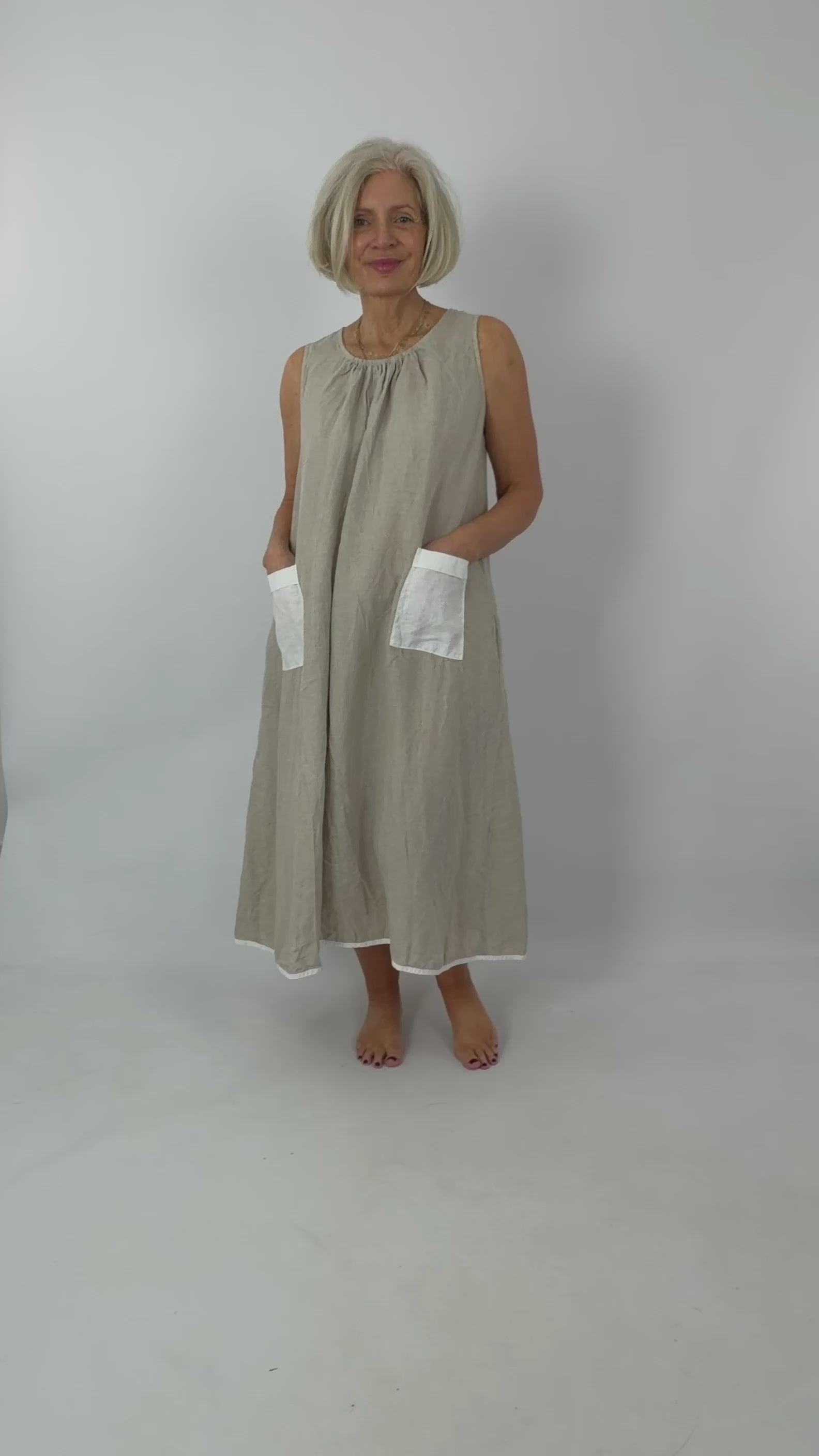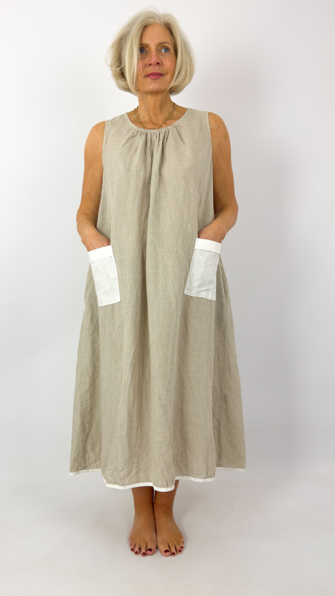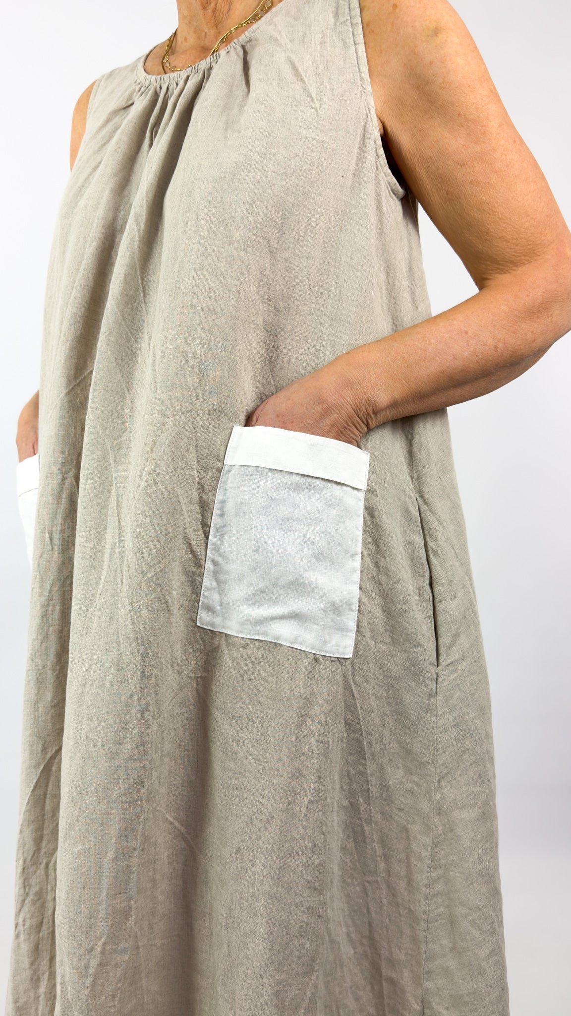 The Barbara Lang IND XVII dress captures effortless summer elegance in soft neutral linen. This sleeveless design features a charming gathered round neckline that flatters the décolletage, whilst two white cotton pockets add both practicality and textural contrast to the front. Crafted from soft linen, it's an ideal companion for warm-weather occasions—from leisurely garden gatherings to seaside escapes. The thoughtful construction and refined details make this a versatile wardrobe essential that transitions seamlessly from day to evening wear.