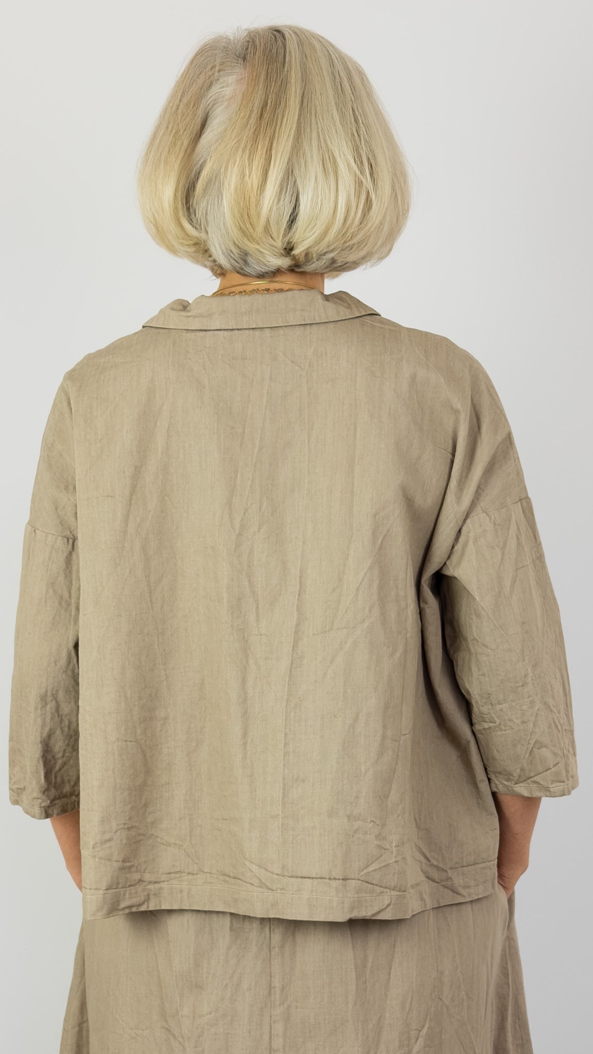 A timeless boxy jacket in soft beige cotton. Features a classic collar, button front closure, and two practical patch pockets. The relaxed silhouette offers effortless style and comfort for everyday wear.