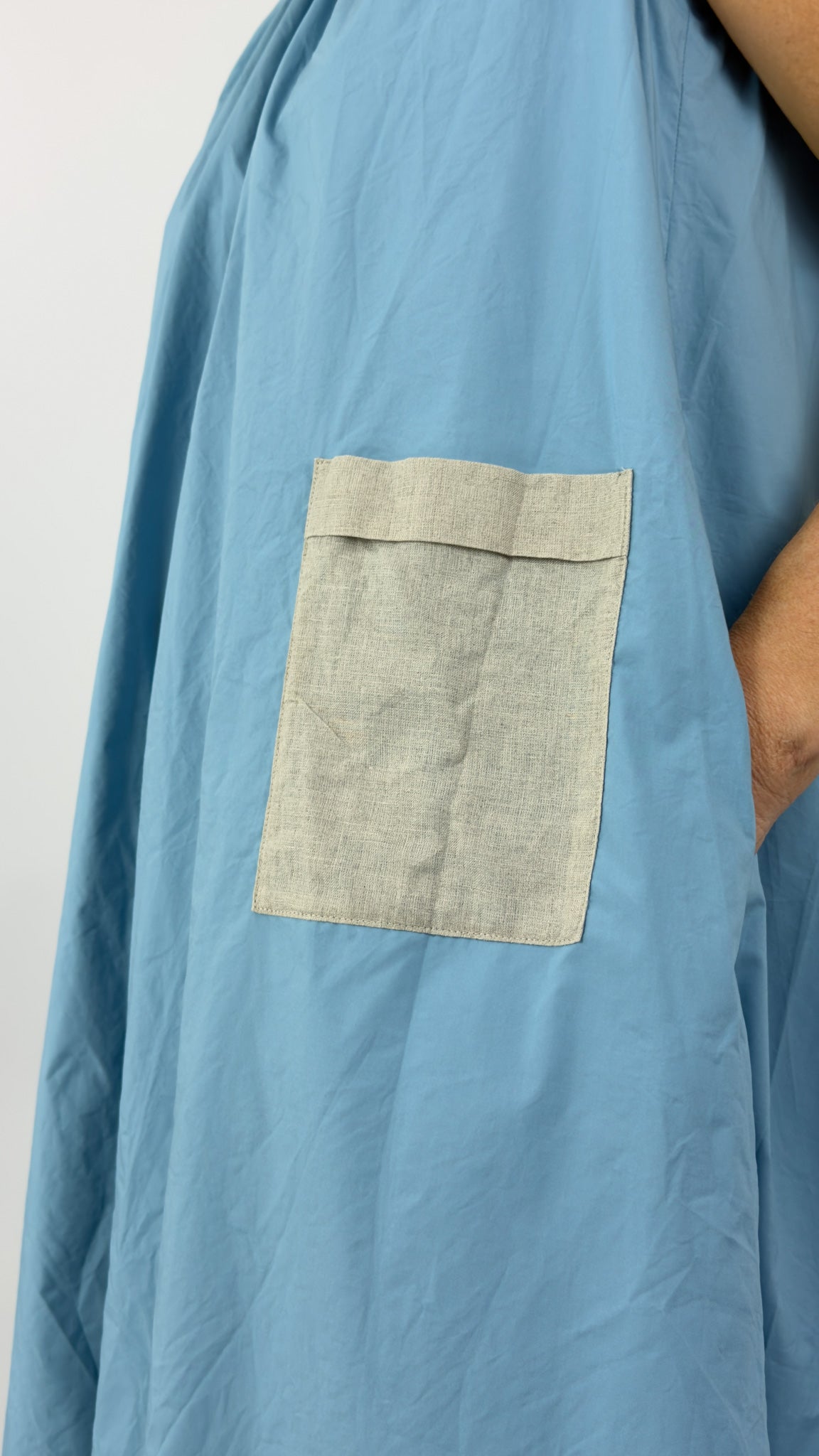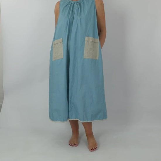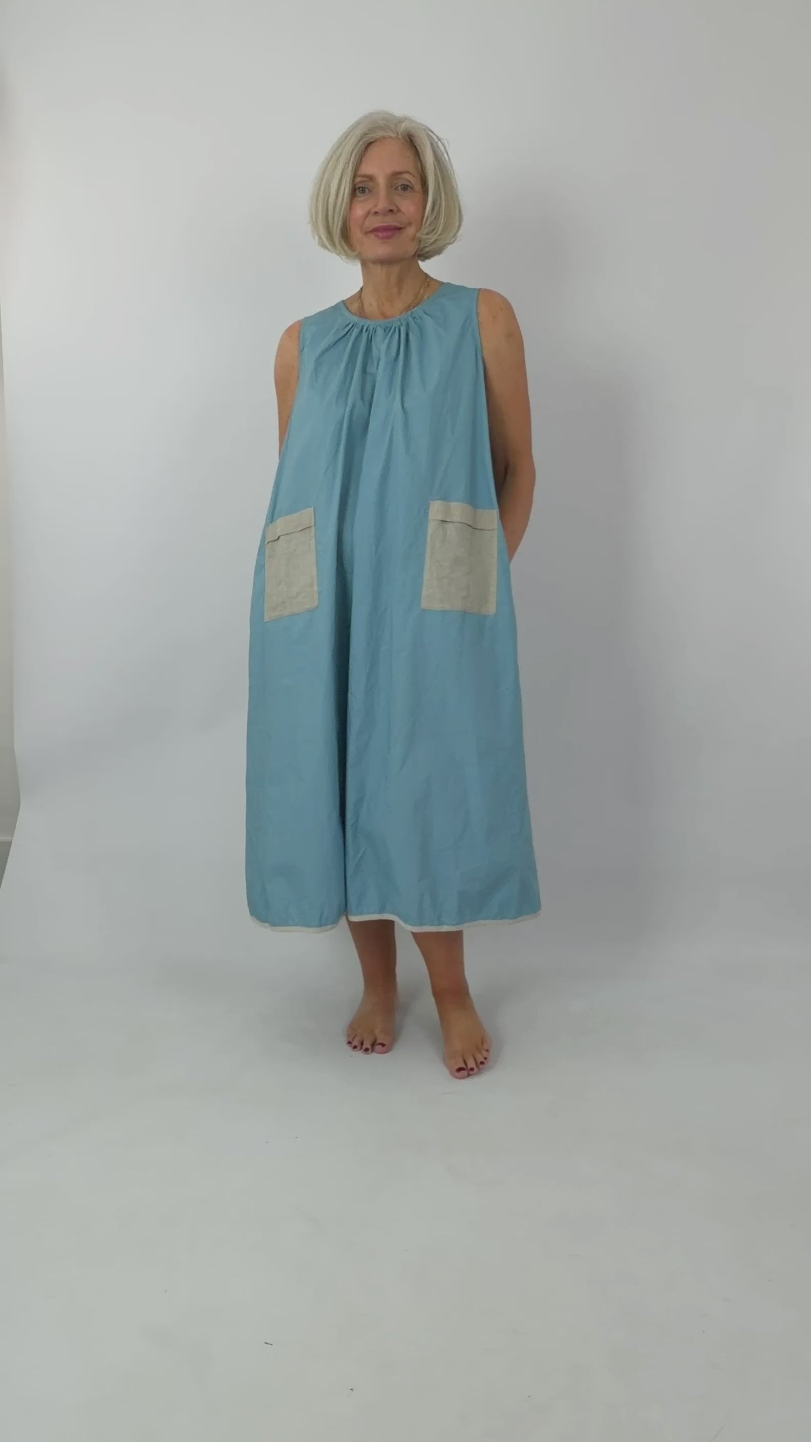 The Barbara Lang TRAV XVII dress captures effortless summer elegance in soft pale blue cotton. This sleeveless design features a charming gathered round neckline that flatters the décolletage, whilst two beige linen pockets add both practicality and textural contrast to the front. Crafted from soft cotton, it's an ideal companion for warm-weather occasions—from leisurely garden gatherings to seaside escapes. The thoughtful construction and refined details make this a versatile wardrobe essential that transitions seamlessly from day to evening wear.