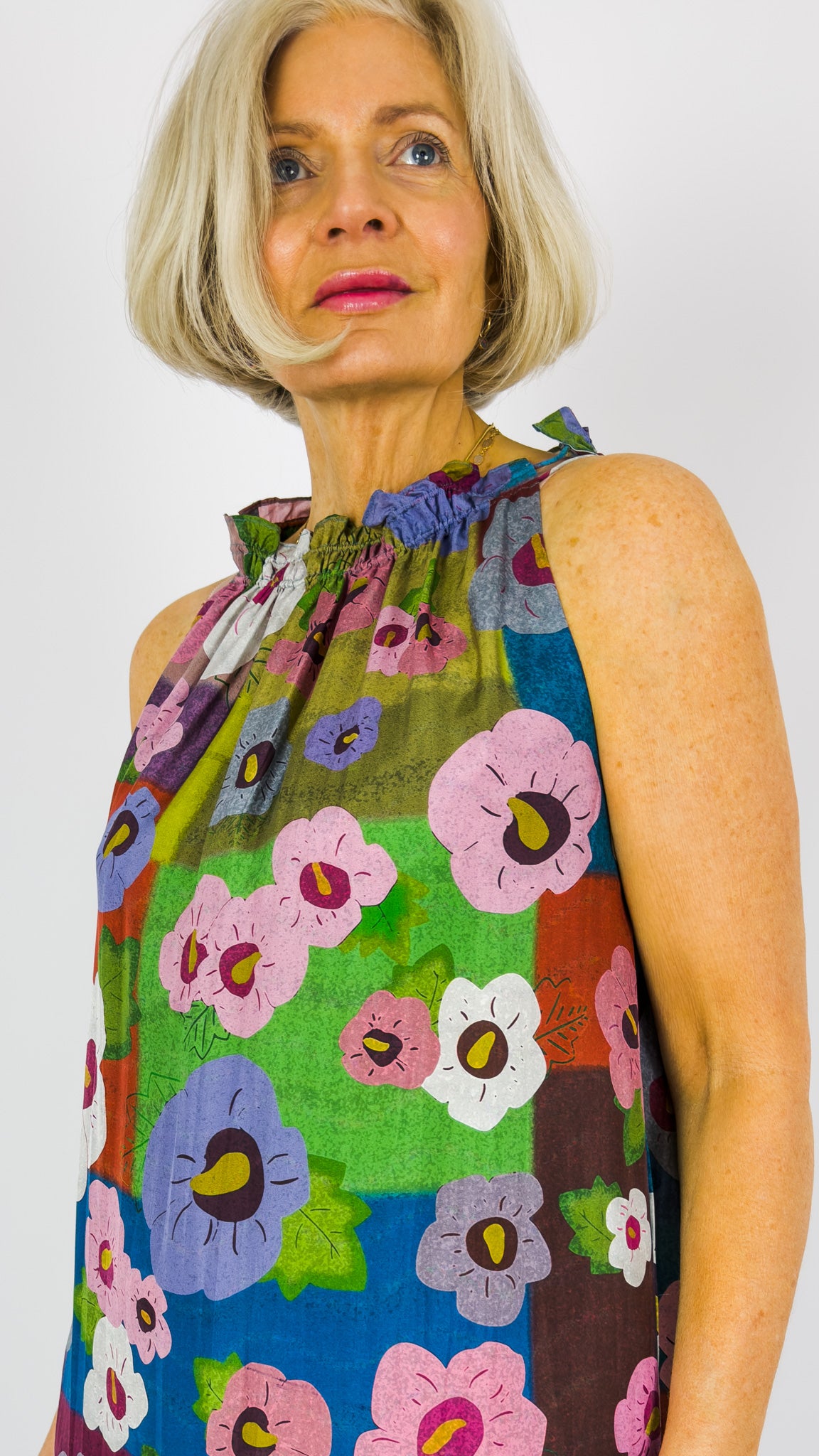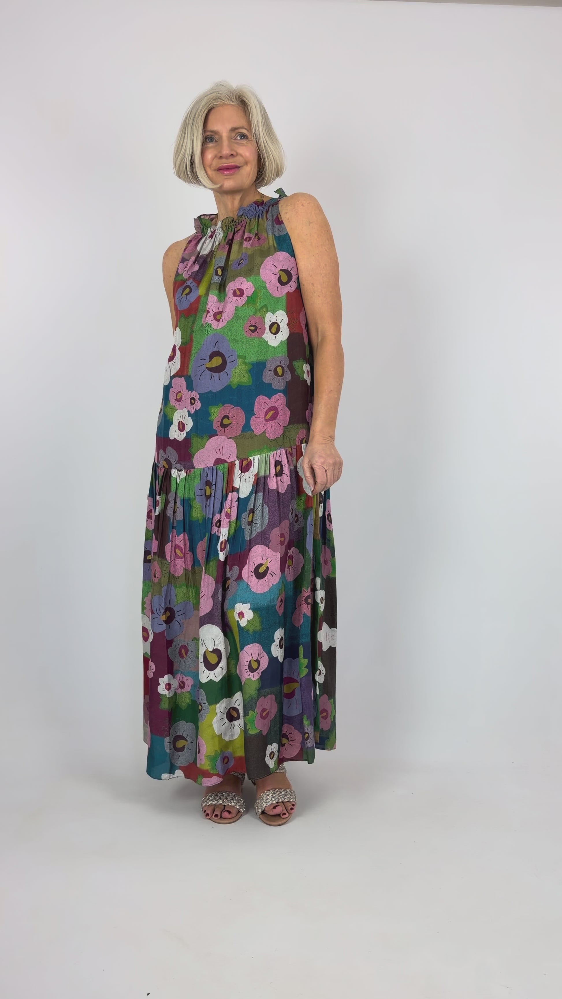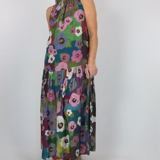 Indulge in understated luxury with the Beetroot Kumo Dress Bloom, a full-length silk creation crafted in India. This striking piece features a vibrant floral print that commands attention, paired with dual spaghetti straps that thread elegantly through the neckline for an adjustable fit. A gathered dropped waist seam transitions into a softly frilled lower half, creating fluid movement and refined silhouette. Perfect for those who appreciate artisanal craftsmanship and timeless elegance.