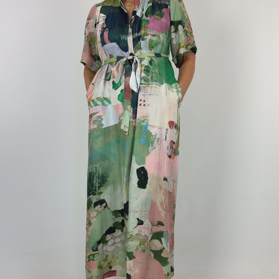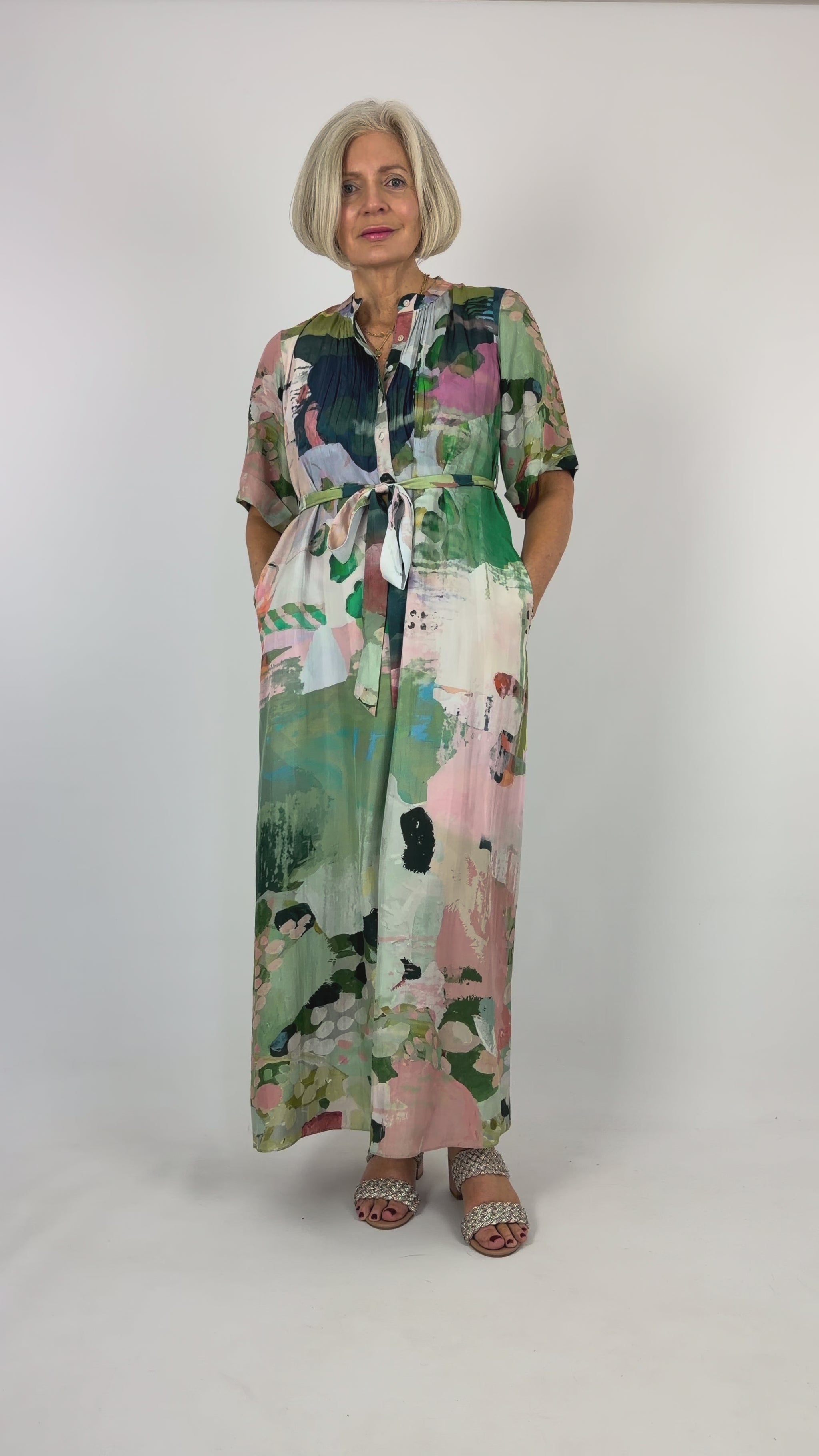 Discover timeless elegance with this stunning luxury silk dress, expertly crafted in India. Featuring a sophisticated shirt dress silhouette with a collarless gathered neckline and button fastening to the waistline, this piece effortlessly transitions from day to evening wear. The detachable self-fabric belt allows you to customise your look, whilst short sleeves and a graceful long length create an understated refinement. Ideal for special occasions and discerning occasions, this dress embodies quiet luxury and versatile sophistication.