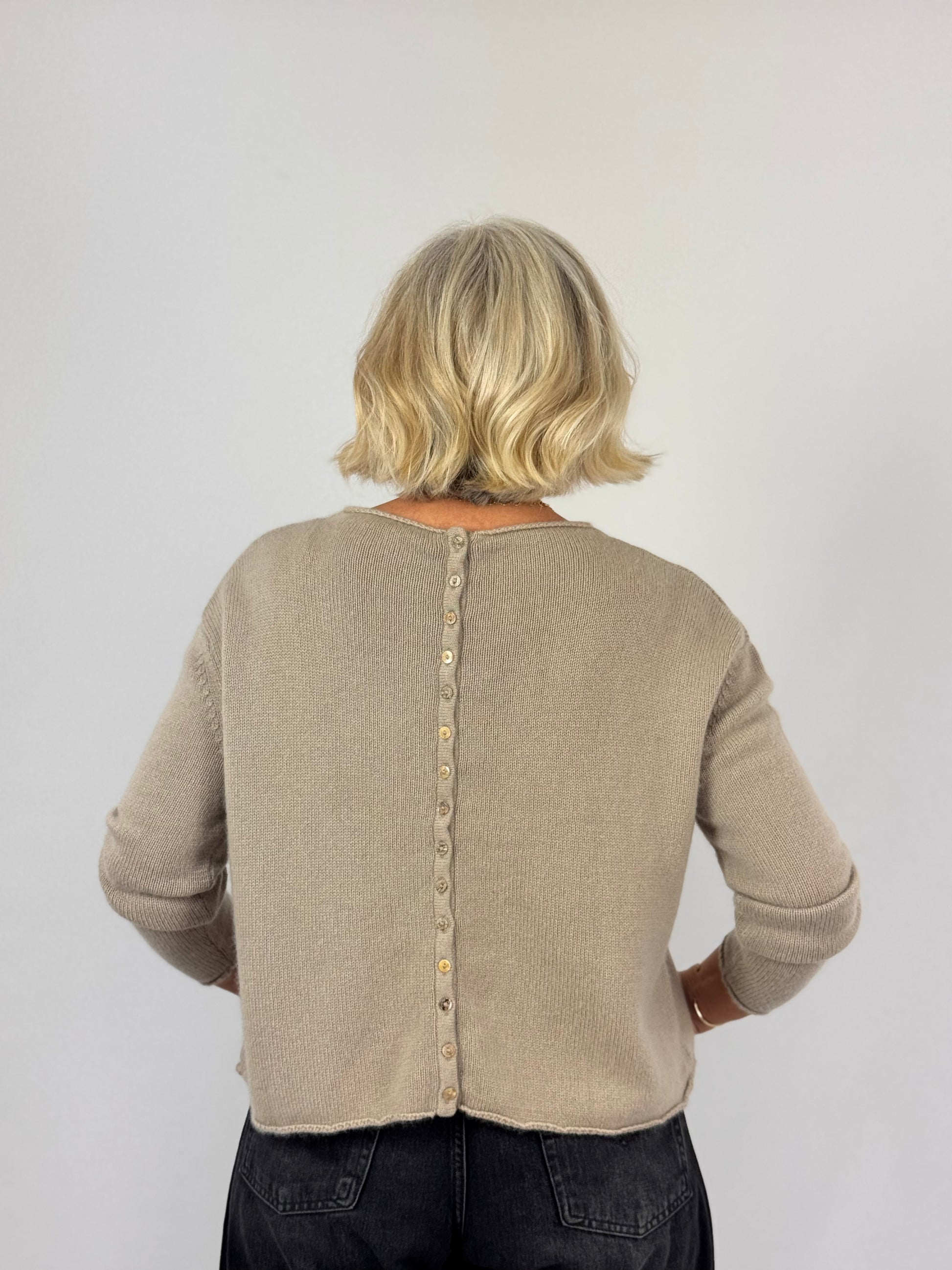 This expert-crafted cashmere jumper for luxurious warmth and softness. Its short, boxy silhouette with dropped shoulders and a high boat neckline offers a modern, relaxed fit. The back features delicate mother-of-pearl buttons, while two small front pockets add subtle detail. Perfect for layering, this camel jumper combines sophisticated style with exceptional comfort.
