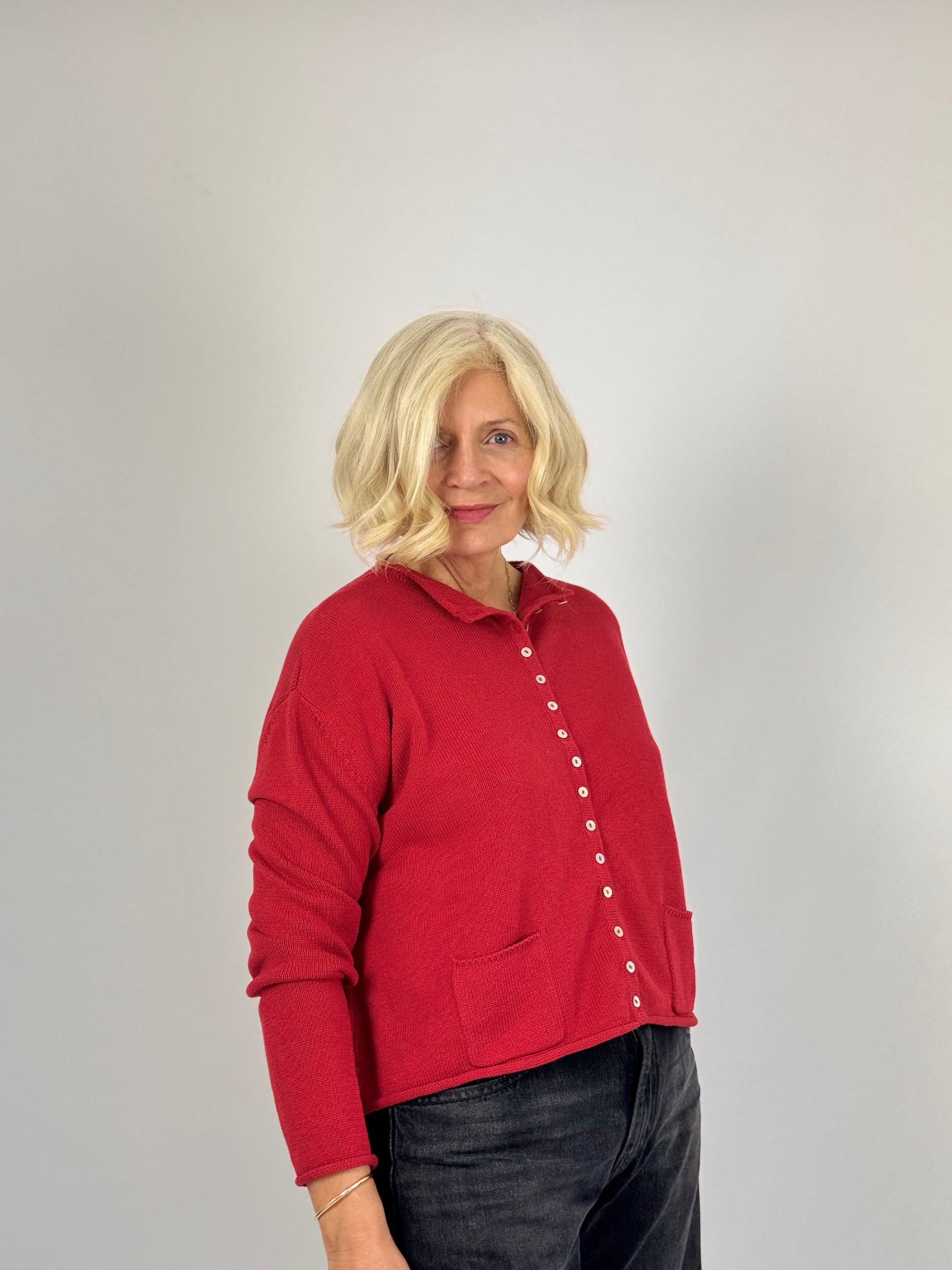 This red cardigan features a short, boxy silhouette with dropped shoulders for a relaxed, modern fit. Finished with mother of pearl button fastenings and two small front pockets, it offers subtle detailing that elevates everyday style. Ideal for layering, it combines comfort with refined craftsmanship.