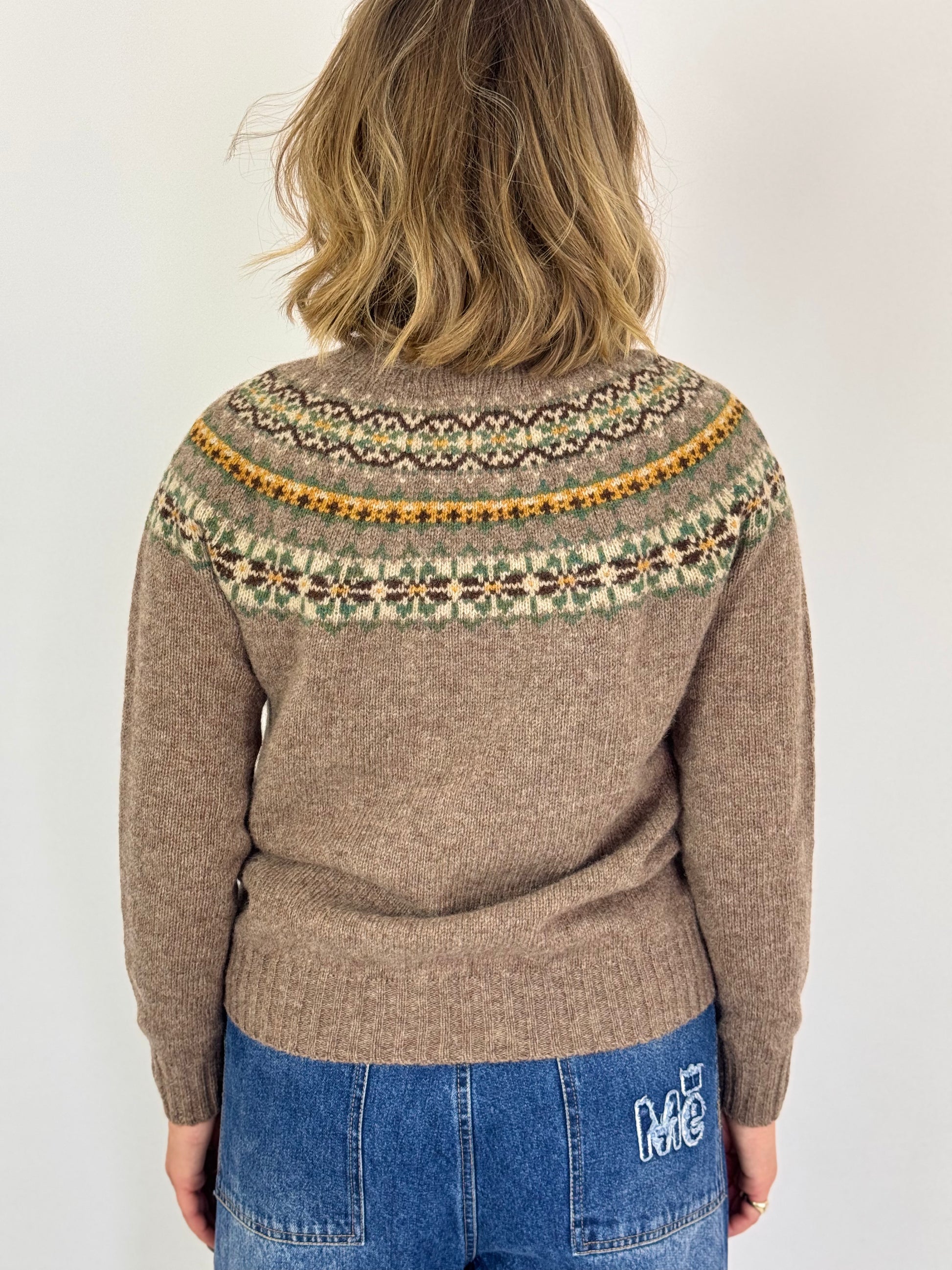 Crafted in Scotland, the Cordelia James Heather Jumper Tundra combines traditional lambswool softness with expert design. This regular-fit jumper features a taupe body accented by a classic Fair Isle yoke in cream, brown, green, and yellow hues. The ribbed round neckline ensures a comfortable, refined finish, making it an ideal choice for both style and warmth during cooler seasons.