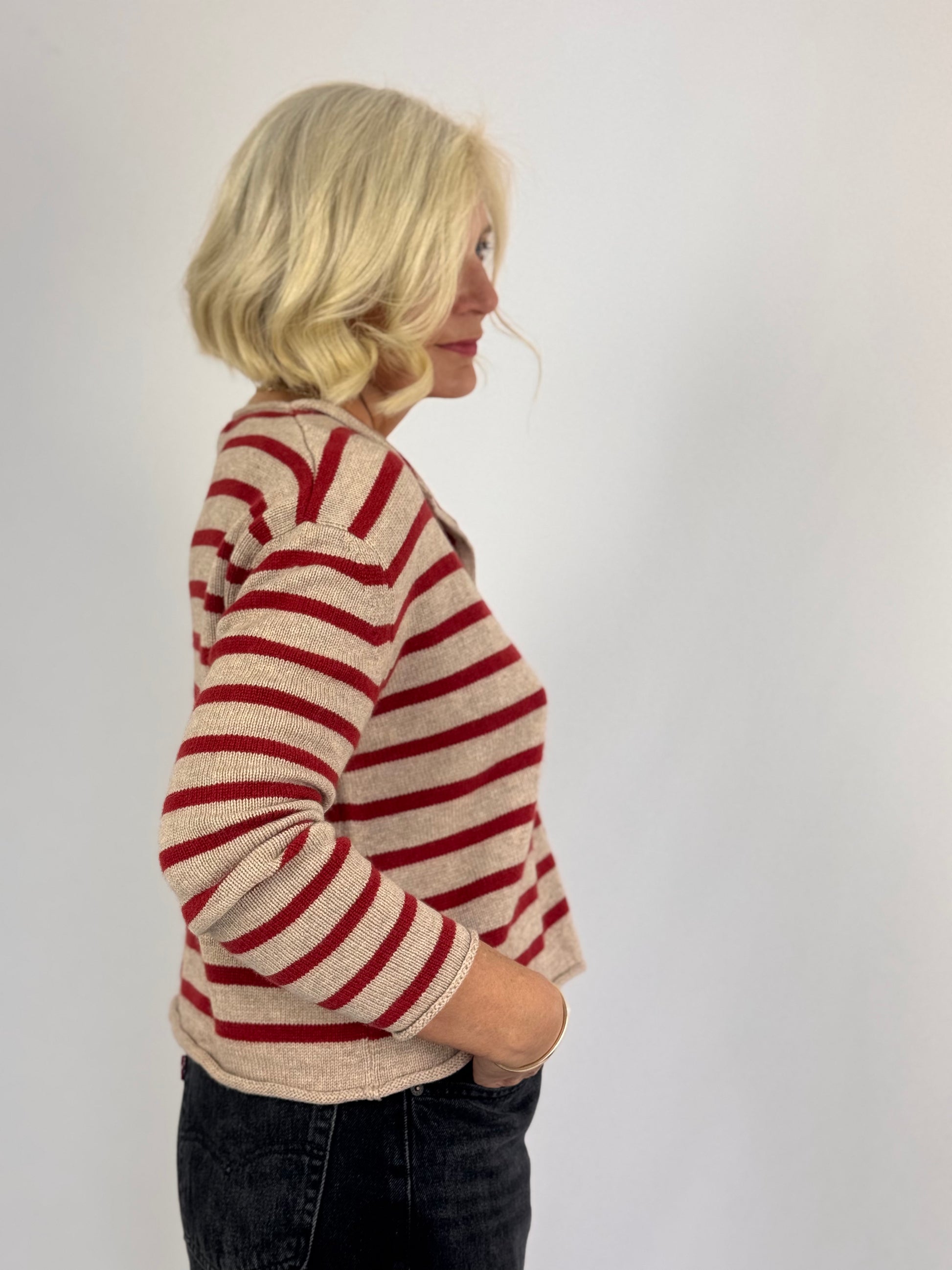 Crafted from a luxurious blend of cashmere and lambswool, the Cordelia James Zeya Cardigan in Oatmeal/Rust offers both warmth and softness. Its short, boxy silhouette is complemented by a natural oatmeal background accented with a striking red striped pattern. Finished with delicate mother of pearl buttons and softly rolled edges, this cardigan combines expert tailoring with timeless style for a refined, versatile layer.