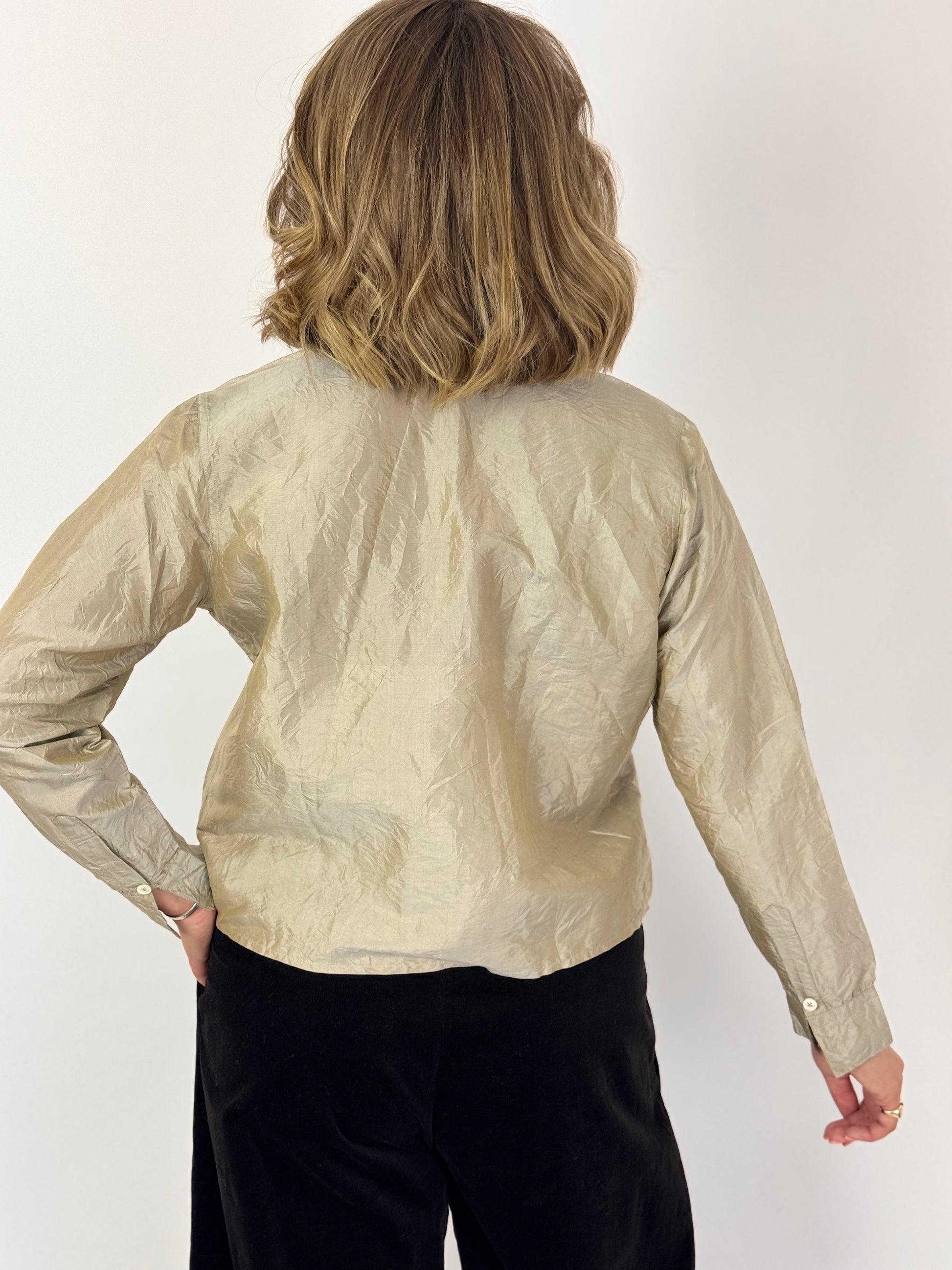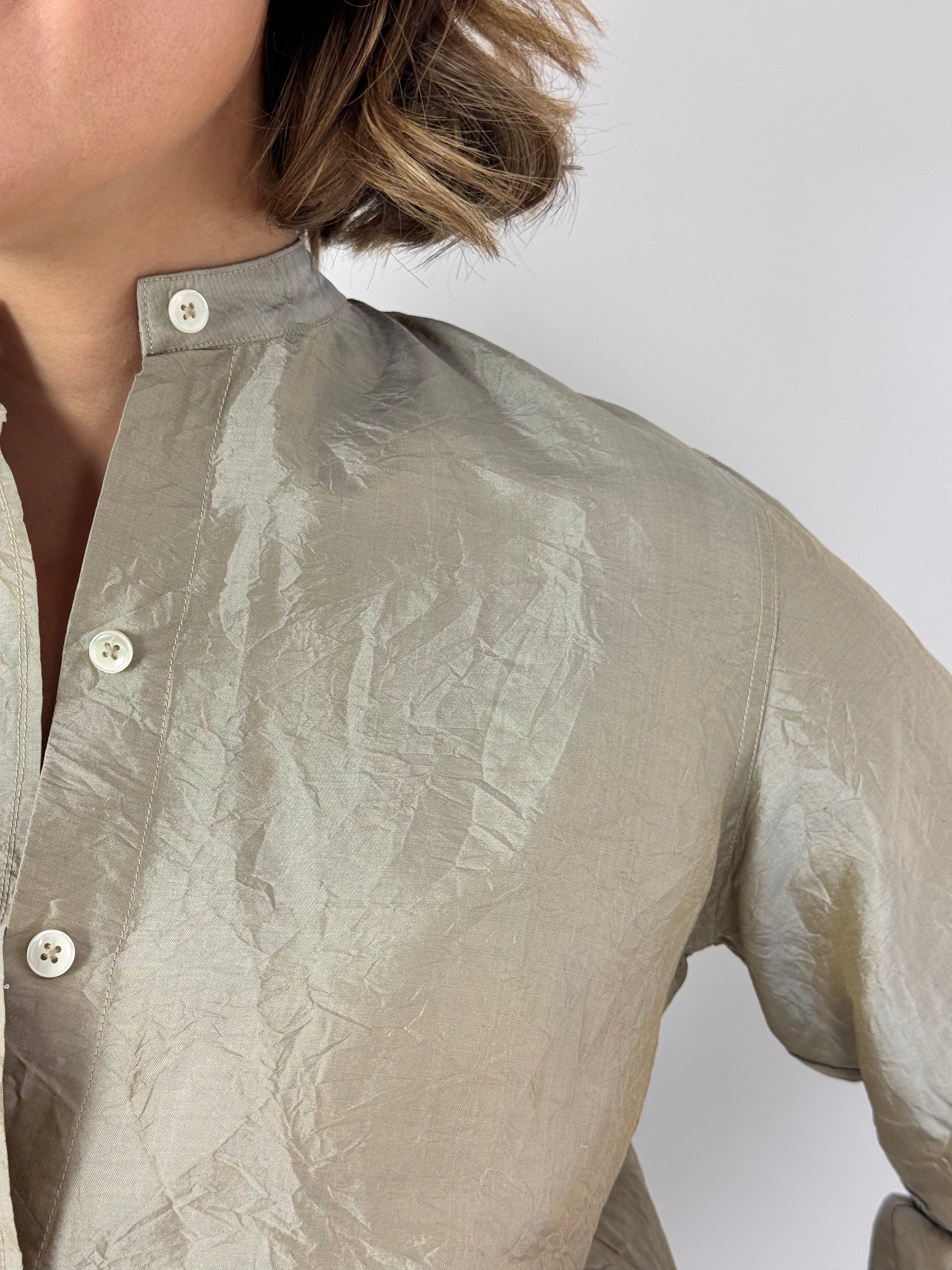 Expertly designed in Japan and crafted in Vietnam, the Christian Peau 05 Blouse in Cay is a refined silk shirt featuring a short, boxy silhouette for a modern fit. Its collarless design and button-front closure add understated elegance, while bracelet-length sleeves offer a versatile, polished look suitable for layering or standalone wear. This blouse combines exceptional craftsmanship with timeless style.