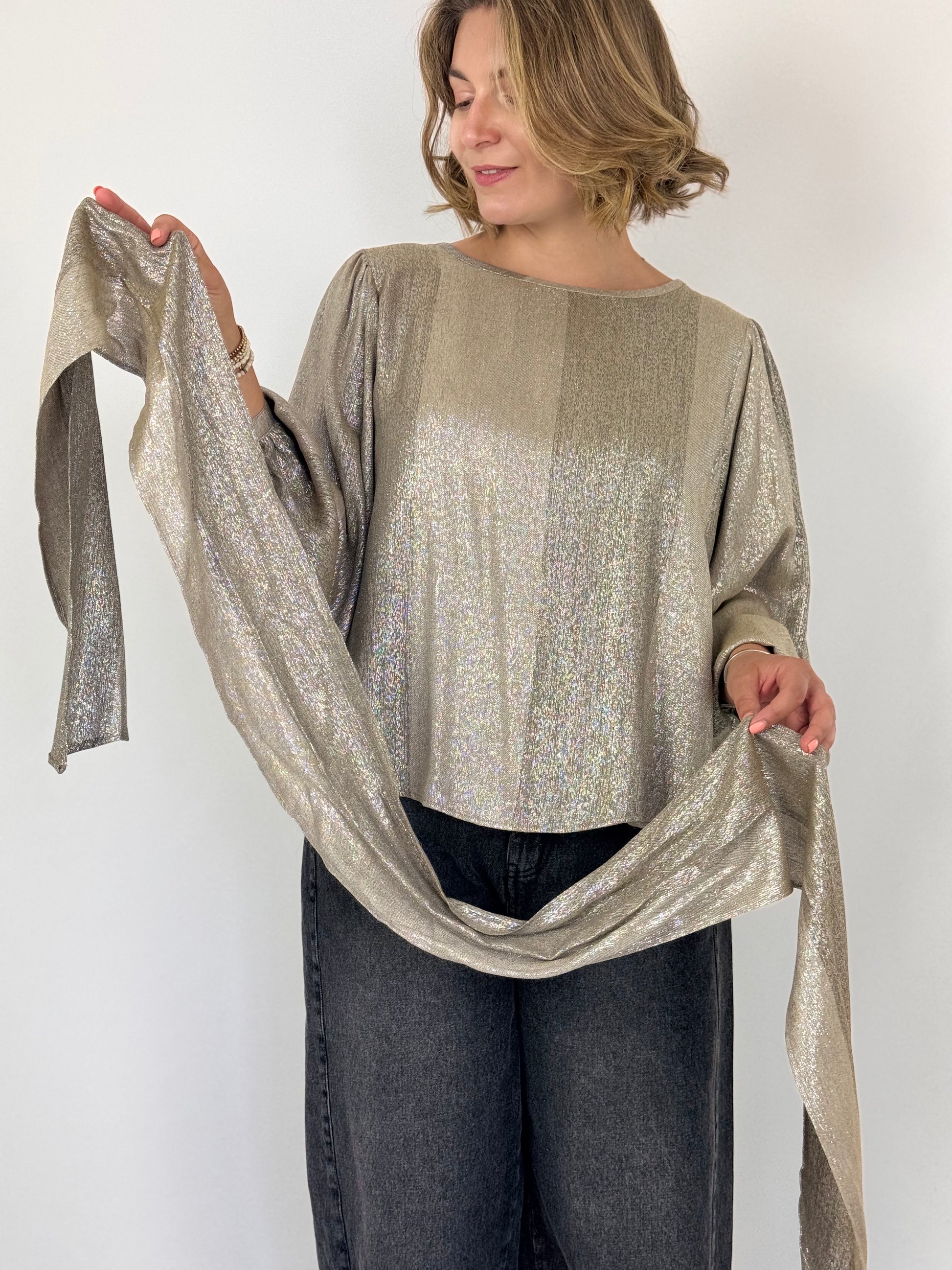 The Diega Tylea Blouse in Gold and Taupe features elegant gold and silver stripes combined with a relaxed loose fit for comfortable wear. Designed with balloon sleeves and a removable neck tie, it offers versatile styling options to suit any party or special occasion. Its sophisticated yet effortless design makes it an essential piece for those seeking both style and flexibility.