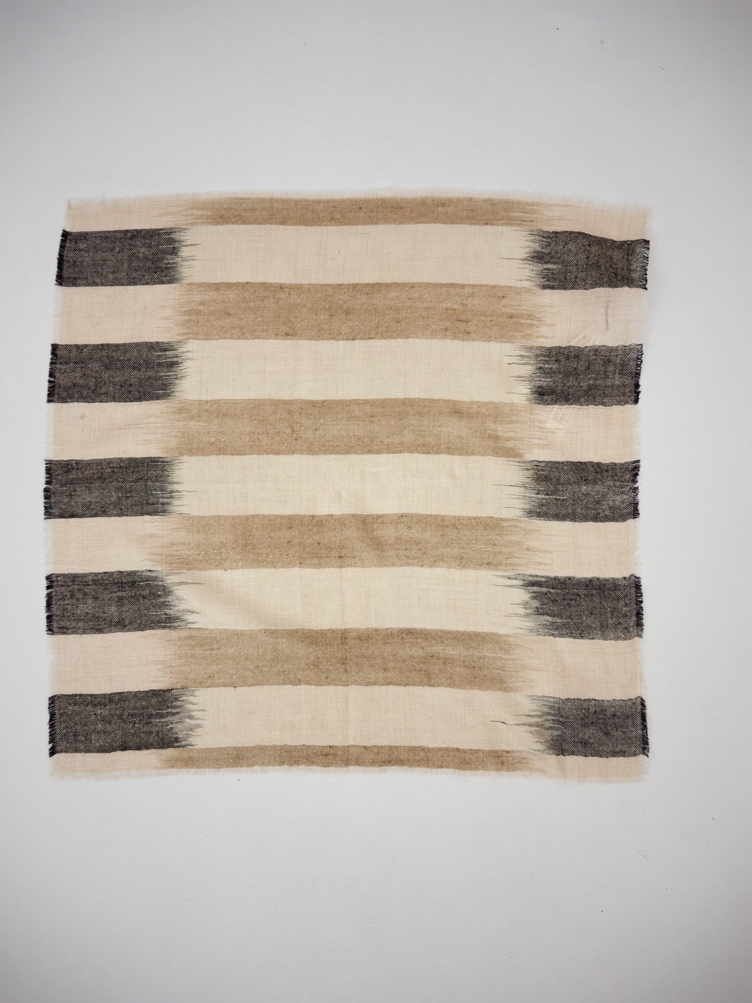 Crafted from luxurious cashmere, this compact square scarf features a refined striped pattern with distinctive raw edges that enhance its contemporary aesthetic. The soft, breathable fabric drapes elegantly around the shoulders or neck, offering versatile styling options for both casual and refined occasions. Perfect for layering or as a standalone accessory, this piece combines timeless sophistication with modern design sensibility.