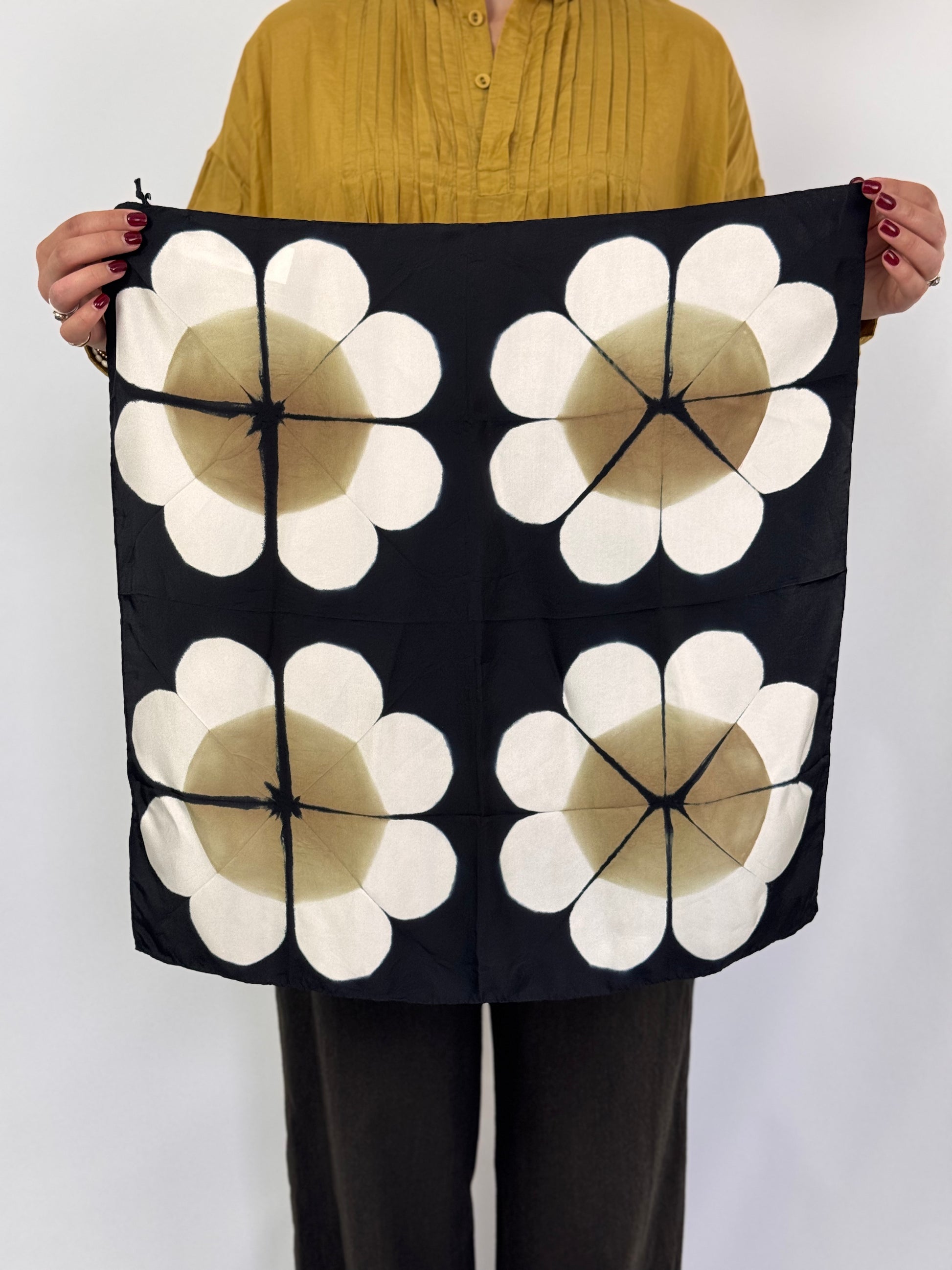 This small square scarf from Denovembre features a luxurious silk fabric hand tie-dyed in rich black and brown tones. Its expert craftsmanship ensures a unique pattern on each piece, offering a sophisticated accessory that elevates any outfit with subtle texture and depth. Perfect for versatile styling, this scarf combines artisanal quality with timeless elegance.