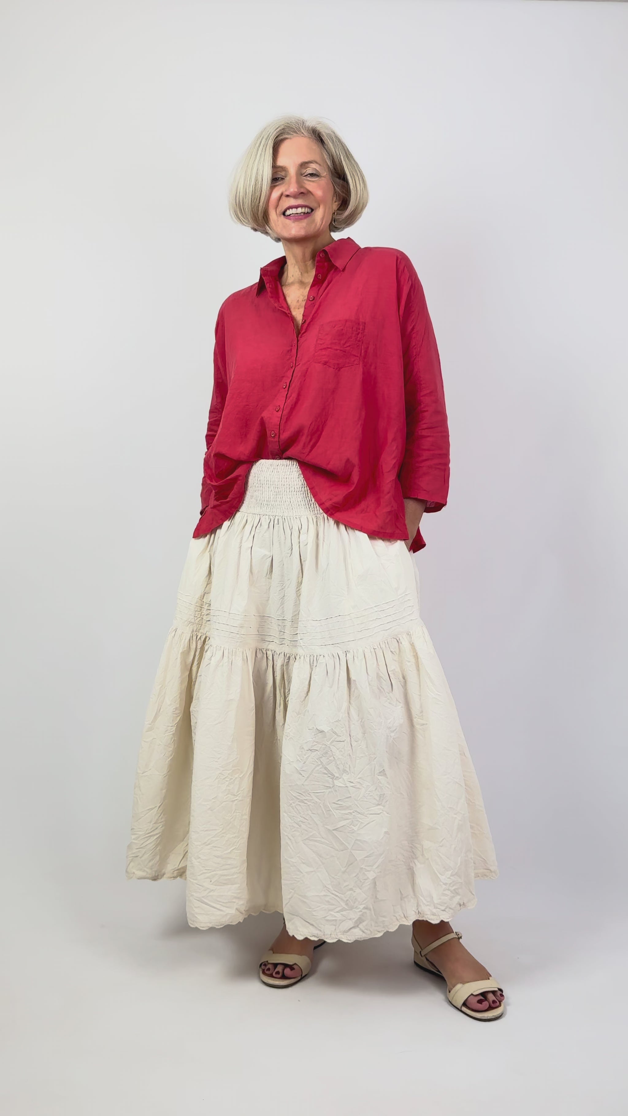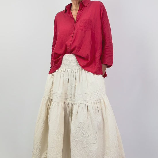 The Ewa i Walla Alvy Skirt combines timeless elegance with practical design. Crafted from crisp cotton, this mid-length piece features a smocked waist that creates flattering volume through intentional creasing, whilst decorative pin tucks add refined texture throughout. The flounced hem is finished with delicate lace detailing for a sophisticated touch. Functional side seam pockets and belt loops complete this versatile wardrobe essential, offering both style and everyday wearability.