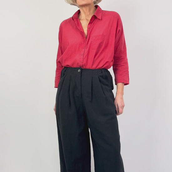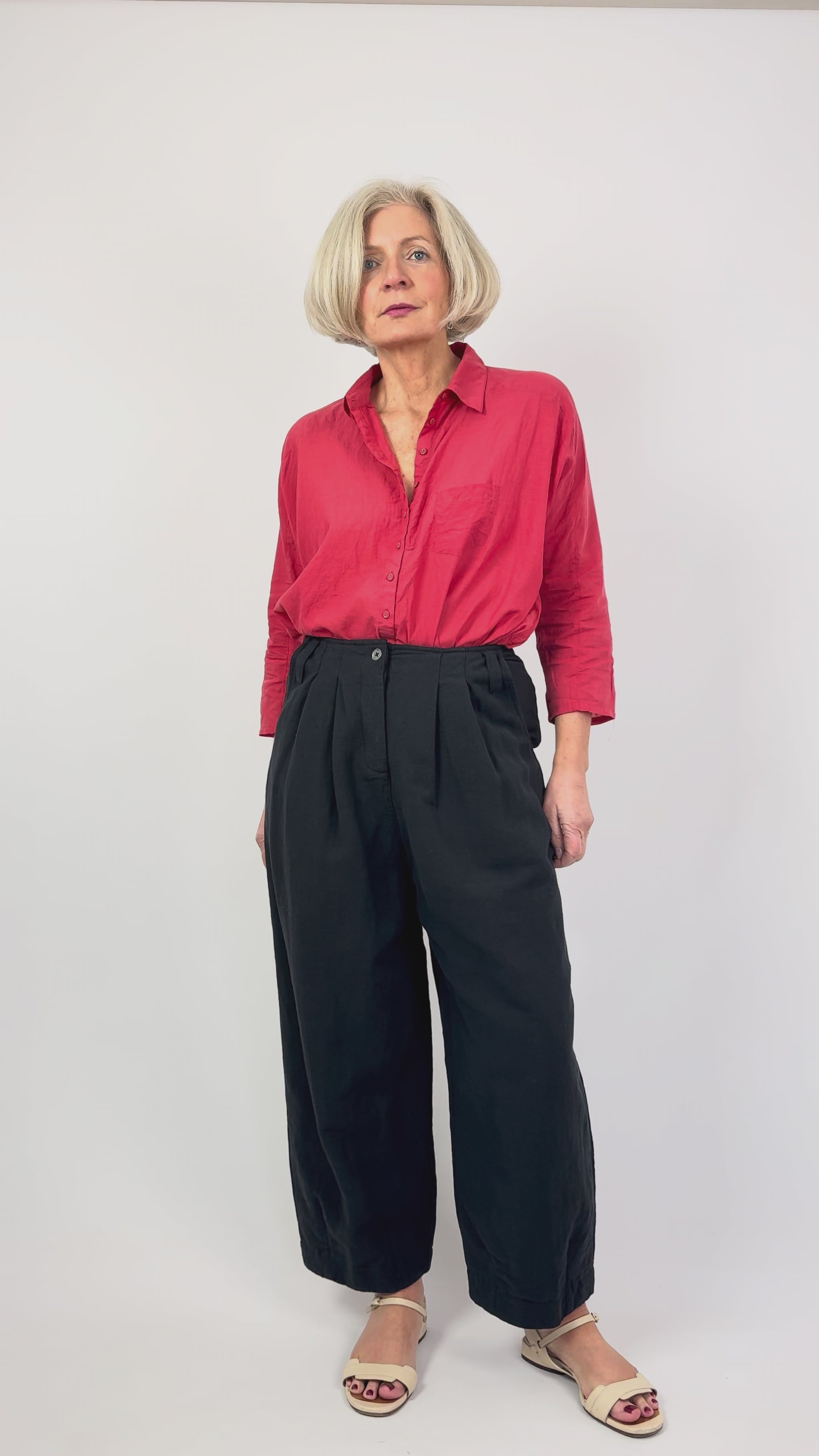 The Ewa i Walla Botvi Trousers feature a distinctive double-layered construction with a structured twill exterior and soft cotton lining, delivering both durability and comfort. Cut with a generous, relaxed silhouette, these trousers showcase tailored detailing including front pleats, functional pockets, and a jetted back pocket for refined styling. The button fly and belt loops complete the classic design, making them a versatile foundation piece for contemporary wardrobes.