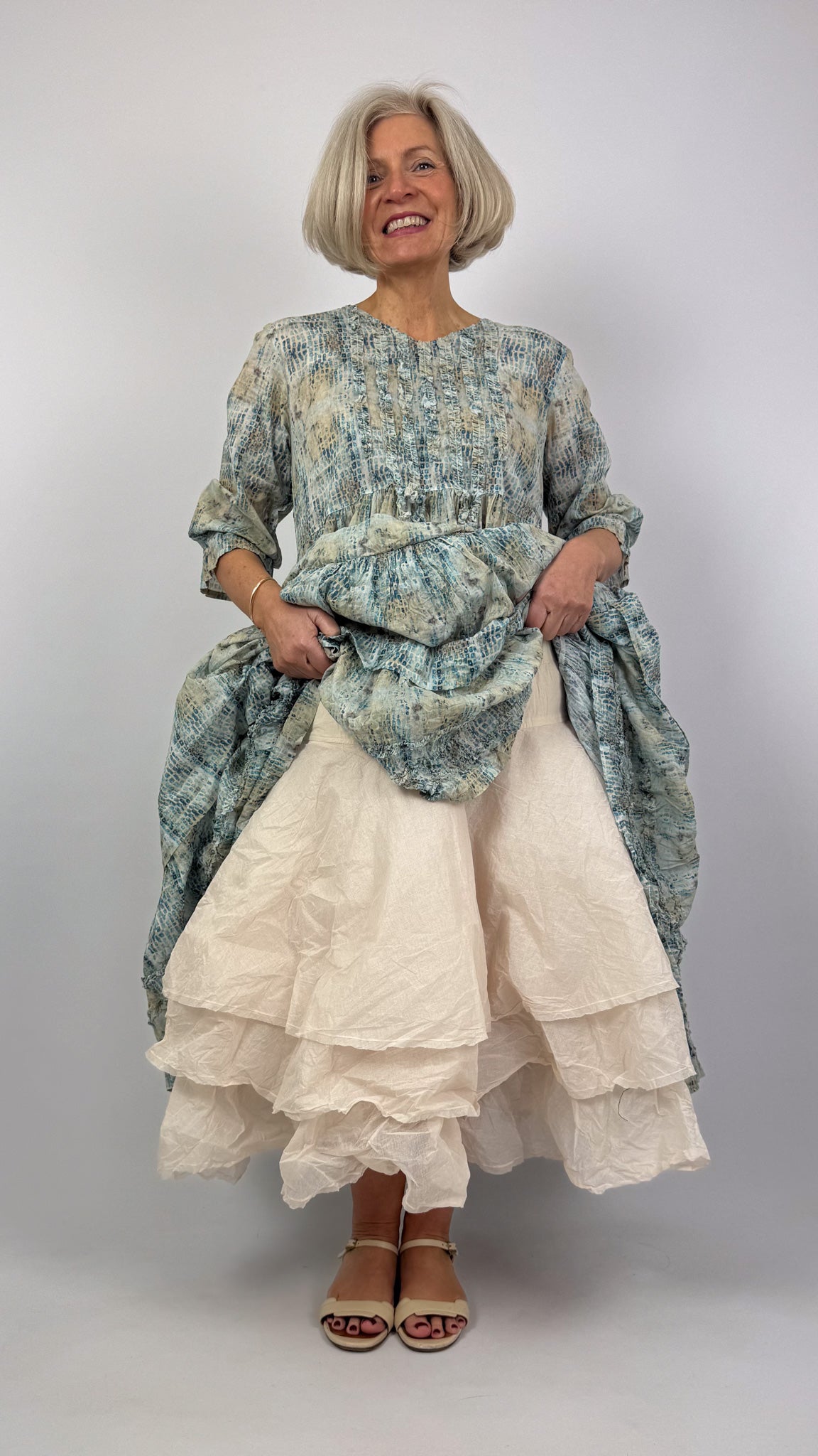 The Wendy Skirt showcases expertly crafted construction with hard voile layering that creates striking volume and movement. This mid-length design features a round cut silhouette with intentional raw edges across three distinct layers, delivering contemporary aesthetic appeal. The dual cotton voile layers provide breathable comfort, whilst the elasticated waist ensures a secure, flattering fit throughout the day. A sophisticated piece that balances architectural design with wearable ease.