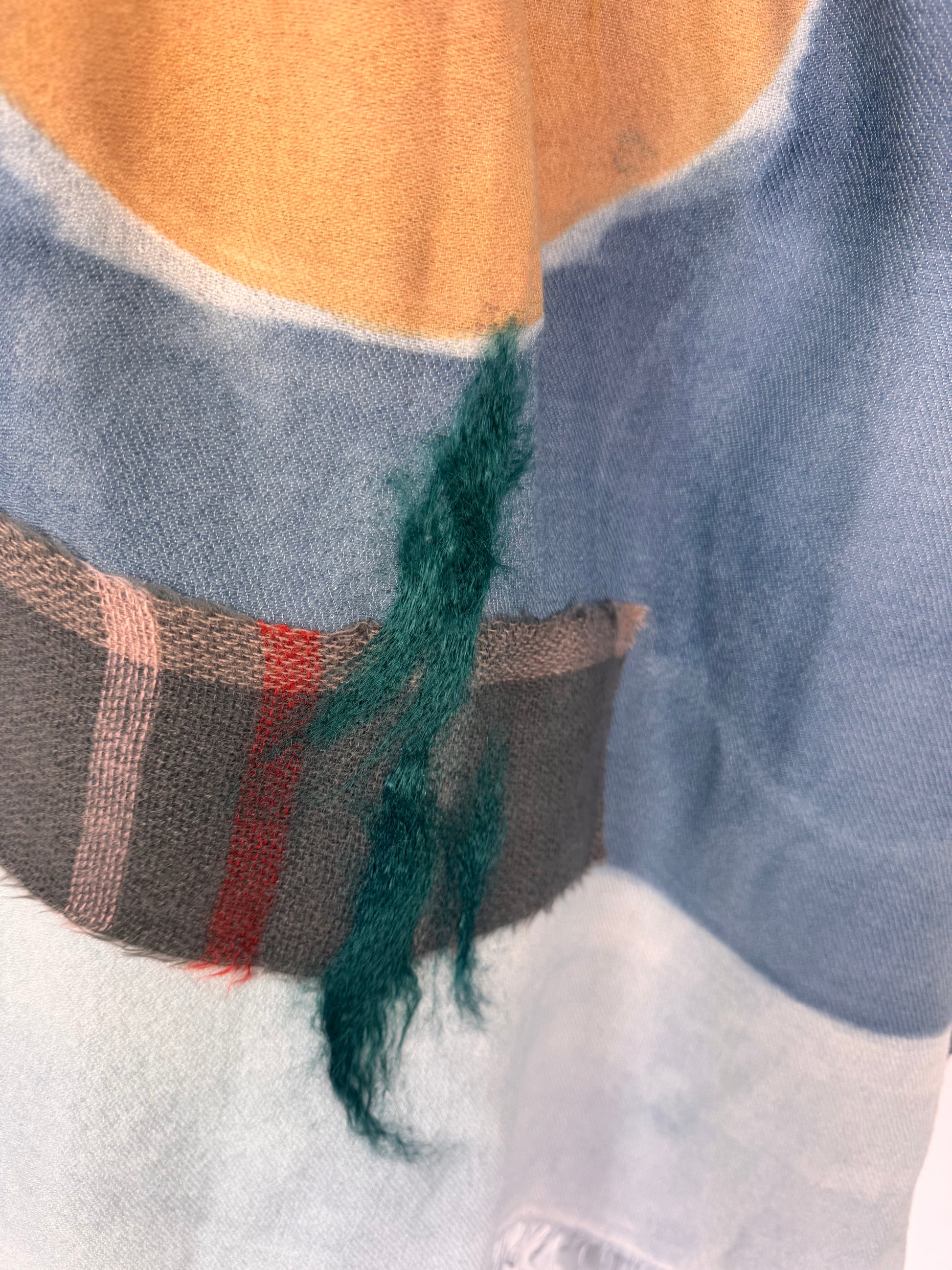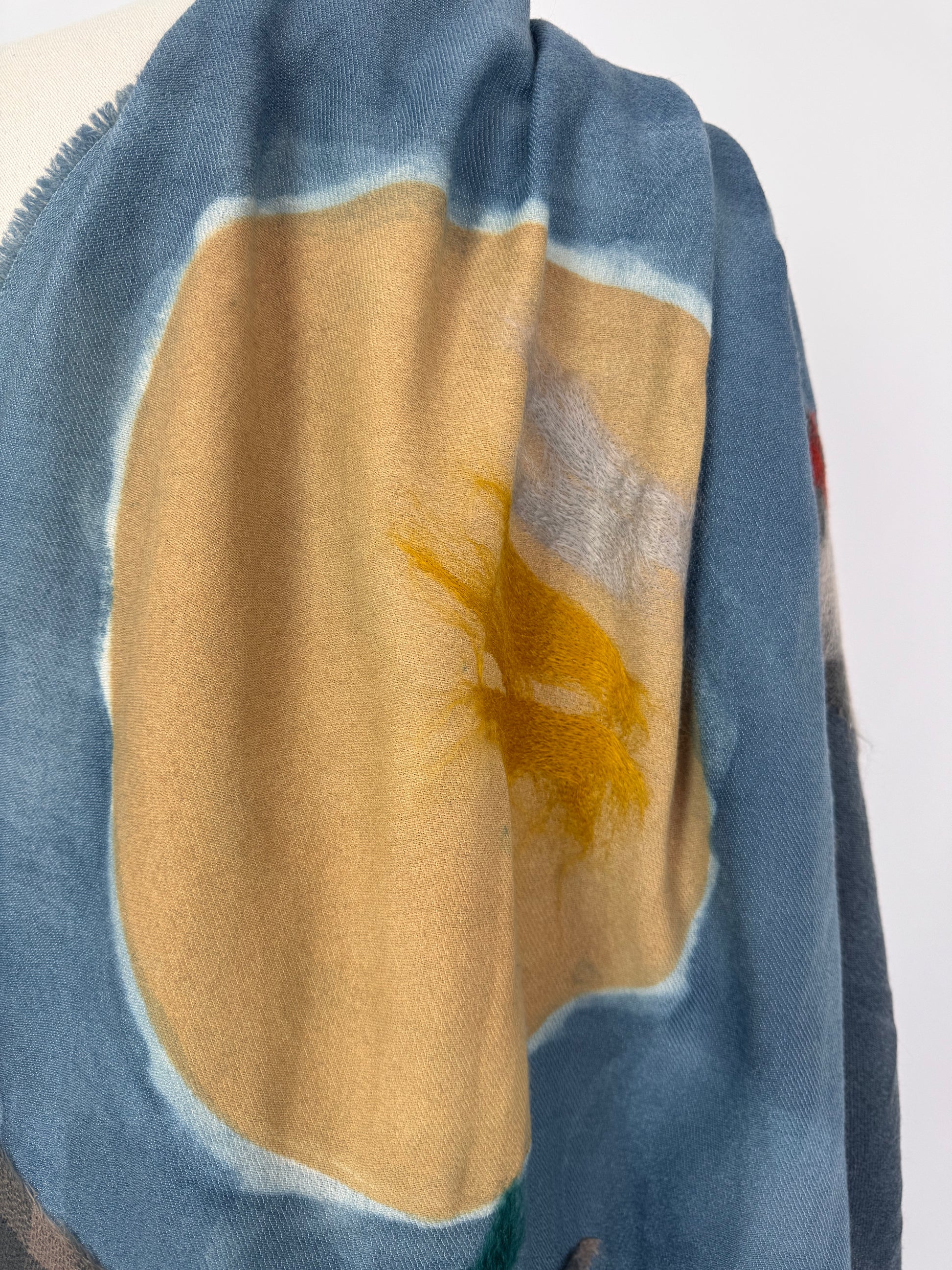 Crafted from premium wool, this substantial scarf showcases hand-painted artistry with intricate felted detailing throughout. The sophisticated palette blends serene blue tones with striking burgundy and orange accents, creating visual depth and movement. A fringed edge adds textural interest and refined finishing. Ideal for layering during cooler months, this piece combines traditional textile techniques with contemporary design sensibility, making it a versatile addition to any wardrobe.