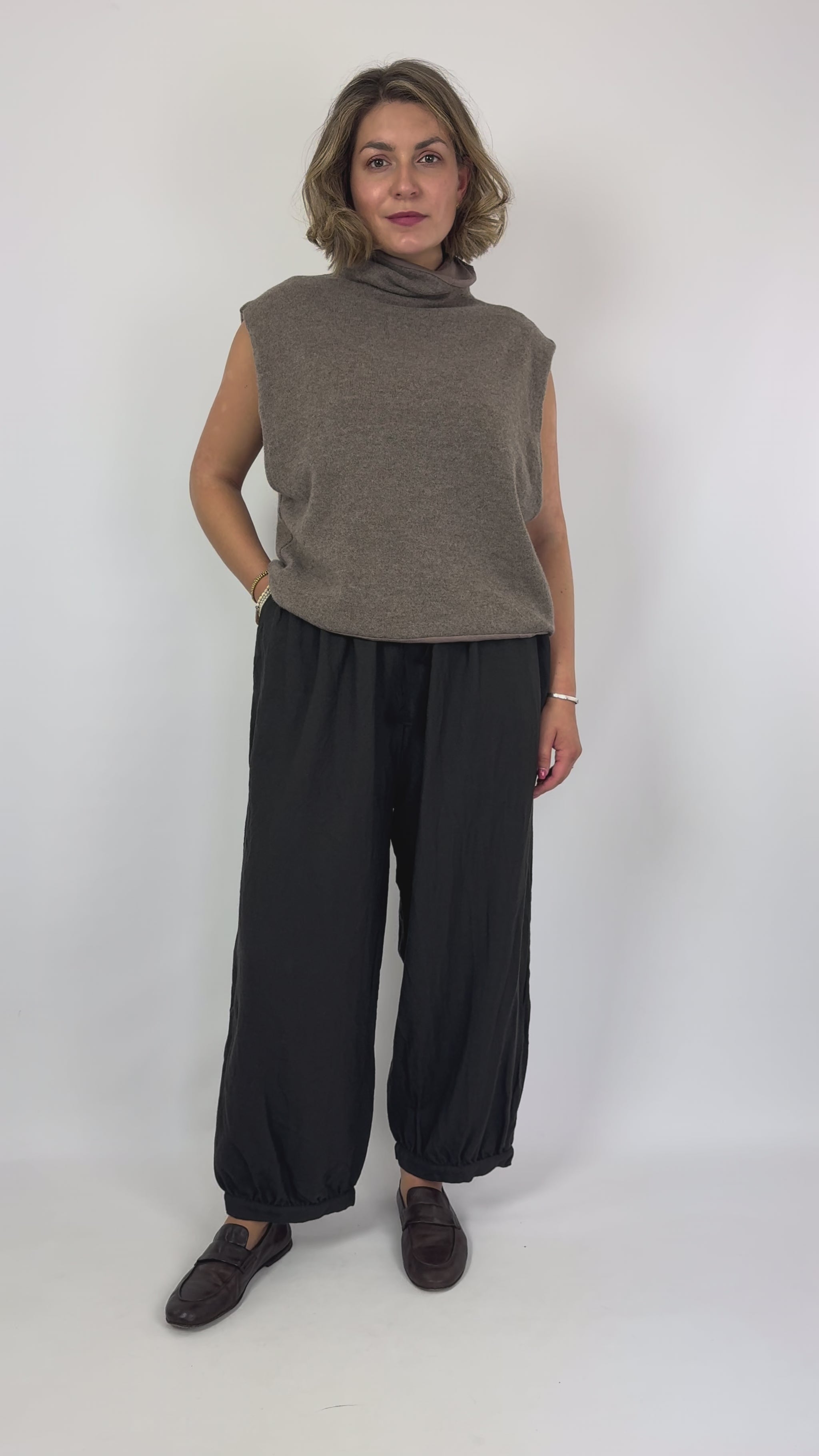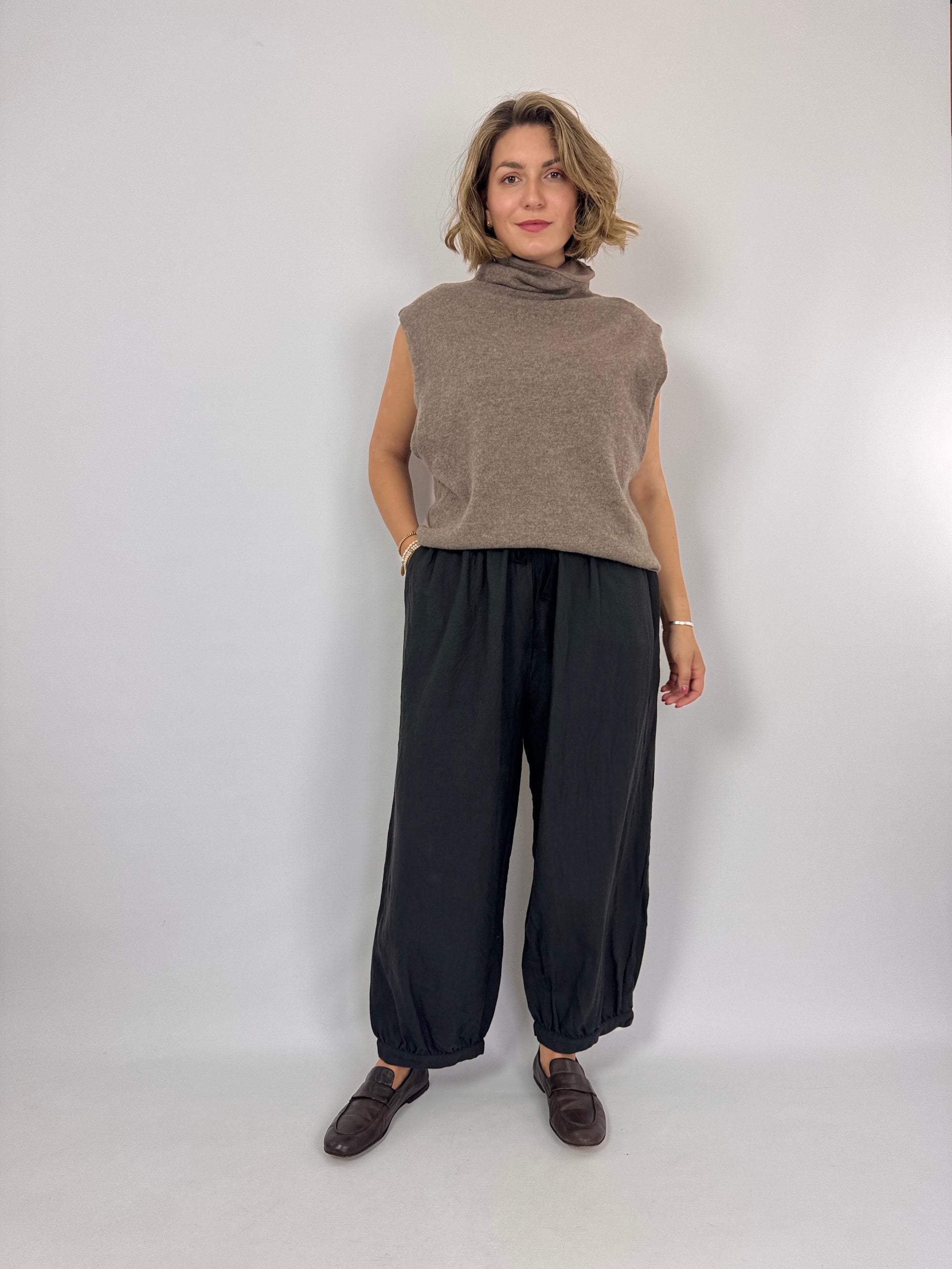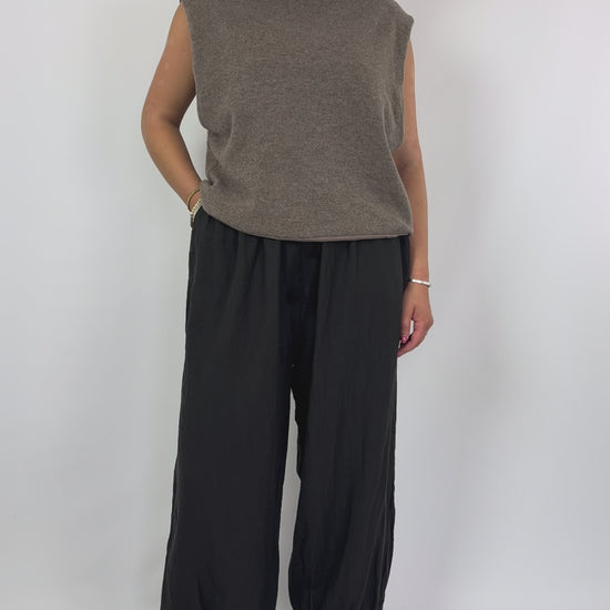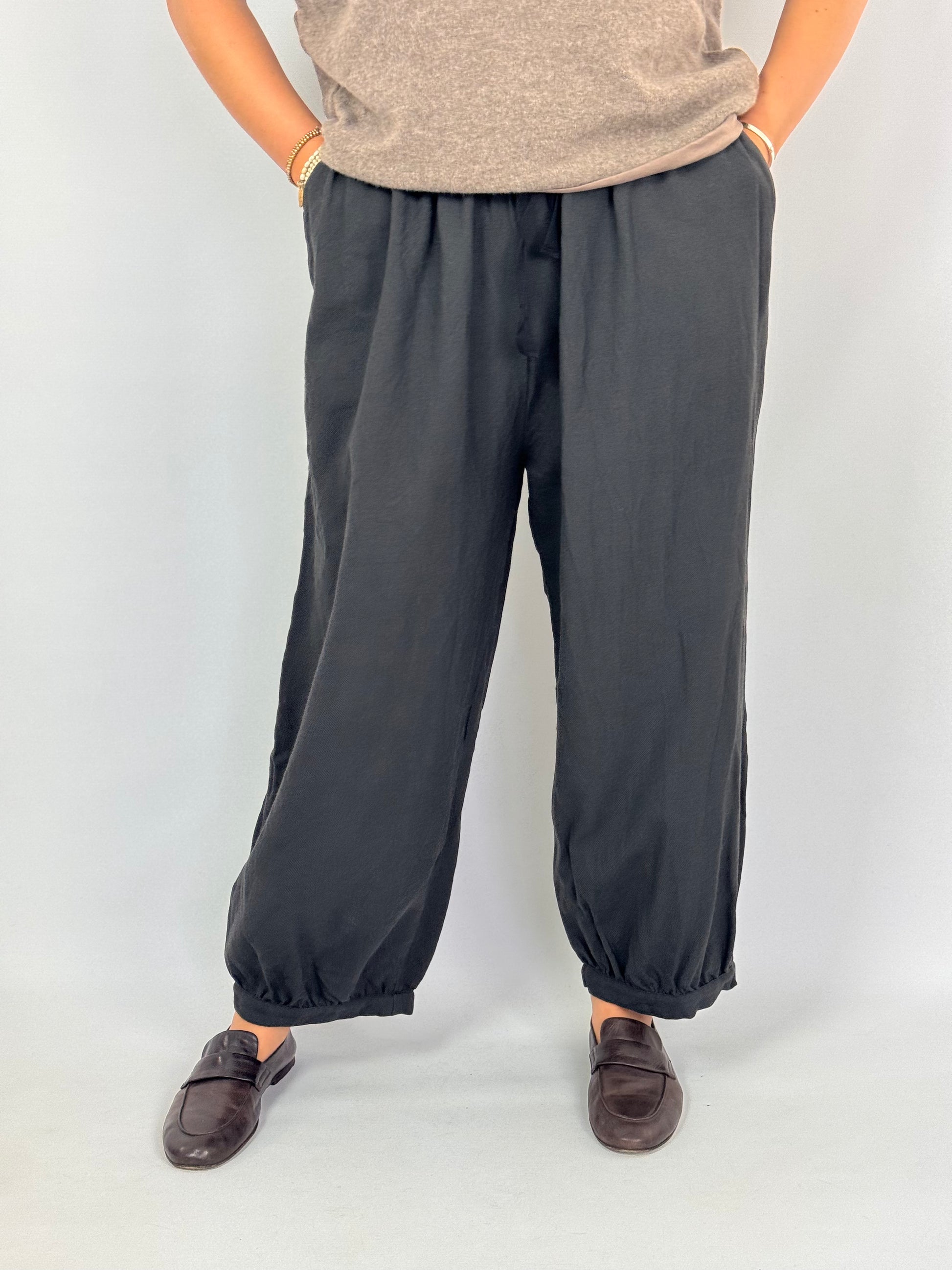 These Elsa Ocelot Trousers in Carbon feature a soft wool fabric that ensures comfort and warmth. Designed with a wide silhouette and an elasticated waist with drawstring, they offer a tailored yet relaxed fit. The trousers curve in at the hemline for a modern finish, while side pockets add practical convenience. Ideal for those seeking both style and functionality in their wardrobe.