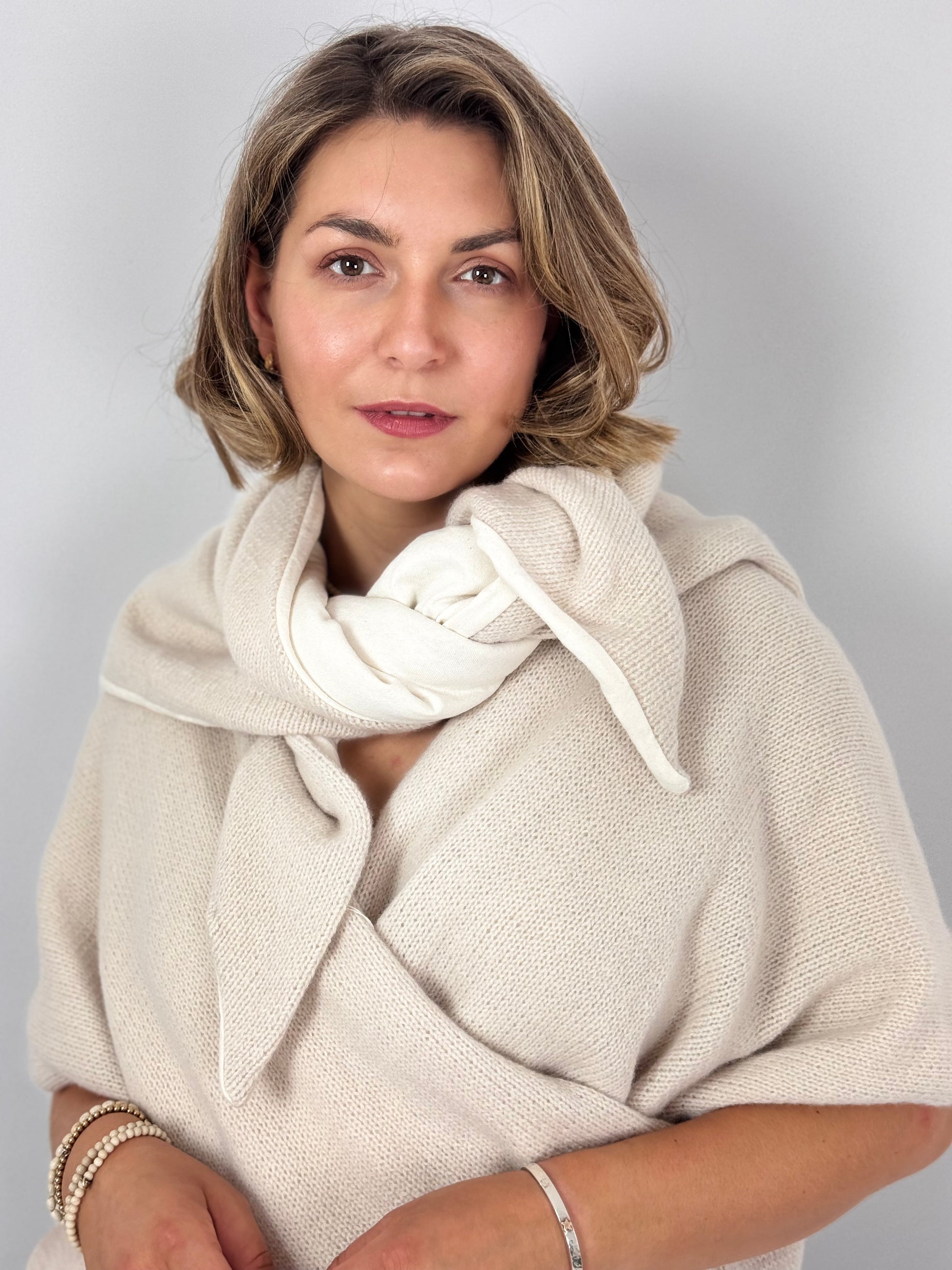 Crafted with a soft wool exterior and lined with organic cotton, the Elsa Esturgie Ouragan Scarf in Ecru offers exceptional comfort and warmth. Its distinctive triangle shape allows versatile styling options, making it both a functional and elegant accessory for cooler seasons. The natural materials ensure breathability and gentle wear against the skin, ideal for those seeking quality and sustainability in their wardrobe.