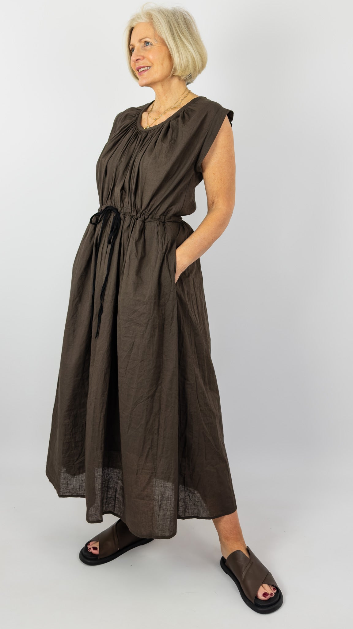 Effortless summer style meets comfort in this cotton and linen blend dress. The gathered round neckline and sleeveless cut keep you cool, while the waistline features an adjustable drawstring to create your perfect silhouette. Crafted from cotton and linen, this versatile piece transitions seamlessly from casual days to warm-weather gatherings.