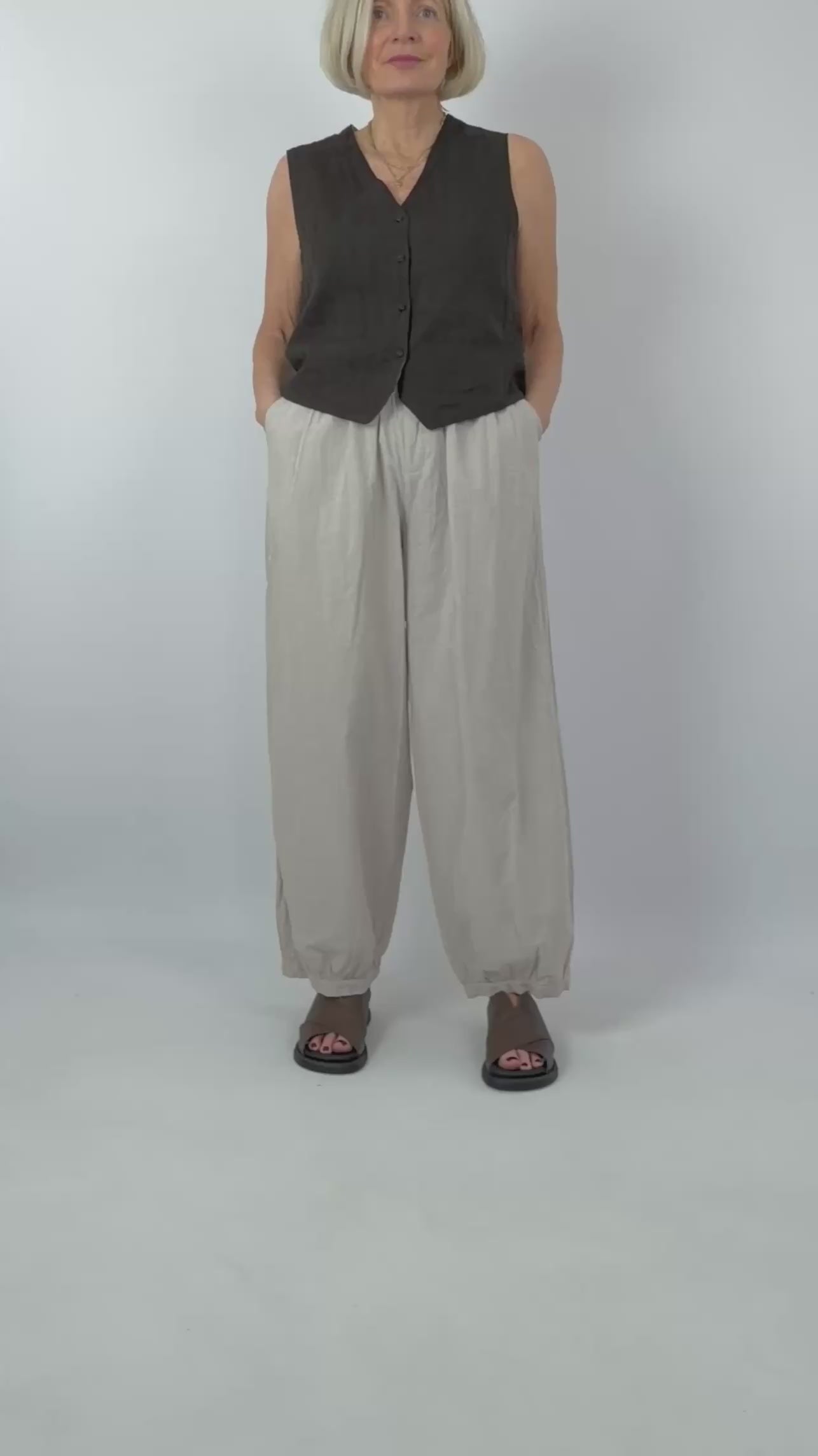 Crafted from organic cotton with a distinctive crinkled texture, these Elsa Esturgie trousers offer effortless style and comfort. The elasticated waistline provides a relaxed fit, while side pockets add practical functionality. Featuring a loose, straight silhouette that gathers gently at the hem, they're finished with a natural pinstripe print for understated sophistication. Perfect for layering or wearing solo, these versatile trousers transition seamlessly from day to evening.