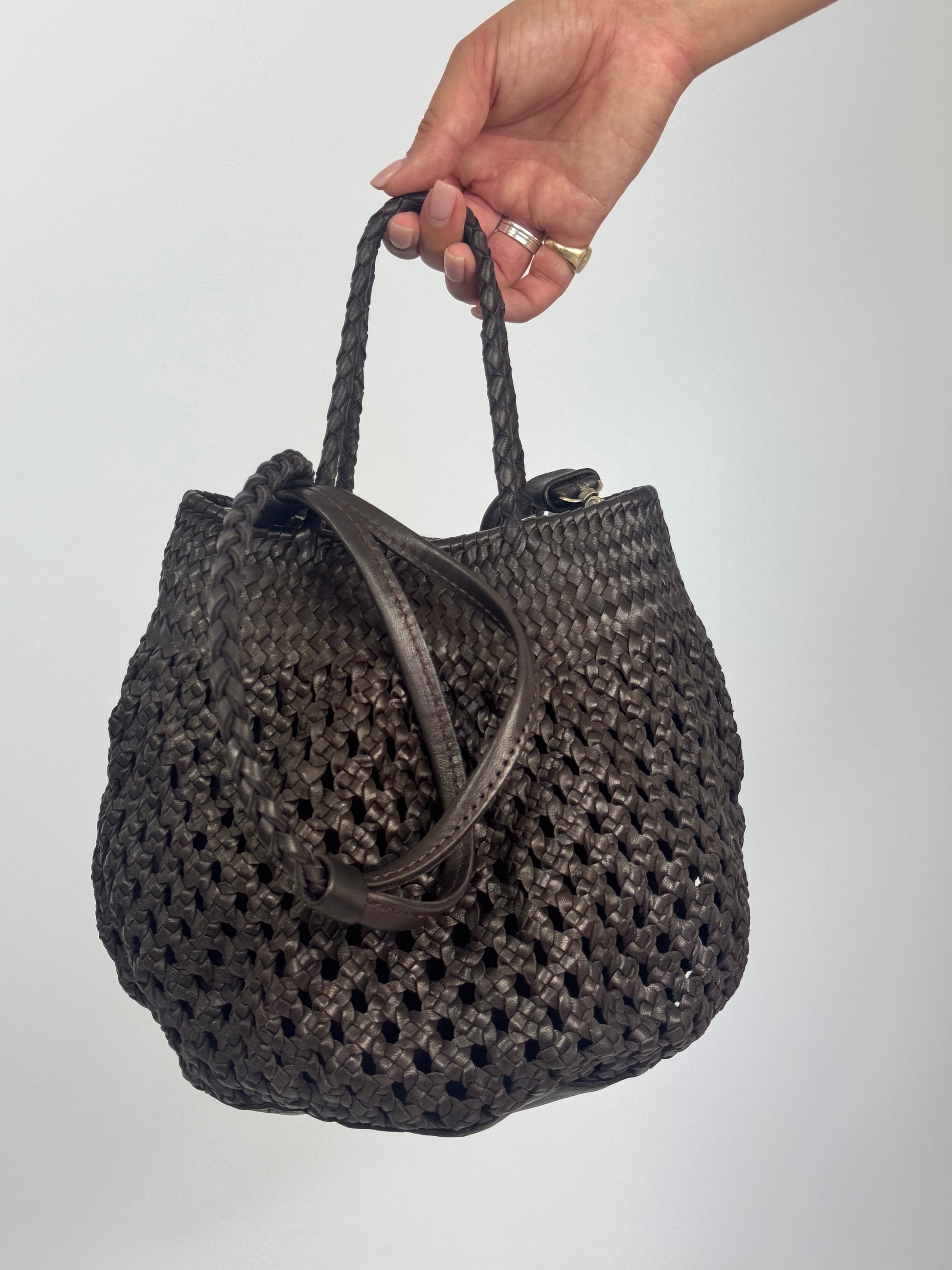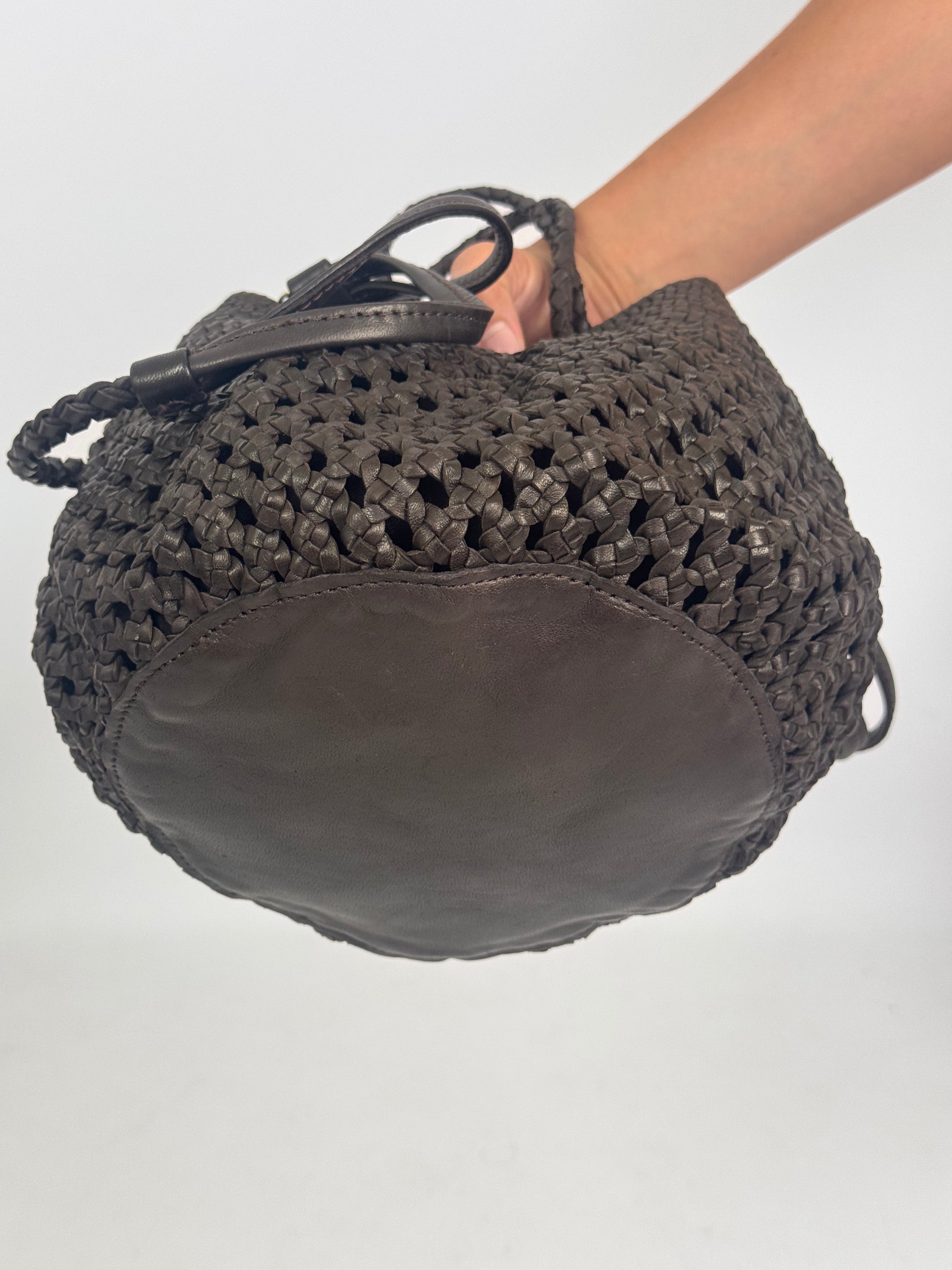 The Enshalla 47L16 Bag Chocolate showcases a masterful woven leather design that begins at the base, reflecting a blend of North African artistry and modern aesthetics.