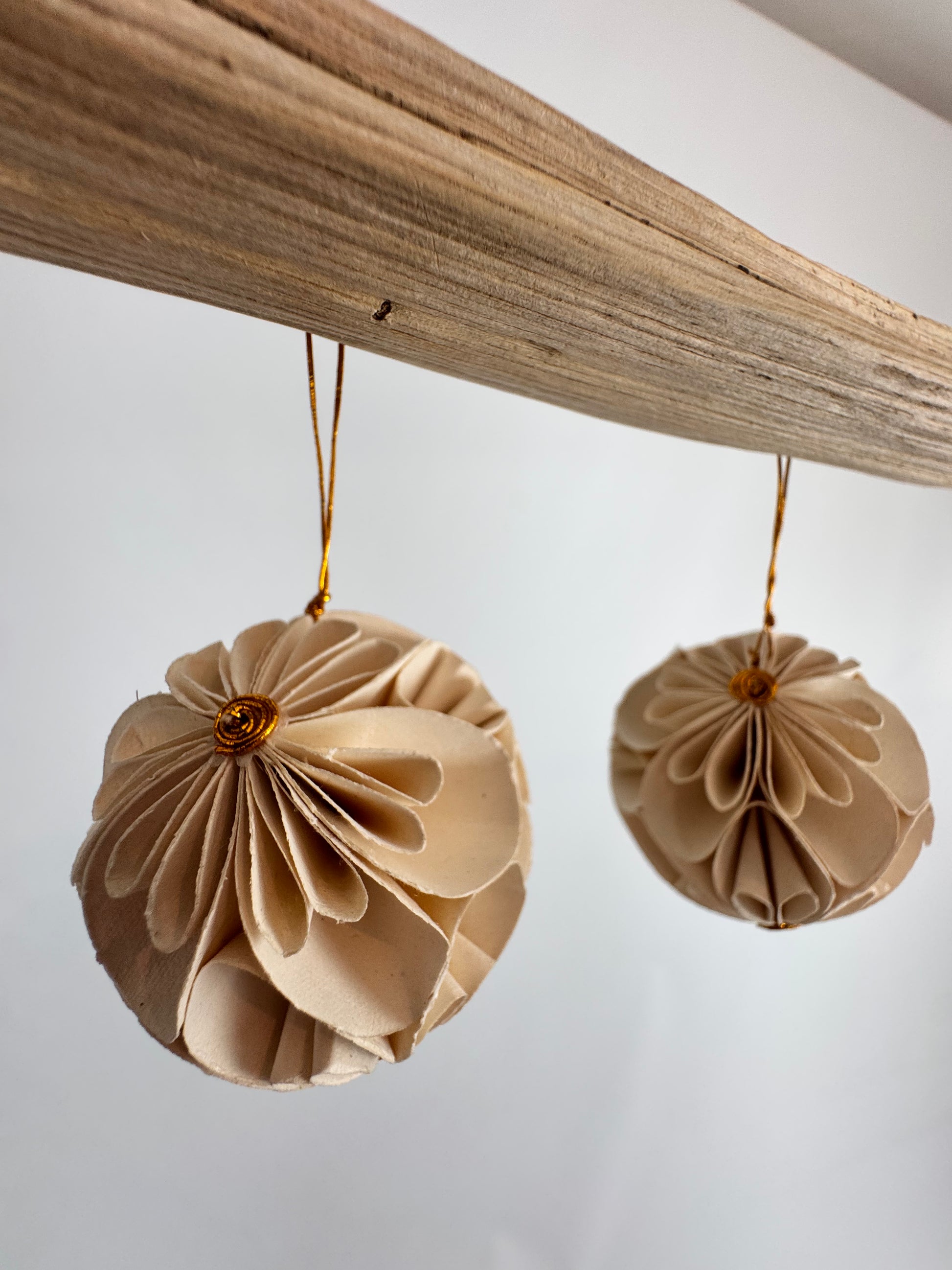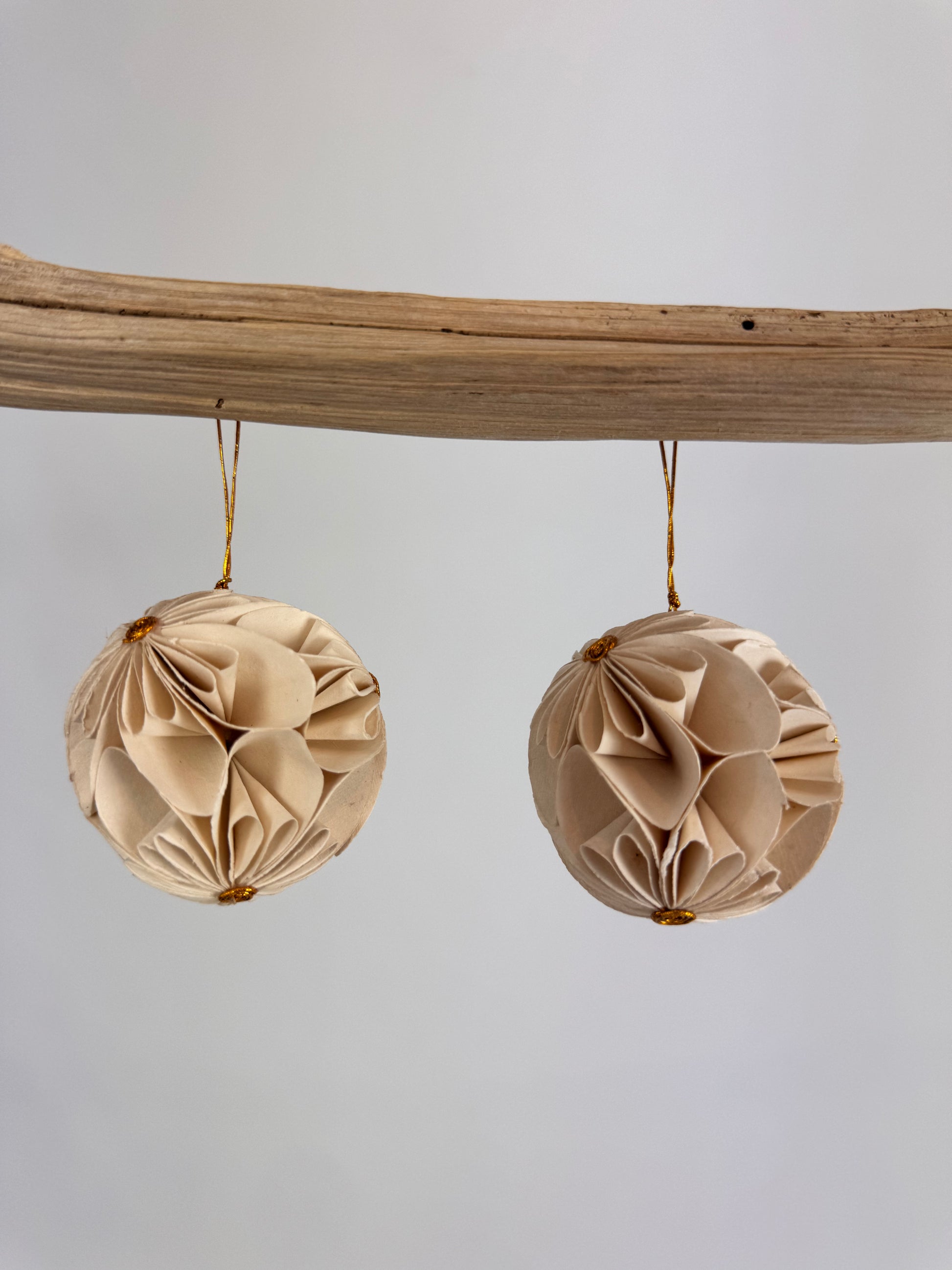 This exquisite set of two flower ball decorations showcases intricate quilling craftsmanship, hand-formed from cotton paper. Each 5.5x5.5 cm piece highlights delicate detailing, presented in a tastefully patterned paper box. Ethically produced in Bangladesh, these decorations support vital employment opportunities for rural women through fair-trade paper manufacturing. Ideal for adding refined, artisanal charm to any setting while endorsing sustainable, community-driven craft.