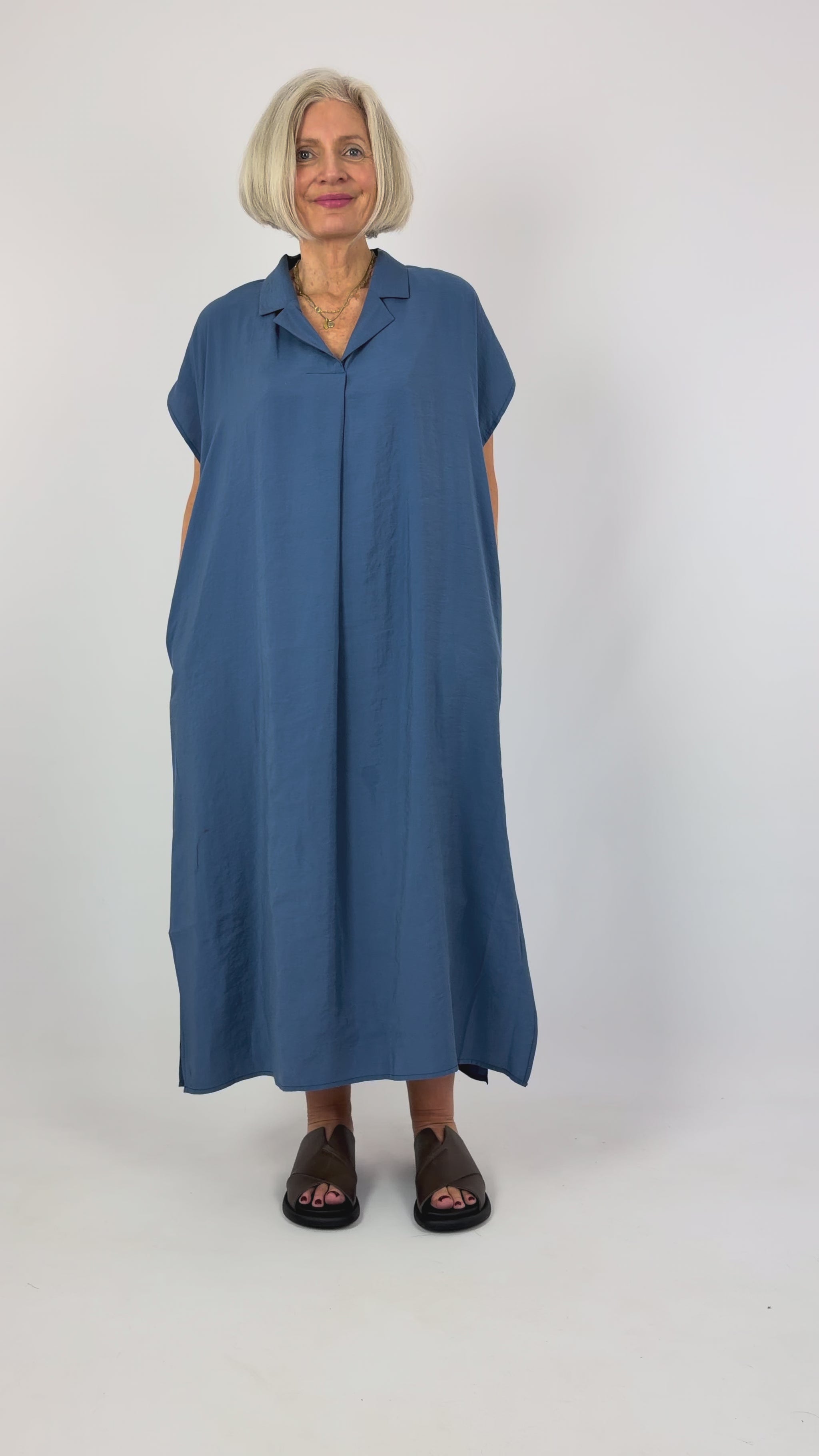 Effortlessly chic and supremely comfortable, this loose-fitting summer dress combines relaxed elegance with practical design. The flowing silhouette drapes beautifully without clinging, while short sleeves and a flattering V-neckline with collar detail keep you cool and polished. Functional side pockets add everyday convenience. Perfect for warm-weather dressing when you want style without compromise.